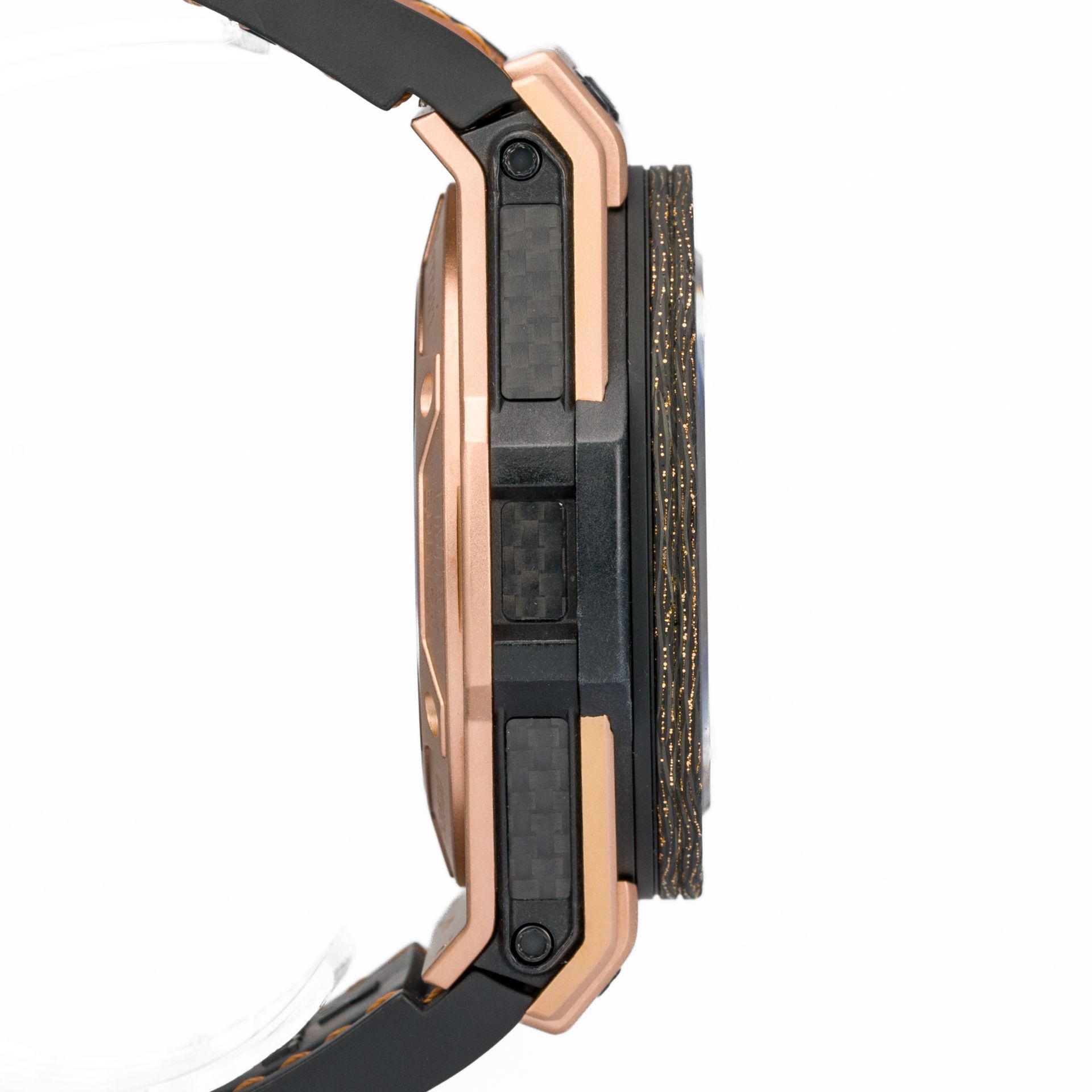 La lunetta è in carbonio, e ciò che è interessante in questo caso è che è realizzata con fili d'oro. È fissa e assicurata alla cassa con le sei proverbiali viti del marchio. Il quadrante è scheletrato, con lancette semi-scheletrate in oro luminescenti e indici delle ore applicati, anch'essi luminescenti, che rendono molto facile la lettura delle indicazioni anche in assenza di luce. I marker dei minuti si trovano sulla sottolunetta attorno al bordo esterno del quadrante, e la finestra della data è alle 3. L'orologio presenta un vetro zaffiro resistente ai graffi con doppio trattamento antiriflesso, una corona a vite, un fondello trasparente e resistenza all'acqua di 100 m. Il diametro della cassa è di 45 mm senza la corona, lo spessore è di 16 mm e la larghezza del cinturino ai passanti è di 26 mm.