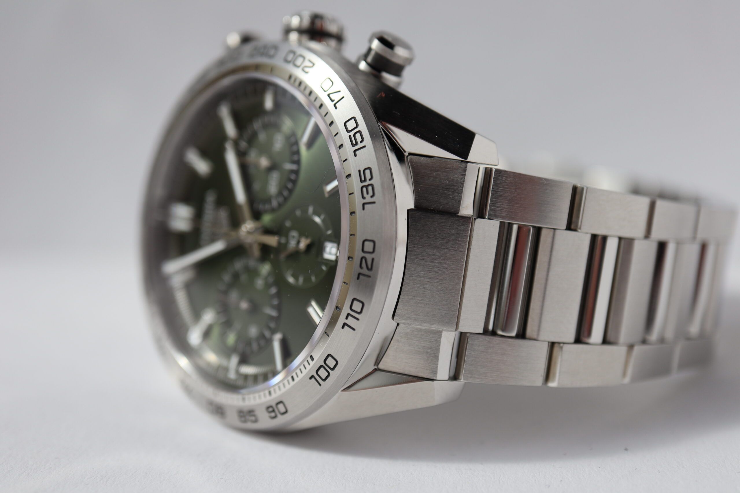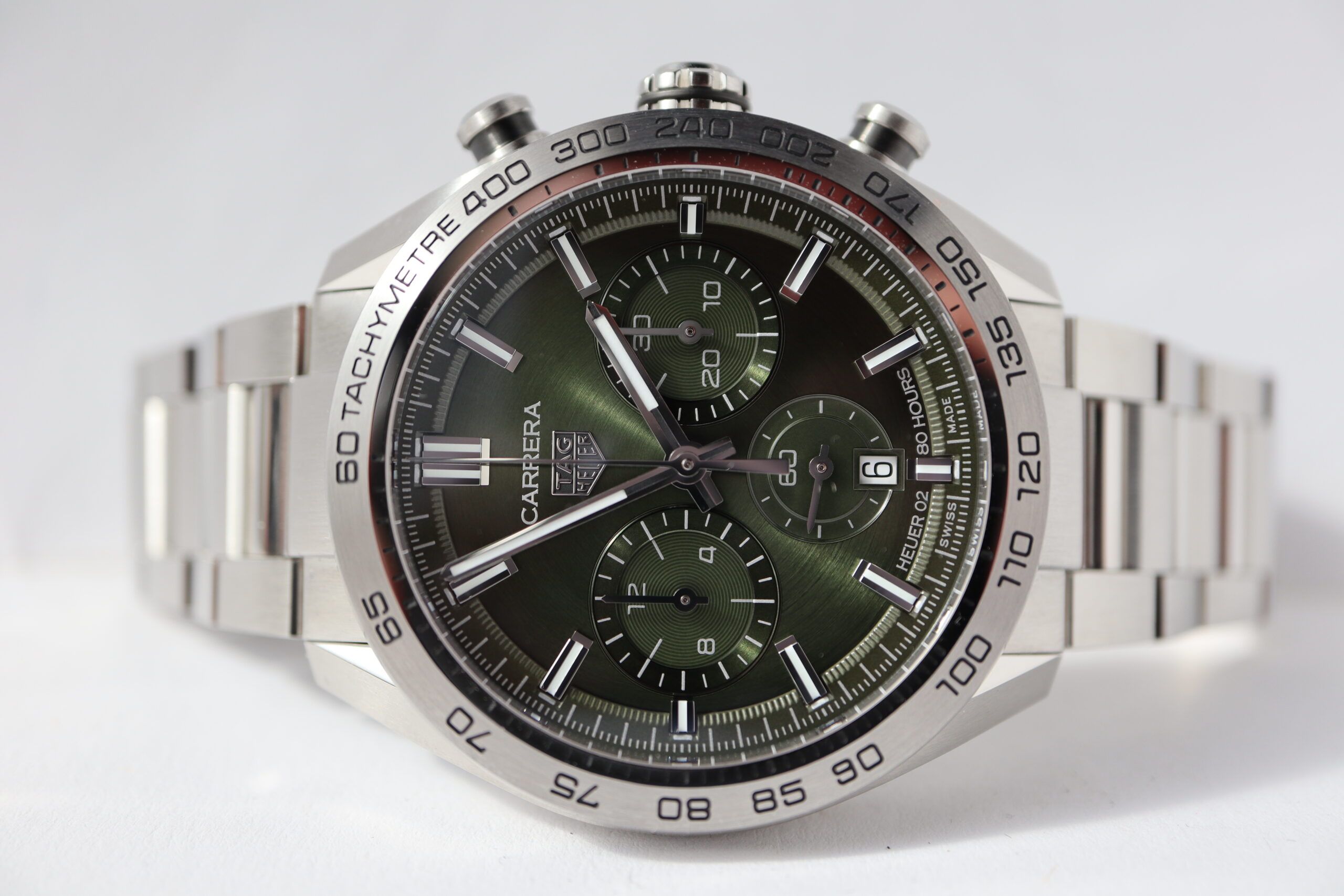 A TAG Heuer Carrera chronograph with all the prestige of its motor-racing heritage. With 44-mm fine-brushed and polished steel case, our manufacture Heuer 02 automatic movement and trendy green brushed dial, punctuated with a second indicator and two green chronograph counters, makes for unbeatable functional style.Silvery-white central hand, indexes and hour and minute hands with white Super-LumiNova® ensure perfect visibility in all conditions.