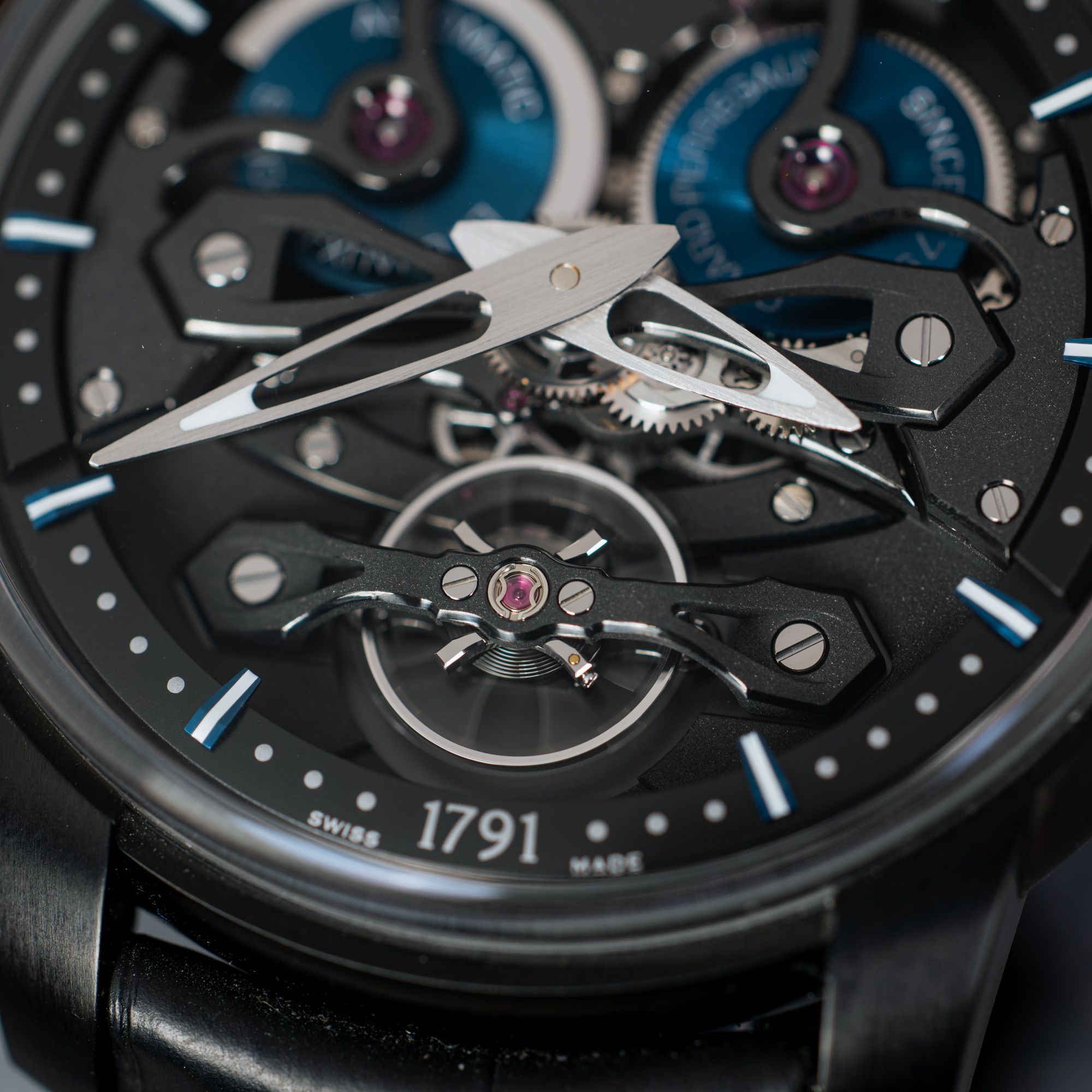Il quadrante scheletrato mette in mostra il layout del ponte caratteristico ispirato agli orologi da tasca del XIX secolo, reinterpretato in modo altamente moderno. Il layout è perfettamente simmetrico: un micro-rotore posizionato a ore 10 garantisce un'avvolgimento efficiente, mentre il bilanciere esposto a ore 6 attira l'attenzione e mette in evidenza la bellezza meccanica dell'orologio.