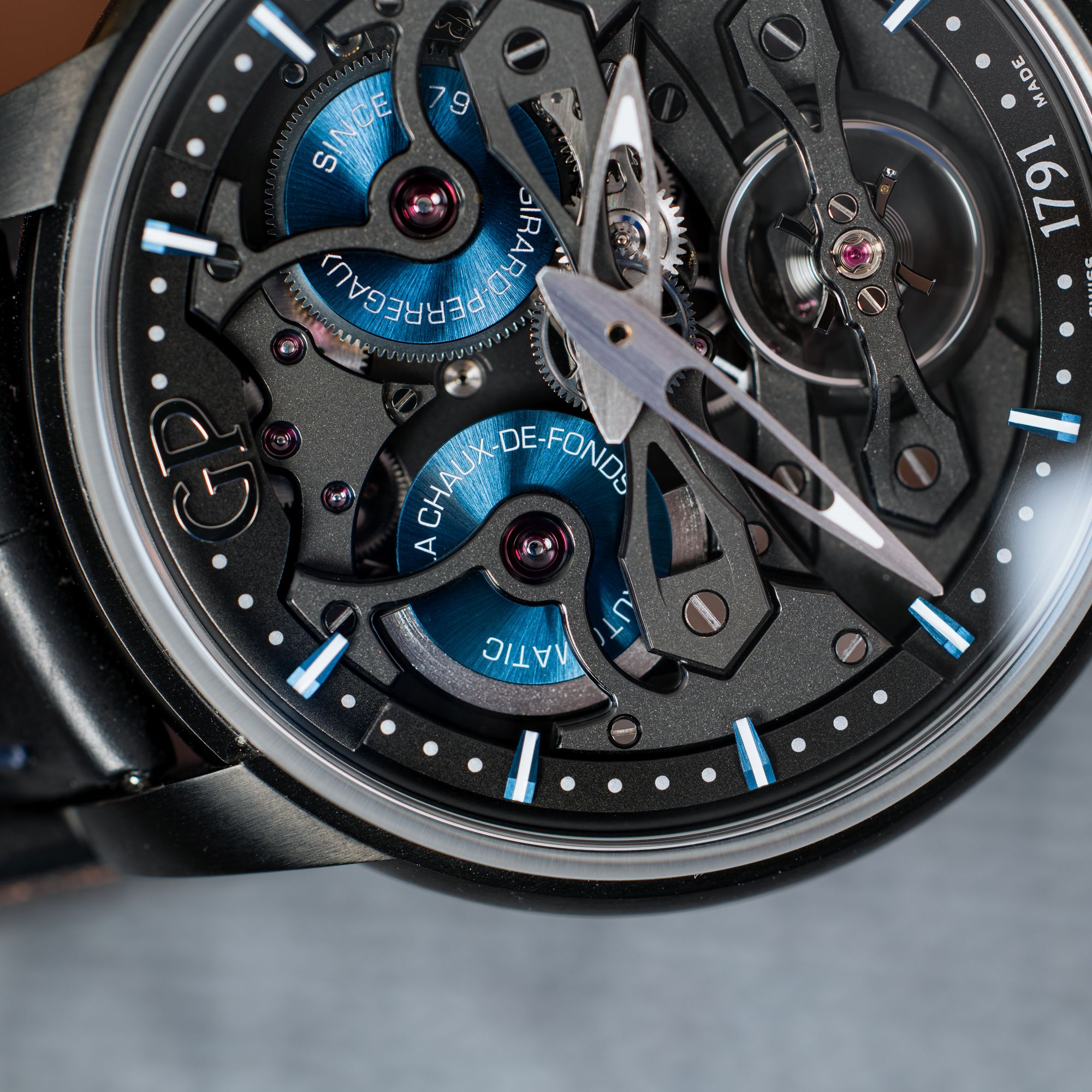 The Neo Bridges perfectly embodies the DNA of Girard-Perregaux — here, the movement is not hidden but becomes the central design element. This architecture makes the watch instantly recognizable and truly unique. It is a bold reinterpretation of the brand’s iconic bridges in a modern, futuristic form.The 45 mm case is crafted from lightweight and durable titanium, finished with a black PVD coating. The satin-brushed surfaces enhance its technical and contemporary character. A domed sapphire crystal provides a clear and immersive view of the movement.