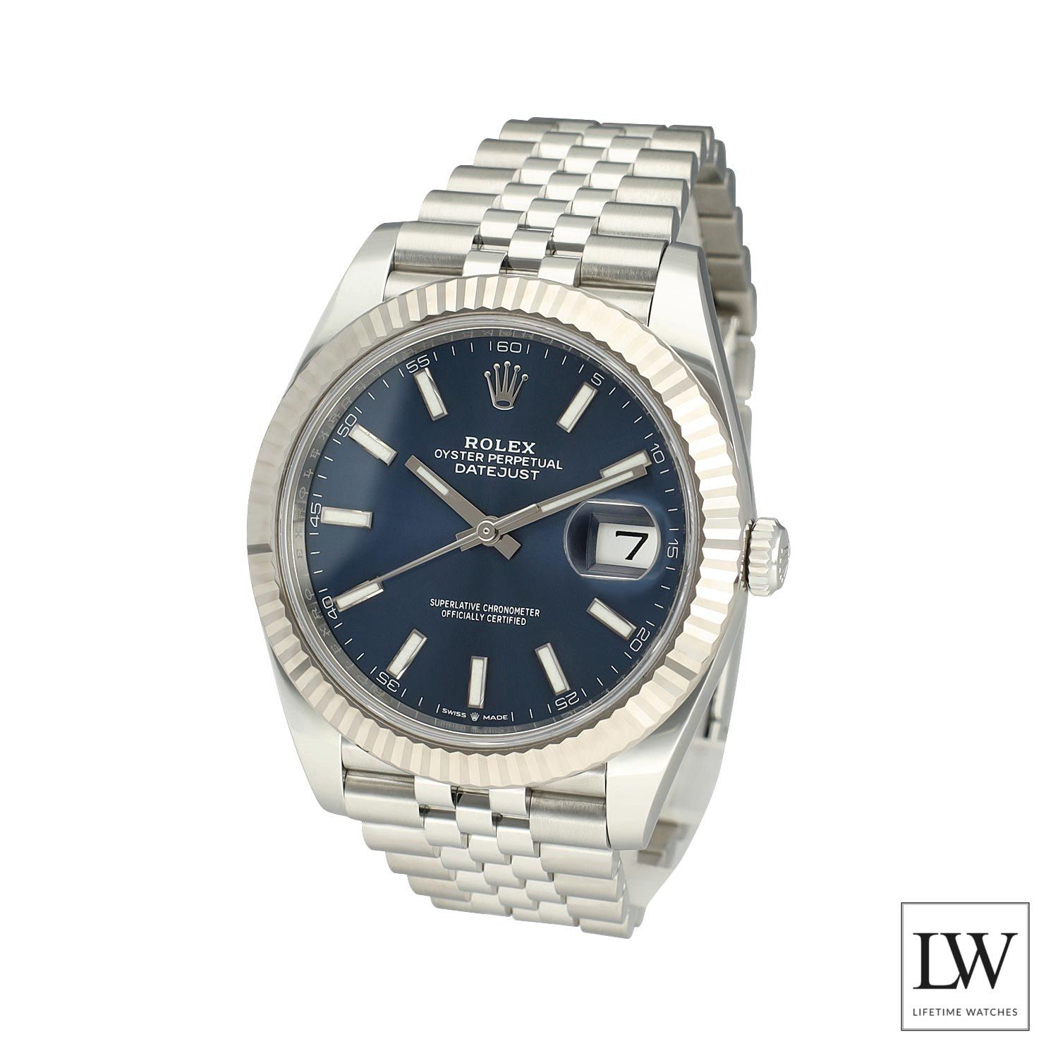 The 41 mm Oystersteel case is complemented by an 18-carat white gold fluted bezel and fitted with the iconic Jubilee bracelet, delivering exceptional comfort and classic Datejust elegance. Powered by the automatic Rolex caliber 3235, it offers outstanding precision, a quickset date function, and an impressive 70-hour power reserve.