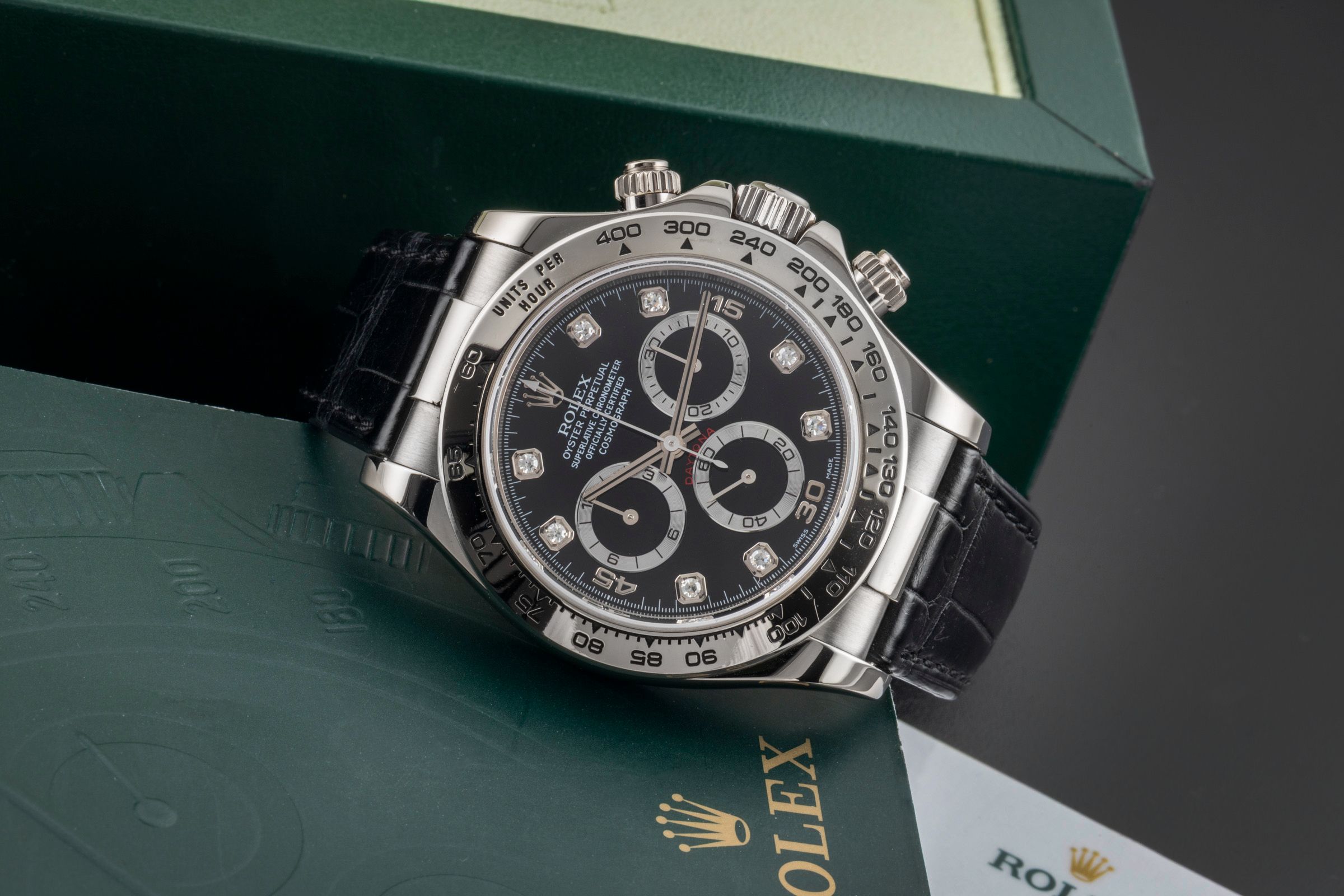Alternative title: Rolex 116519 - Daytona; Rolex Daytona Chronograph 18k Weissgold Black Diamond Dial Ref. 116519 B&P 2004 [2601380]