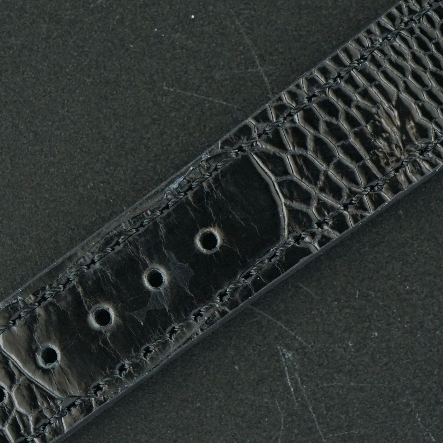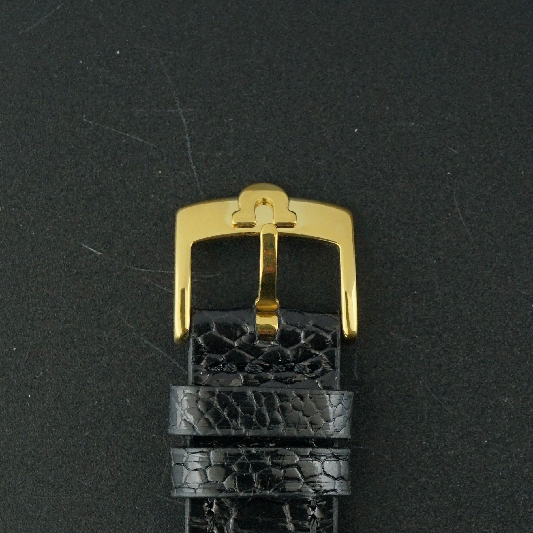 Strap: A black top-grain leather strap with a crocodile motif. (Fits a 12 to 20cm wrist)