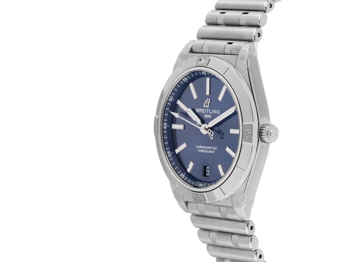 Breitling Chronomat Stahl Automatik Armband StahlGehäuse Edelstahl poliert und satiniert, Gehäusedurchmesser ohne Krone 36mm, Gehäusehöhe 10,0mm. Lünette Edelstahl poliert mit 60-Minuten Skala und Leuchtpunkt, einseitig drehbar mit Sperre. Rouleaux Armband Edelstahl poliert und satiniert, verdeckte Doppelfaltschließe Edelstahl mit Hersteller-Logo. Zifferblatt blau mit aufgesetzten Edelstahl Leuchtindexen sowie Edelstahl Leuchtzeigern. Uhrwerk Automatik, Chronometer mit Zeugnis, Kaliber Breitling 10 mit 25 Edelsteinen, Gangreserve ca. 42 Stunden. Anzeige von Stunde, Minute Sekunde über Zeiger aus der Mitte, Datumsanzeige mit Schnellverstellung bei 6 Uhr. Saphirglas kratzfest, doppelseitig entspiegelt und bombiert. Zwiebelkrone mit Hersteller-Logo. Boden Edelstahl verschraubt und graviert. Gewicht der Uhr inklusive Armband 104g, Länge des Armbandes inklusive Gehäuse 185mm. Wasserdicht bis 10 ATM. Referenznummer: A10380101C1A1, ID: P252644500226H-5500, Artikelnummer: 10000084802. Mit Gangkontrolle und kompletter äußerlicher Aufarbeitung von Februar 2026. Original Breitling Box und Garantie Papiere von 2021 sowie Beschreibung und Watchregister Auszug von Februar 2026, The Watch Register Zertifikat / ohne Eintrag (Internationale Datenbank für verlorene oder gestohlene Uhren), Full Set. Ungetragen. Lieferzeit sofort.