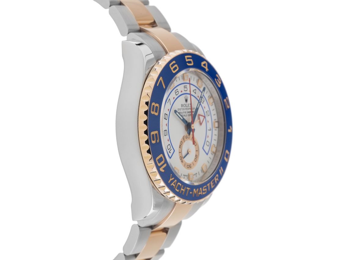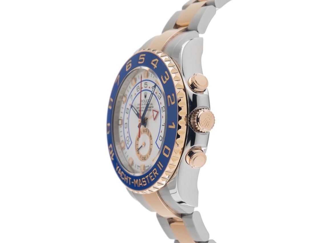 Rolex Yacht-Master II Stahl 18kt Roségold Everose Automatik Chronograph Armband Oyster Gehäuse Edelstahl poliert, Gehäusedurchmesser ohne Krone 44mm, Gehäusehöhe 13,7mm. Lünette 18kt Roségold Everose gerädelt mit blauem Keramik Inlay, gravierten roségoldenen arabischen Ziffern und Beschriftung, beidseitig drehbarer Ring-Command. Armband Oyster Edelstahl / 18kt Roségold Everose poliert und satiniert, Sicherheitsfaltschließe Edelstahl / 18kt Roségold Everose mit Hersteller-Logo. Zifferblatt weiß mit aufgesetzten in Roségold gefassten Indexen, schwarzen arabischen Ziffern und gebläuten Zeigern. Uhrwerk Automatik, Chronograph, Chronometer mit Zeugnis, Rolex Manufakturkaliber 4161 mit 42 Edelsteinen. Anzeige von Stunde und Minute über Zeiger aus der Mitte, kleine Sekunde mit Sekundenstopp zur sekundengenauen Einstellung der Uhrzeit bei 6 Uhr, Countdown Einstellung über kurzen Zeiger mit roter Leuchtspitze aus der Mitte. Saphirglas kratzfest. Krone verschraubbar mit Flankenschutz und Hersteller-Logo. Boden Edelstahl verschraubt. Gewicht der Uhr inklusive Armband 202g, Länge des Armbandes inklusive Gehäuse 190mm. Referenznummer: 116681, Gehäusenummer: 07S9FXXX, ID: P2728395000326H-25000, Artikelnummer: 10000085264. Mit Gangkontrolle und kompletter äußerlicher Aufarbeitung von März 2026. Original Rolex Box mit Umkarton und Garantie Papiere von September 2018, LC 150 / Spain sowie Beschreibung, Ledermäppchen, Rolex Chronometer-Siegel, Lünettenschutz und Watchregister Auszug von März 2026, The Watch Register Zertifikat / ohne Eintrag (Internationale Datenbank für verlorene oder gestohlene Uhren), Full Set. Superschnäppchen, Kapitalanlage mit Wertsteigerungspotential, aus erster Hand . Sehr guter Zustand. Lieferzeit sofort. Inklusive certified pre owned Zertifikat / Uhrenpass mit einem Farbbild, der genauen Beschreibung sowie dem Wiederbeschaffungswert der Uhr über 25000,-€ und 1000 Tage Garantie ab Kaufdatum.