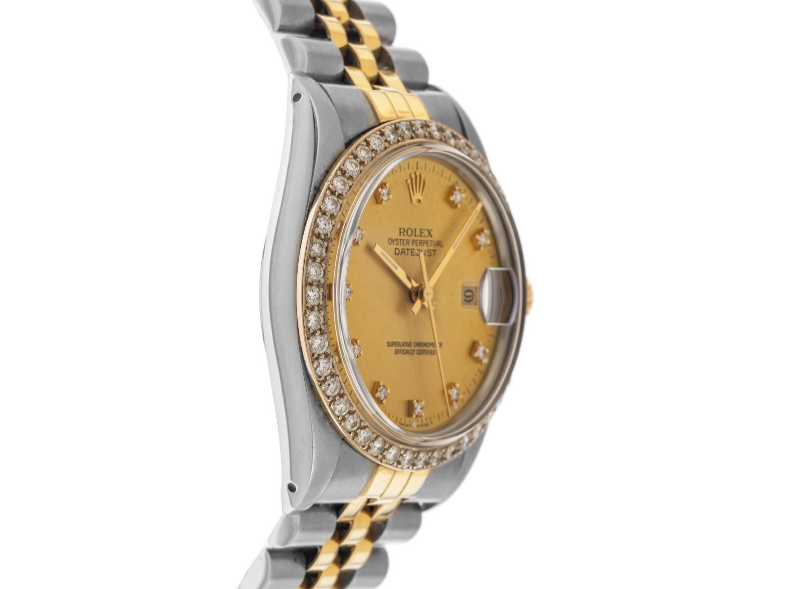 Rolex Datejust Acciaio 18kt Oro Giallo Diamanti Automatico Bracciale Jubilé Cassa in Acciaio Lucido e Satinato, diametro della cassa senza corona 36mm, altezza della cassa 12,4mm. Lunetta in Oro Giallo 18kt rigata e lucida con diamanti incastonati. Bracciale Jubilé in Acciaio / Oro Giallo 18kt lucido e satinato, chiusura pieghevole in Acciaio con logo del produttore. Quadrante color champagne, leggermente patinato con 10 indici in diamante applicati e lancette in oro giallo, con la scritta "T SWISS MADE T" alle 6. Movimento automatico, cronometro con certificato, calibro Rolex 3035 con 27 pietre preziose. Indicazione di ore, minuti e secondi tramite lancette centrali con fermo secondi per la regolazione precisa dell'ora, indicazione della data con regolazione rapida sotto lente di ingrandimento alle 3, open 6/9 (6 e 9 aperte nell'indicazione della data). Vetro in plexiglass curvato. Corona a vite con logo del produttore. Fondello in Acciaio avvitato. Peso dell'orologio incluso il bracciale 99g, lunghezza del bracciale incluso la cassa 190mm. Numero di riferimento: 16013, numero di cassa: 8122XXX, ID: P280180000426H-9800, numero articolo: 10000085385. Con controllo del movimento e completa rifinitura esterna di aprile 2026. Scatola originale Rolex con scatola esterna e documenti di garanzia di maggio 1984, oltre a descrizione, libretto di traduzione, astuccio in pelle, sigillo cronometro Rolex e estratto dal Watch Register di aprile 2026, certificato The Watch Register / senza registrazione (database internazionale per orologi smarriti o rubati), Full Set. Super affare, investimento con potenziale di aumento di valore, pezzo da collezione estremamente raro. Ottime condizioni. Tempo di consegna immediato. Includendo certificato certified pre owned / passaporto orologio con un'immagine a colori, la descrizione dettagliata e il valore di sostituzione dell'orologio superiore a 9800,-€ e 1000 giorni di garanzia dalla data di acquisto.