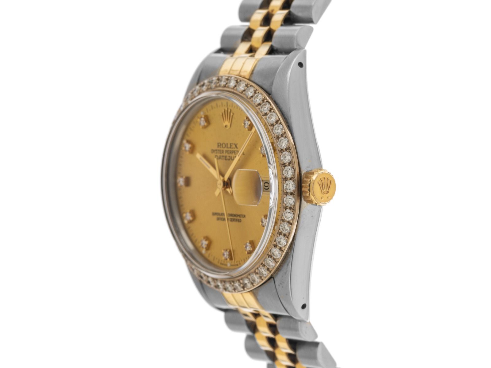 Rolex Datejust Stahl 18kt Gelbgold Diamanten Automatik Armband Jubilé Gehäuse Edelstahl poliert und satiniert, Gehäusedurchmesser ohne Krone 36mm, Gehäusehöhe 12,4mm. Lünette 18kt Gelbgold geriffelt und poliert mit Diamanten besetzt. Armband Jubilé Edelstahl / 18kt Gelbgold poliert und satiniert, Faltschließe Edelstahl mit Hersteller-Logo. Zifferblatt champagnerfarben, leicht patiniert mit 10 aufgesetzten Diamantindexen und gelbgoldenen Zeigern, sowie "T SWISS MADE T" Aufschrift bei 6 Uhr. Uhrwerk Automatik, Chronometer mit Zeugnis, Rolex Manufakturkaliber 3035 mit 27 Edelsteinen. Anzeige von Stunde, Minute und Sekunde über Zeiger aus der Mitte mit Sekundenstopp zur sekundengenauen Einstellung der Uhrzeit, Datumsanzeige mit Schnellverstellung unter Glaslupe bei 3 Uhr, open 6/9 (offene 6 und 9 in der Datumsanzeige). Plexiglas gewölbt. Krone verschraubbar mit Hersteller-Logo. Boden Edelstahl verschraubt. Gewicht der Uhr inklusive Armband 99g, Länge des Armbandes inklusive Gehäuse 190mm. Referenznummer: 16013, Gehäusenummer: 8122XXX, ID: P280180000426H-9800, Artikelnummer: 10000085385. Mit Gangkontrolle und kompletter äußerlicher Aufarbeitung von April 2026. Original Rolex Box mit Umkarton und Garantie Papiere von Mai 1984 sowie Beschreibung, Übersetzungsheft, Ledermäppchen, Rolex Chronometer-Siegel und Watchregister Auszug von April 2026, The Watch Register Zertifikat / ohne Eintrag (Internationale Datenbank für verlorene oder gestohlene Uhren), Full Set. Superschnäppchen, Kapitalanlage mit Wertsteigerungspotential, extrem seltenes Sammlerstück. Sehr guter Zustand. Lieferzeit sofort. Inklusive certified pre owned Zertifikat / Uhrenpass mit einem Farbbild, der genauen Beschreibung sowie dem Wiederbeschaffungswert der Uhr über 9800,-€ und 1000 Tage Garantie ab Kaufdatum.