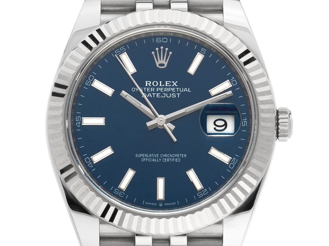 Rolex Datejust Stahl 18kt Weißgold Automatik Armband Jubilé Gehäuse Edelstahl poliert und satiniert, Gehäusedurchmesser ohne Krone 41mm, Gehäusehöhe 11,6mm. Lünette 18kt Weißgold geriffelt und poliert. Armband Jubilé Edelstahl poliert und satiniert, Faltschließe Edelstahl mit Hersteller-Logo. Zifferblatt blau mit aufgesetzten in Weißgold gefassten Leuchtindexen und weißgoldenen Leuchtzeigern. Uhrwerk Automatik, Chronometer mit Zeugnis, Rolex Manufakturkaliber 3235 mit 31 Edelsteinen. Anzeige von Stunde, Minute und Sekunde über Zeiger aus der Mitte mit Sekundenstopp zur sekundengenauen Einstellung der Uhrzeit, Datumsanzeige mit Schnellverstellung unter Glaslupe bei 3 Uhr. Saphirglas kratzfest. Krone verschraubbar mit Hersteller-Logo. Boden Edelstahl verschraubt. Gewicht der Uhr inklusive Armband 134g, Länge des Armbandes inklusive Gehäuse 180mm. Referenznummer: 126334, Gehäusenummer: 63R2WXXX, ID: P2804222120426HW-1590/11450, Artikelnummer: 10000085406. Mit Gangkontrolle und kompletter äußerlicher Aufarbeitung von April 2026. Original Rolex Box mit Umkarton und Garantie Papiere von Juli 2020, neue Rolex Garantie Karte ohne Ländercode sowie Beschreibung, Ledermäppchen, Rolex Chronometer-Siegel und Watchregister Auszug von April 2026, The Watch Register Zertifikat / ohne Eintrag (Internationale Datenbank für verlorene oder gestohlene Uhren), Full Set. Kapitalanlage mit Wertsteigerungspotential. Wie Neu. Lieferzeit sofort. Inklusive certified pre owned Siegel / Uhrenpass mit einem Farbbild, der genauen Beschreibung sowie dem Wiederbeschaffungswert der Uhr über 15900,-€ und 1000 Tage Garantie ab Kaufdatum.