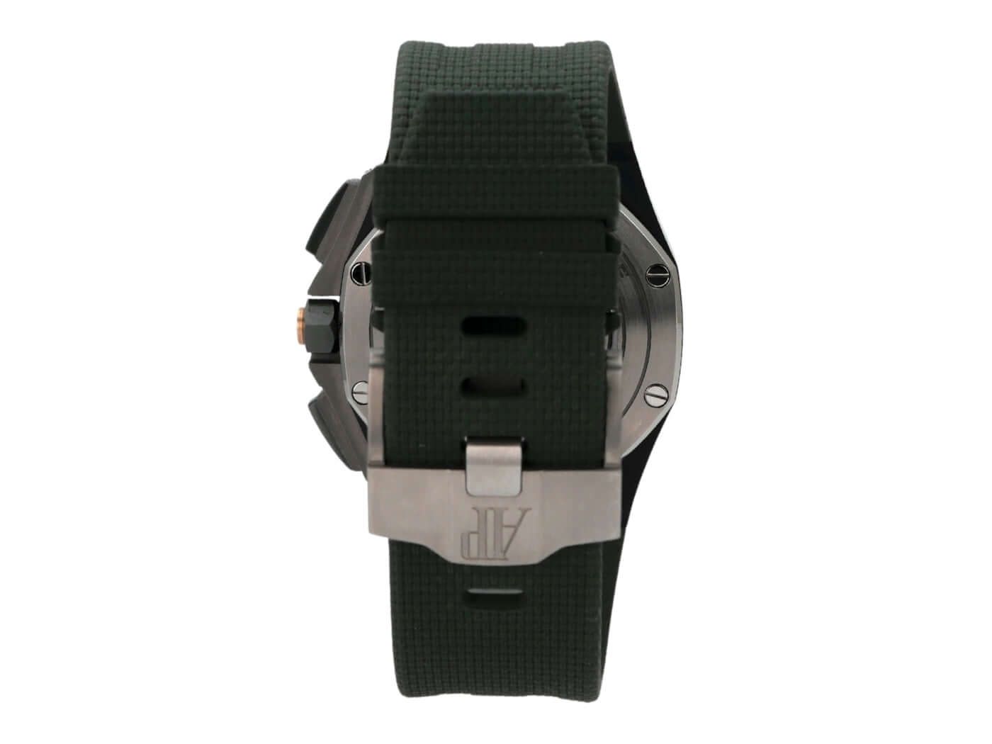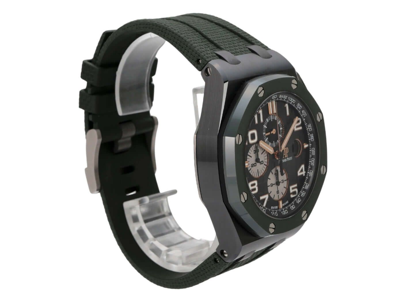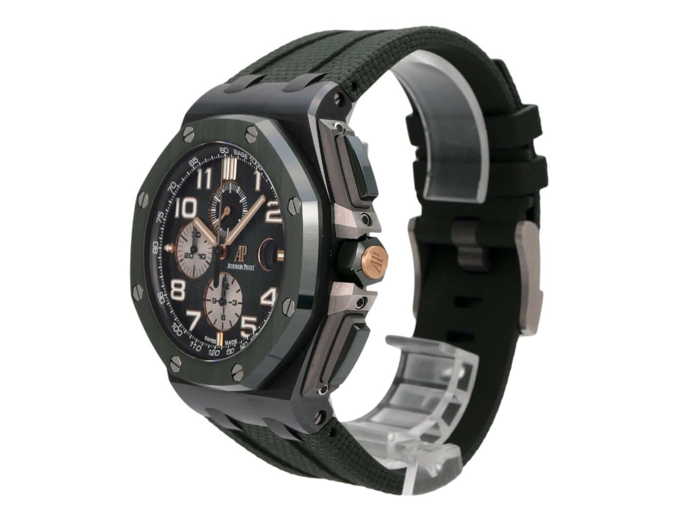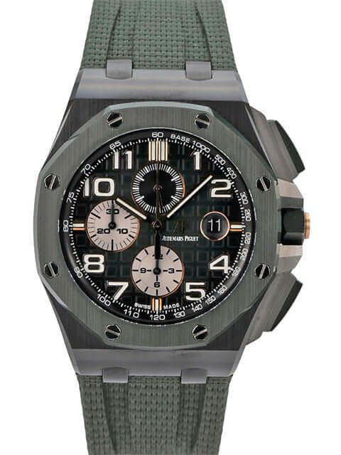 Audemars Piguet Royal Oak Offshore Chronograph 26405CE.OO.A056CA.01Ceramic case, case diameter 44 mm, case height 14.4 mm, green ceramic screwed bezel, green rubber strap with titanium pin buckle, green dial with Arabic luminous numerals and luminous indices, automatic movement, manufacture caliber 3126 / 3840 with 59 jewels, frequency 21,600 vph, power reserve approximately 50 hours, date display, anti-reflective sapphire crystal, screwed and engraved sapphire case back, water-resistant up to 10 bar.