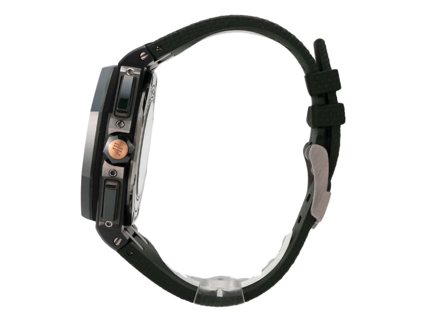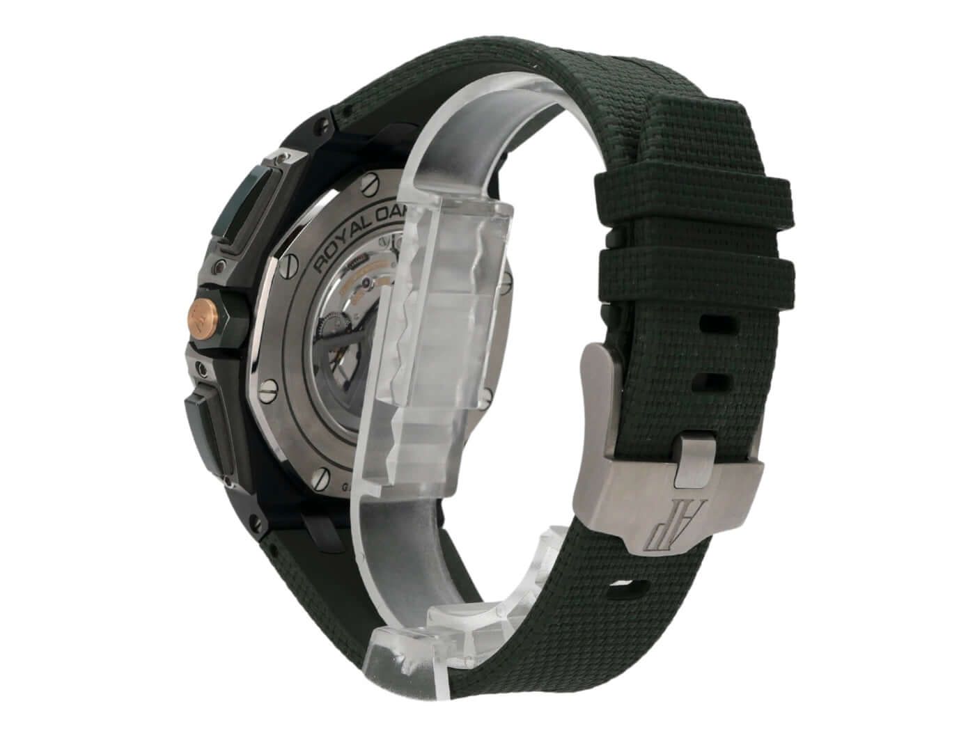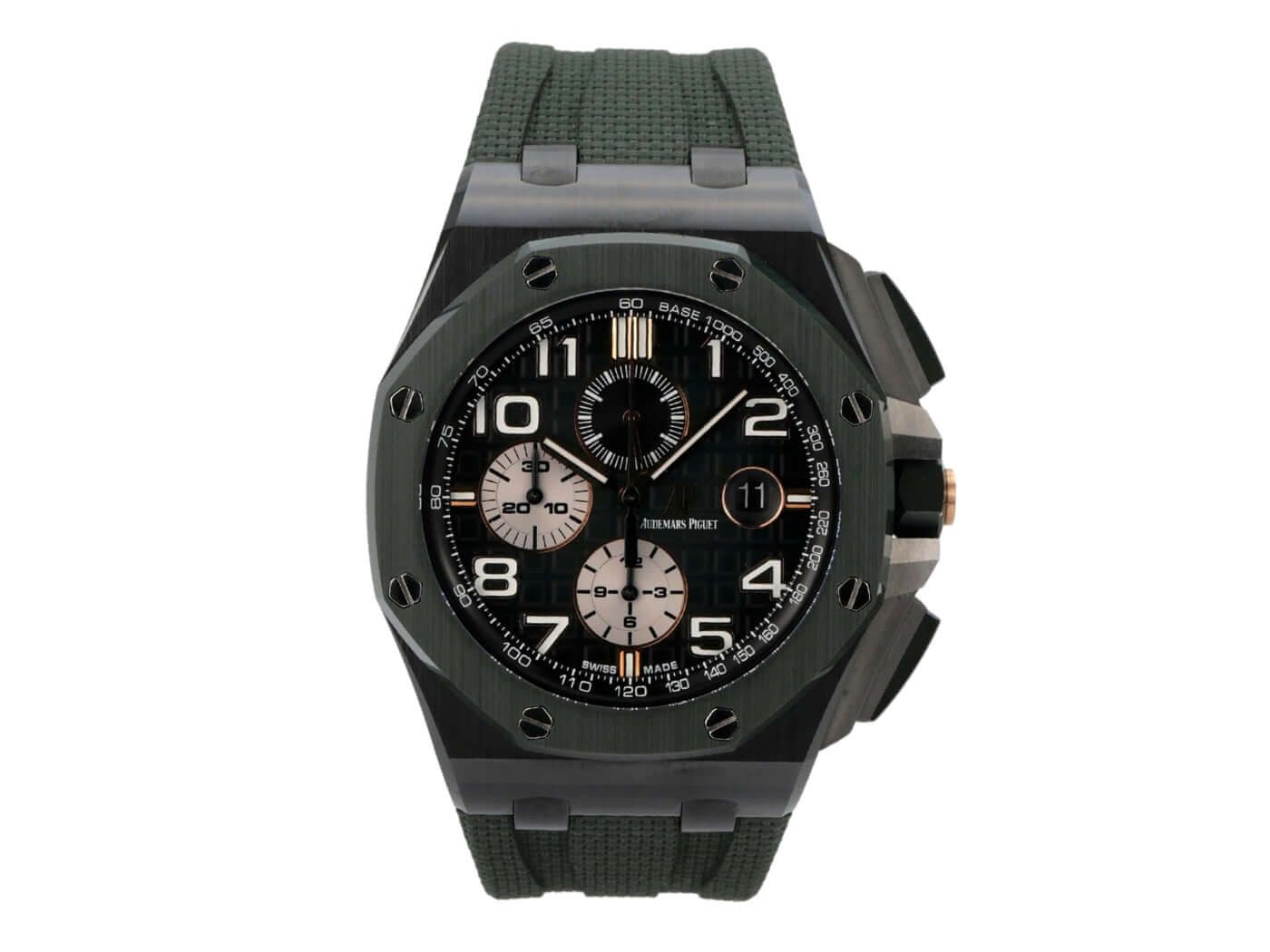 Audemars Piguet Royal Oak Offshore Chronograph 26405CE.OO.A056CA.01Ceramic case, case diameter 44 mm, case height 14.4 mm, green ceramic screwed bezel, green rubber strap with titanium pin buckle, green dial with Arabic luminous numerals and luminous indices, automatic movement, manufacture caliber 3126 / 3840 with 59 jewels, frequency 21,600 vph, power reserve approximately 50 hours, date display, anti-reflective sapphire crystal, screwed and engraved sapphire case back, water-resistant up to 10 bar.