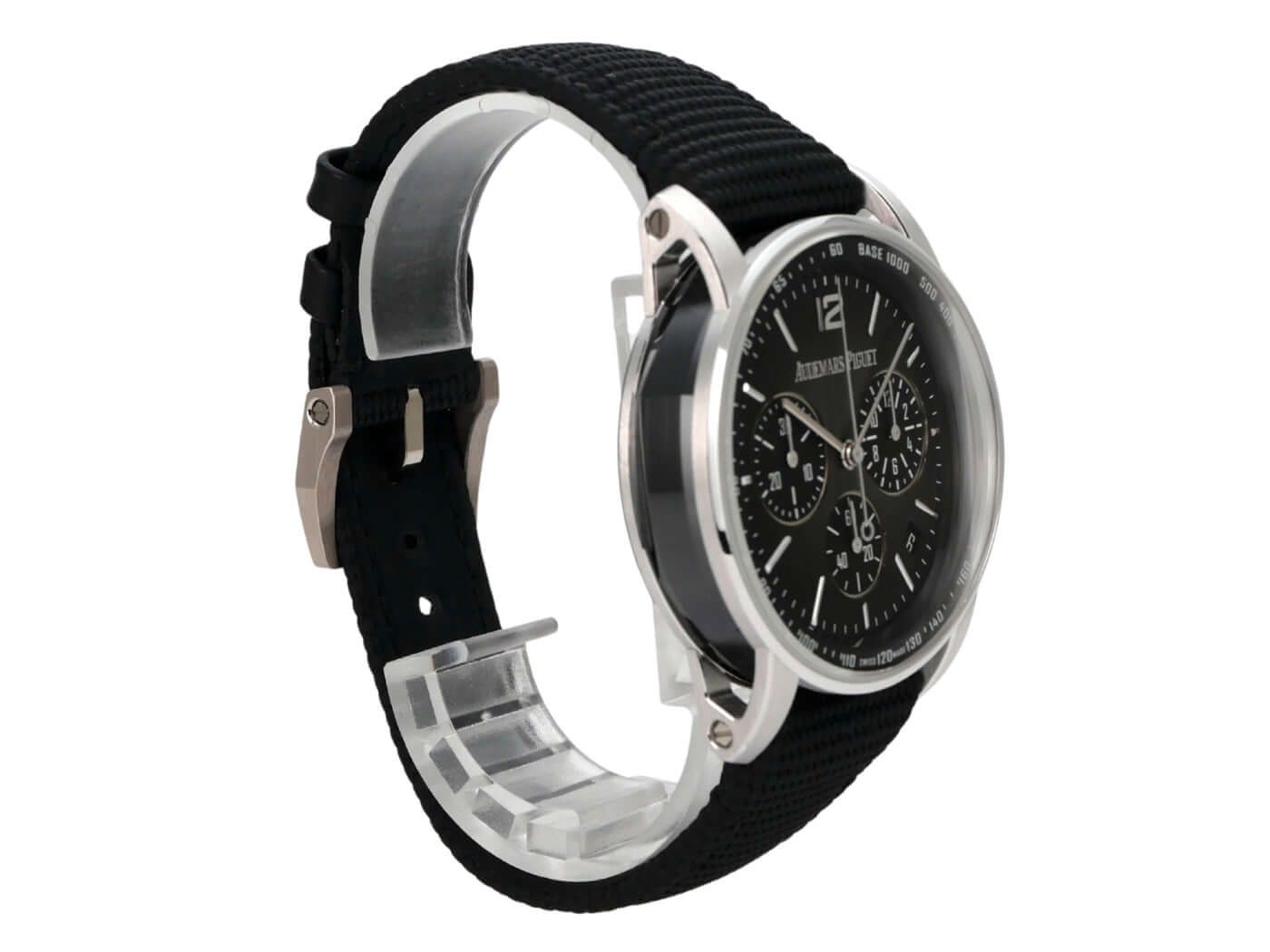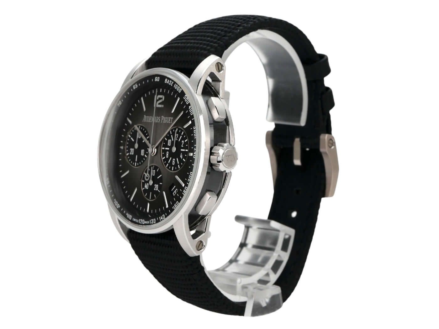 Audemars Piguet Code 11.59 Chronograph 26393NB.OO.A002KB.01Case made of ceramic / polished and satin-finished white gold, case diameter 41 mm, case height 12.6 mm, polished white gold bezel, rubber strap with white gold pin buckle, smoky black dial with white gold indices and hands, tachymeter scale, automatic movement, manufacture caliber 4401 with 40 jewels, frequency 28,800 vibrations per hour, power reserve of approximately 70 hours, date display, anti-reflective sapphire crystal, exhibition case back, water-resistant up to 3 bar.