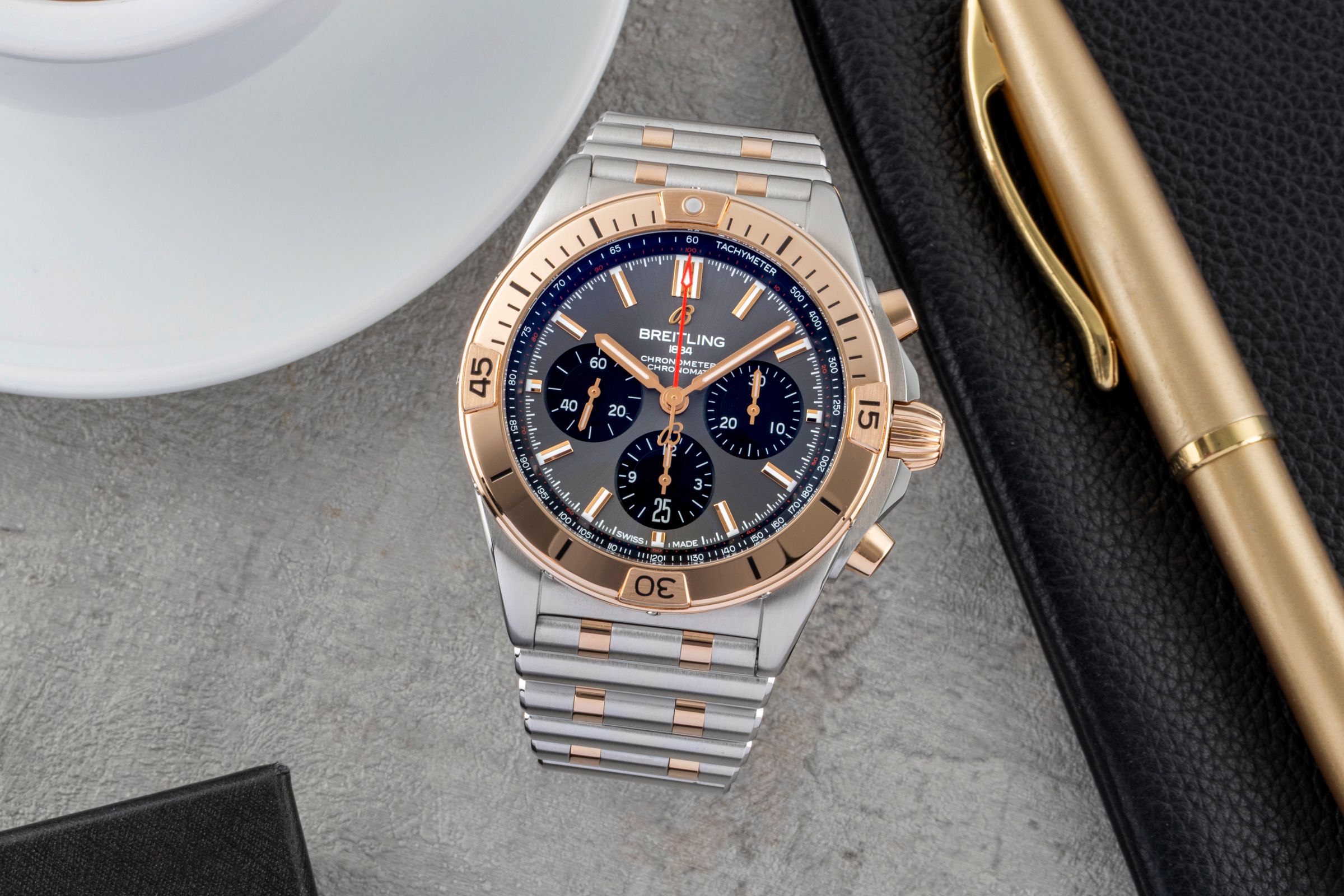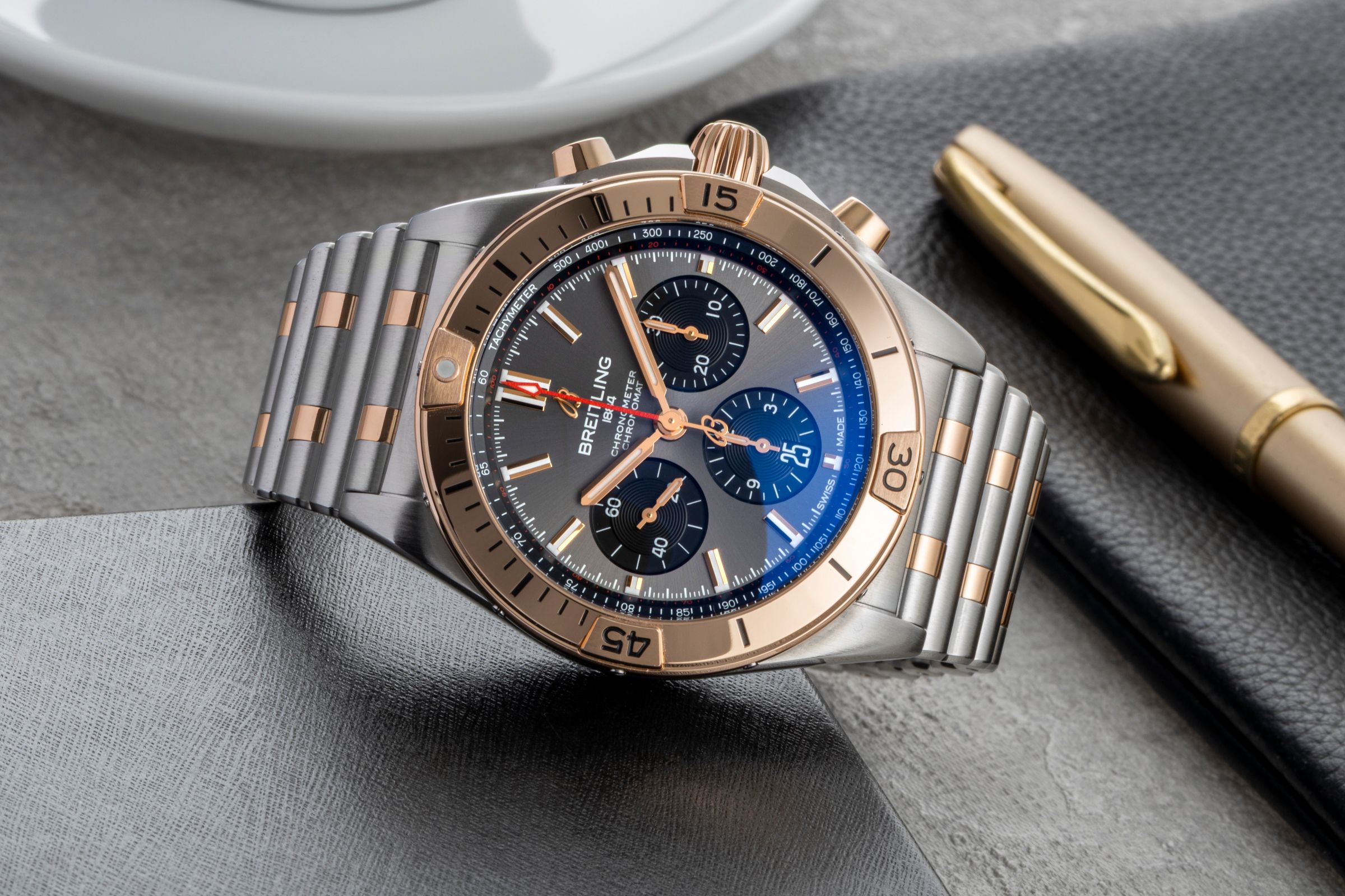 Alternative title: Breitling UB0134101B1U1 Chronomat B01 42 Stainless Steel / Red Gold / Anthracite; Breitling Chronomat 42 B01 Stahl / Gold Automatik Ref. UB0134101B1U1 NP: 14200 € [2600722]