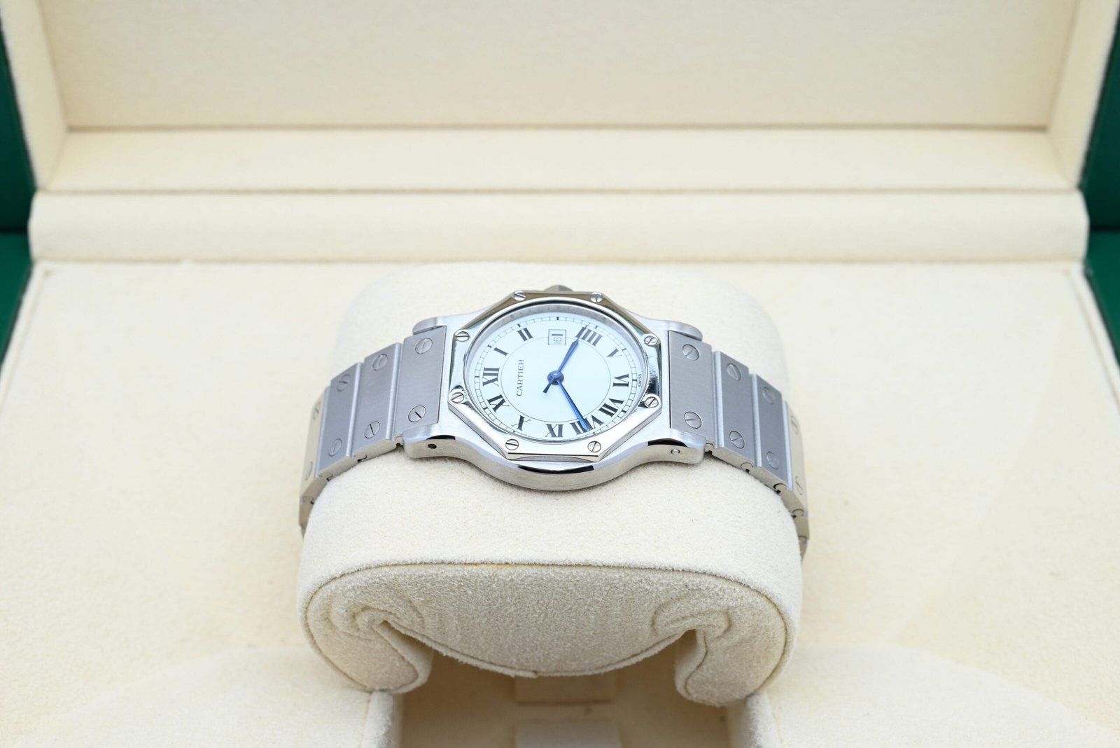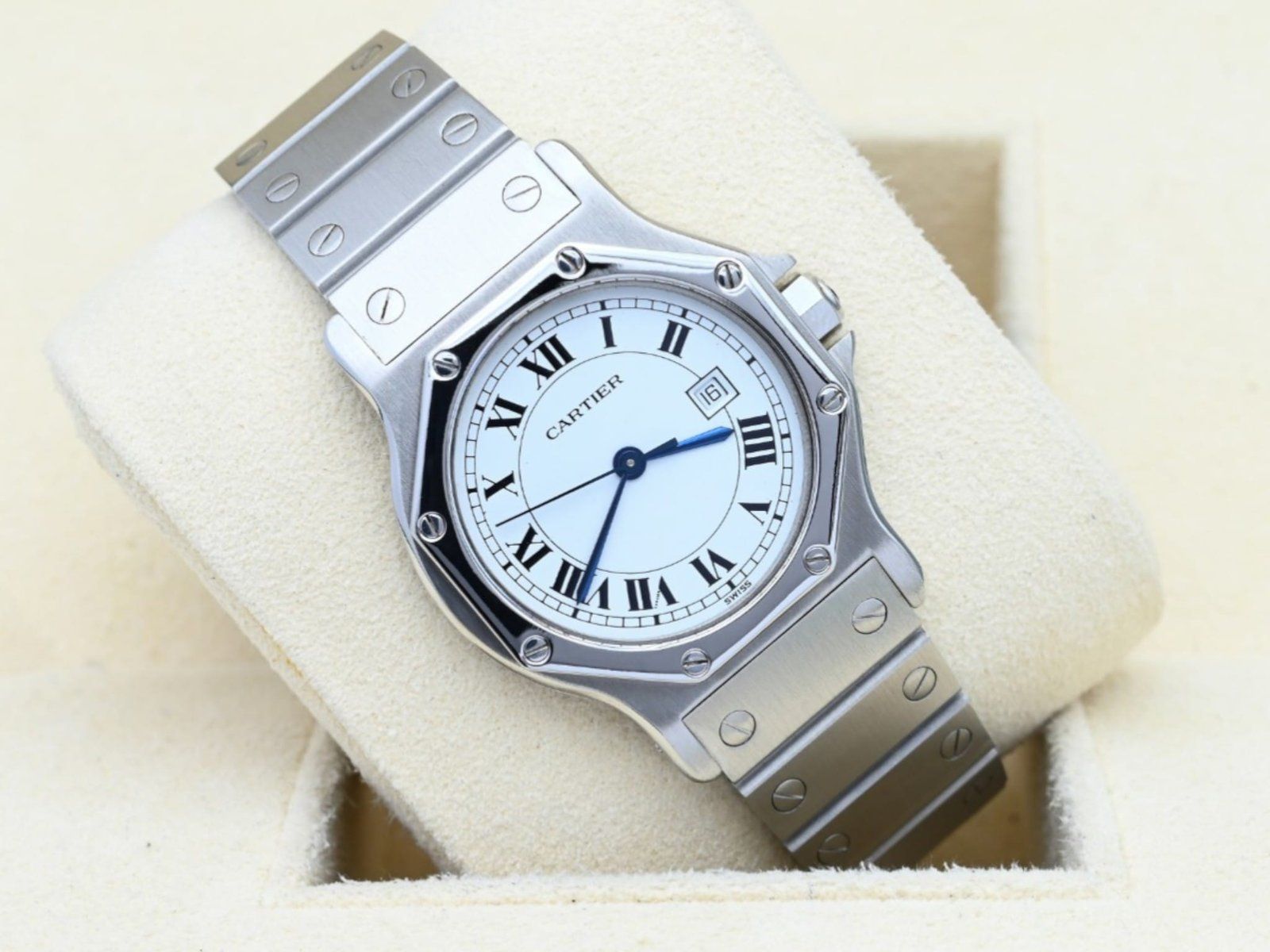 Cartier Santos Octagon 2965 degli anni '90 in condizioni eccellenti, completa della scatola originale Cartier. Tutti i nostri orologi sono stati controllati a fondo dal nostro orologiaio e serviti quando necessario.