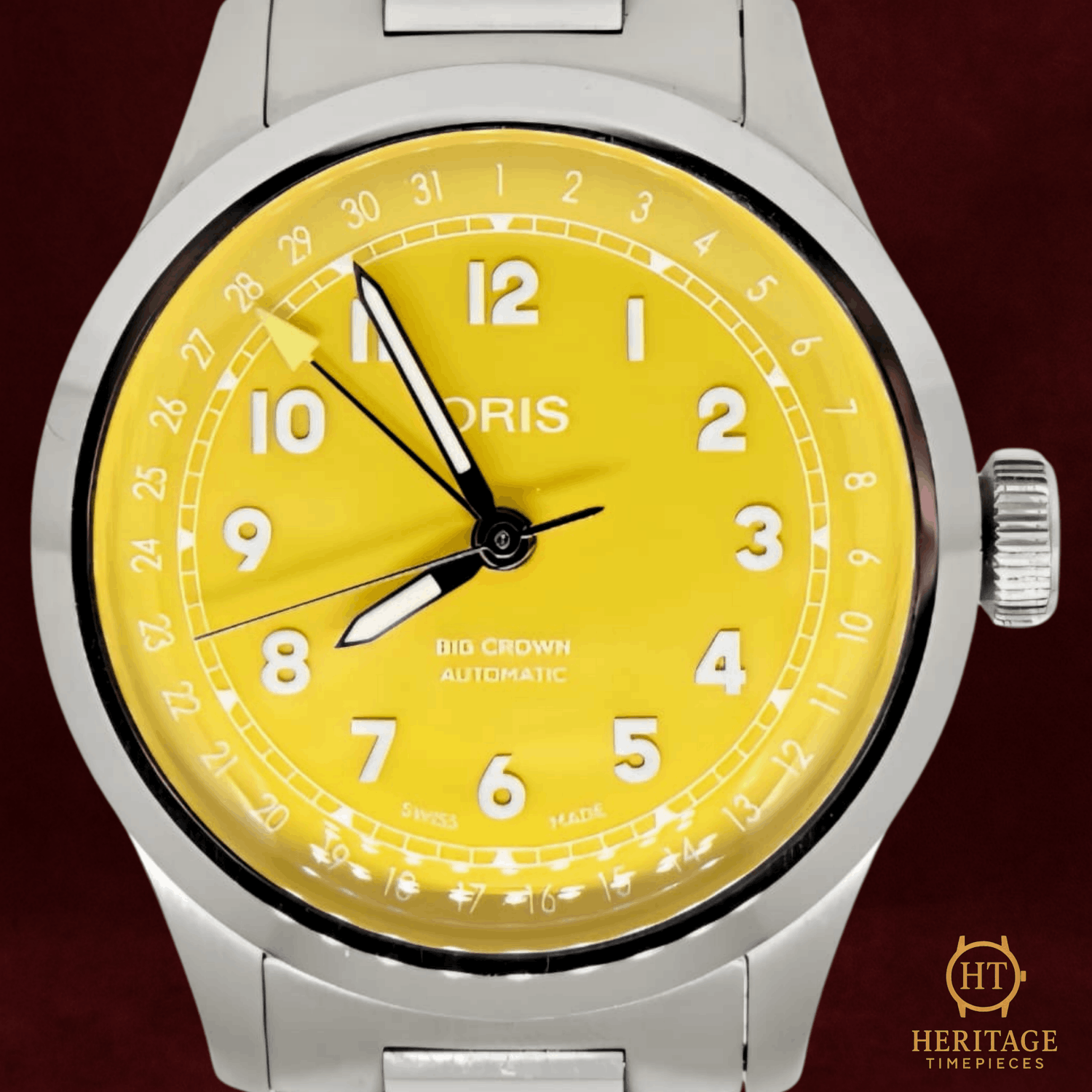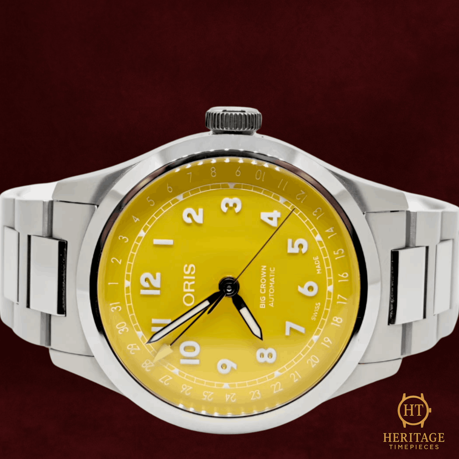 Heritage Narrative The Oris Big Crown Pointer Date is one of the brand’s most iconic designs, instantly recognizable through its aviation-inspired layout and signature pointer date complication. With roots dating back to the 1930s, the Big Crown collection has become a cornerstone of Oris, combining vintage character with practical everyday usability. This example from 2025 is presented in like-new condition with one previous owner and offered as a full set. The watch features a striking yellow dial with bold Arabic numerals and Oris’ classic pointer date display, where the central hand indicates the date on the outer scale. The vivid dial color gives the watch a modern, energetic presence while keeping the design clean, legible, and unmistakably Oris. Powered by an Oris self-winding mechanical movement, the watch offers reliable daily performance and ease of use. The stainless steel case and matching bracelet complete the sporty profile, making this Big Crown Pointer Date a versatile everyday watch with strong personality. Presented in near-new condition and complete with full set inclusions, this Oris offers excellent value in a highly wearable modern configuration. Technical Specifications Brand:Oris Model:Big Crown Pointer Date Reference:01 754 7798 4069-07 8 20 06 Year:2025 Movement:Oris self-winding automatic mechanical movement Complications:Pointer date Case:Stainless steel case Crystal:Sapphire crystal Bracelet:Stainless steel bracelet Water Resistance:50 m (factory specification) Condition & Inclusions Overall Condition:Like new / new condition (One owner) Service Status:Movement tested and functioning correctly Set:Full set Shipping & Logistics The watch is stored securely and shipped fully insured within 1–3 business days. Worldwide shipping is available. Any applicable import duties or taxes are the responsibility of the buyer. Shipping & Returns Complimentary insured worldwide shipping and a 14-day return window. Each timepiece is authenticated, time-tested, and professionally prepared prior to dispatch. Secure packaging, tracking, and full insurance are included with every shipment.