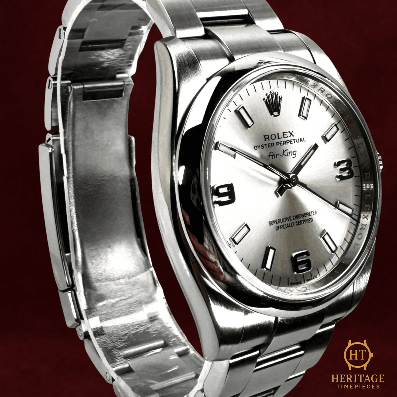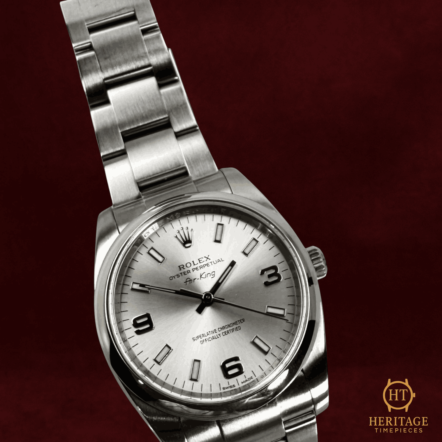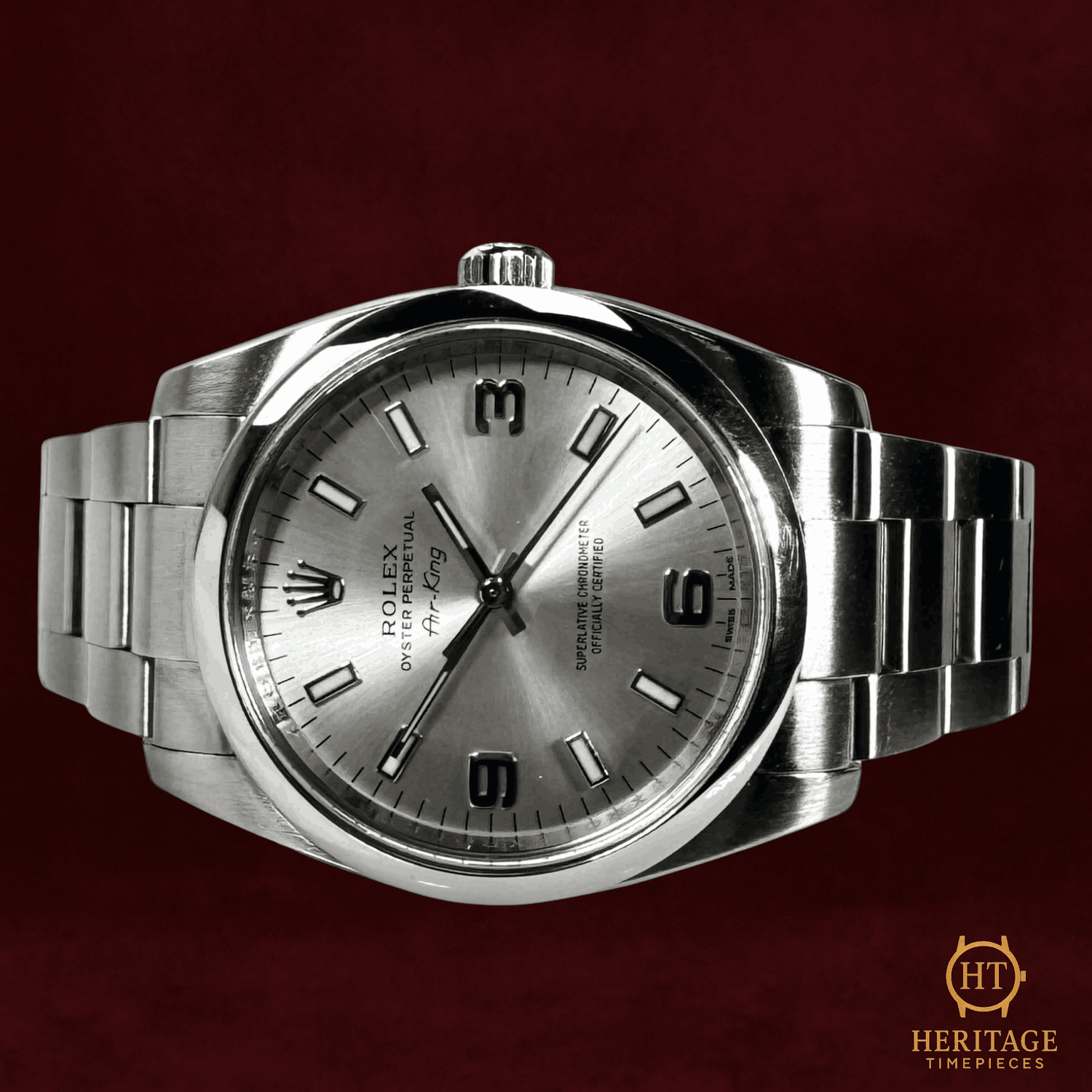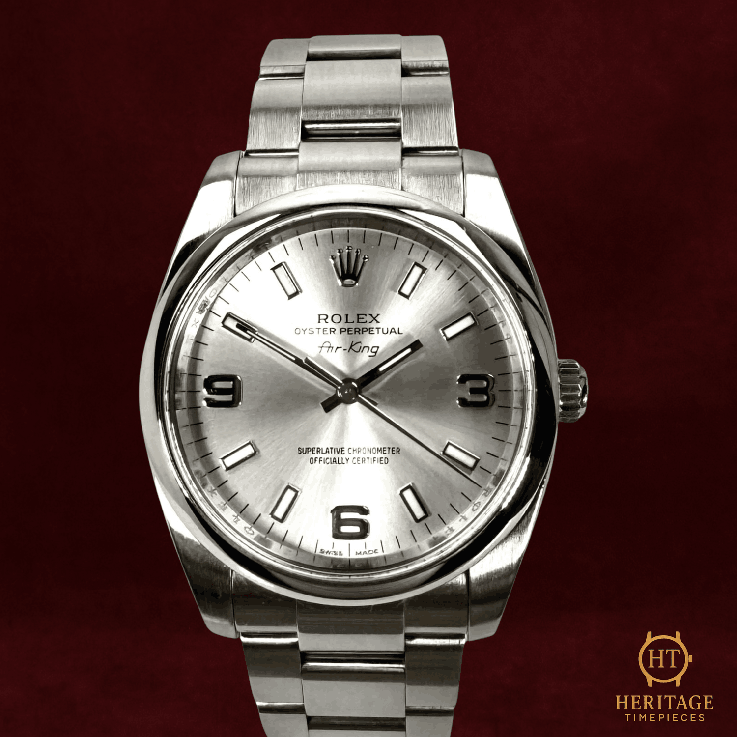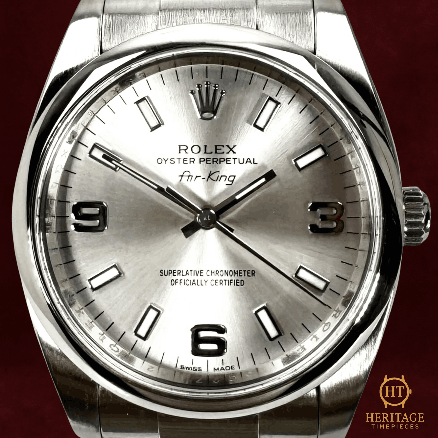 Heritage Narrative The Rolex Oyster Perpetual 34 reference 114200 represents Rolex in its purest form — clean proportions, time-only functionality, and enduring mechanical reliability. This 2014 example features the sought-after Explorer-style dial, distinguished by its luminous 3-6-9 Arabic markers set against a refined silver backdrop. The 34 mm stainless steel Oyster case and smooth bezel deliver balanced, understated elegance, while the Oyster bracelet reinforces the model’s everyday versatility. Powered by the Rolex calibre 3130, the watch offers proven durability and chronometric precision. Presented in mint condition and accompanied by its box, certificate, and booklet, this Oyster Perpetual 114200 stands as a discreet yet highly collectible configuration within the modern Rolex lineup. Technical Specifications Brand:Rolex Model:Oyster Perpetual 34 Reference:114200 Year:2014 Serial:15CXXXXX Movement:Self-winding mechanical movement (Rolex calibre 3130) Complications:Time only Case:Stainless steel34 mm Bezel:Smooth stainless steel bezel Crystal:Sapphire crystal Dial / Hands:Silver dialLuminous index markersSilver Arabic 3-6-9 numerals Strap:Stainless steel Oyster braceletApprox. 7 1/2 inches Clasp:Folding Oysterclasp Water Resistance:100 m / 330 ft (factory specification) Condition & Inclusions Overall Condition:Mint Service Status:Movement tested and functioning correctly Set:Includes box, certificate, and booklet Shipping & Logistics The watch is stored securely and shipped fully insured within 1–3 business days. Worldwide shipping is available. Any applicable import duties or taxes are the responsibility of the buyer. Shipping & Returns Complimentary insured worldwide shipping and a 14-day return window. Each timepiece is authenticated, time-tested, and professionally prepared prior to dispatch. Secure packaging, tracking, and full insurance are included with every shipment.