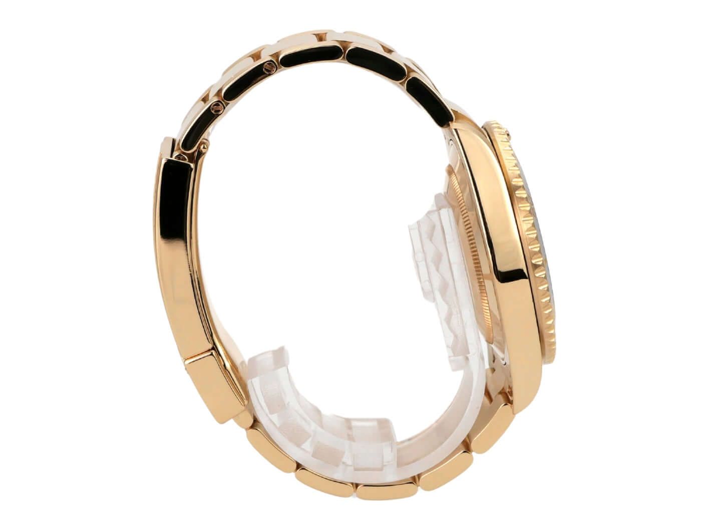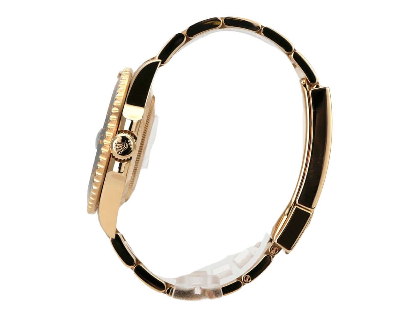 Cassa in oro giallo 18 carati, lucida e satinata, diametro della cassa 40 mm, altezza della cassa 12,5 mm, lunetta scanalata in oro giallo 18 carati, girevole con inserto in ceramica nera, scala dei 60 minuti e punto luminoso alle 12, bracciale Oyster in oro giallo 18 carati, lucido e satinato con chiusura pieghevole di sicurezza, quadrante nero con indici luminosi applicati e punti luminosi, lancette dorate luminose, movimento automatico, calibro di manifattura Rolex 3135 con 31 rubini, frequenza 28.800 A/h, indicazione della data, cronometro, vetro zaffiro antigraffio, corona a vite in oro giallo 18 carati con protezioni, fondello a vite in oro giallo 18 carati, impermeabile fino a 30 bar.