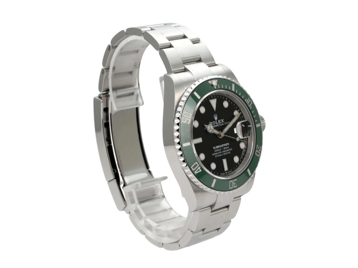 Rolex Submariner Date Stainless Steel Ref. 126610LV from 2021Case made of polished and satin-finished stainless steel, case diameter 41 mm, case height 12.5 mm, stainless steel bezel with green ceramic insert, 60-minute scale and luminous dot, rotatable, Oyster stainless steel bracelet, polished and satin-finished with safety folding clasp, black dial with applied luminous indices, luminous hands, automatic movement, Rolex caliber 3235 with 31 jewels, 28,800 A/h, 70-hour power reserve, date display with quick adjustment and magnifier, chronometer, sapphire crystal, screw-down crown with crown guards, screw-down stainless steel case back, water-resistant up to 30 bar.