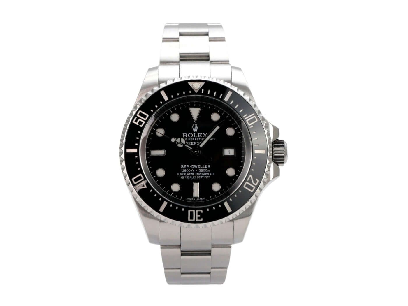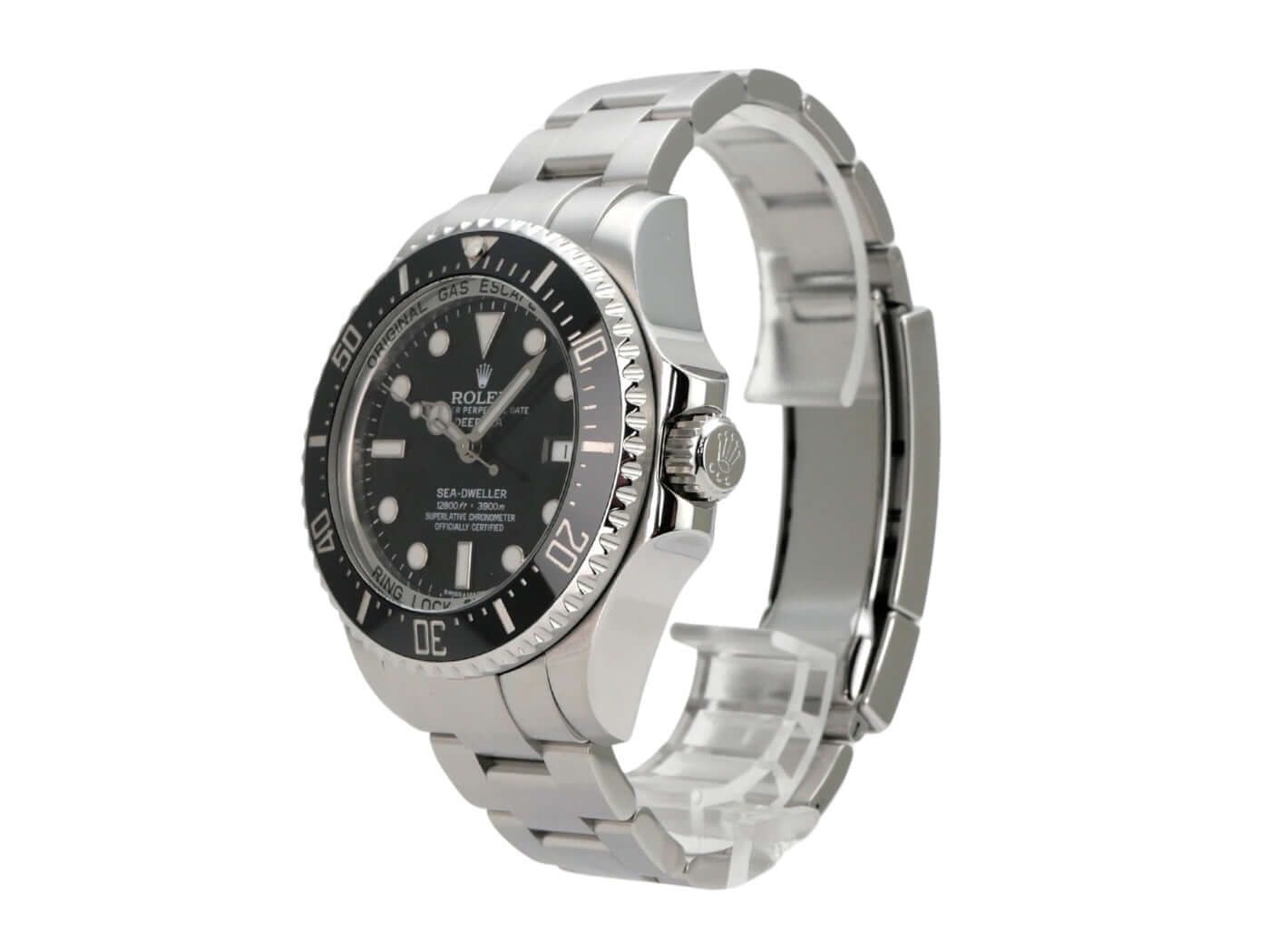 Rolex Sea-Dweller Deepsea Ref. 116660 aus 2014 Gehäuse aus Edelstahl poliert und satiniert, Gehäusedurchmesser 44 mm, Gehäusehöhe 17,8 mm, Edelstahl-Lünette, geriffelt mit schwarzer Keramik, 60 Minuten Skala und Leuchtpunkt einseitig drehbar, Heliumventil auf der 9 Uhr Position, Oyster-Edelstahlarmband, satiniert, mit Sicherheitsfaltschließe, schwarzes Zifferblatt mit aufgesetzten Leuchtindizes und Leuchtpunkten, Leuchtzeiger, Uhrwerk Automatik, Rolex Manufakturkaliber 3135 mit 31 Steinen, Schwingung 28.800 A/h, Datumsanzeige, Chronometer, kratzresistentes Saphirglas, bombiert, extrastark, verschraubbare Krone Triplock mit Flankenschutz, Edelstahlboden verschraubt und graviert, wasserdicht bis zu 390 bar. Gebrauchte Uhr, sehr guter Zustand, komplett mit Box und Papieren, EU-Auslieferung aus 2014, Revision bei Rolex 09/23.