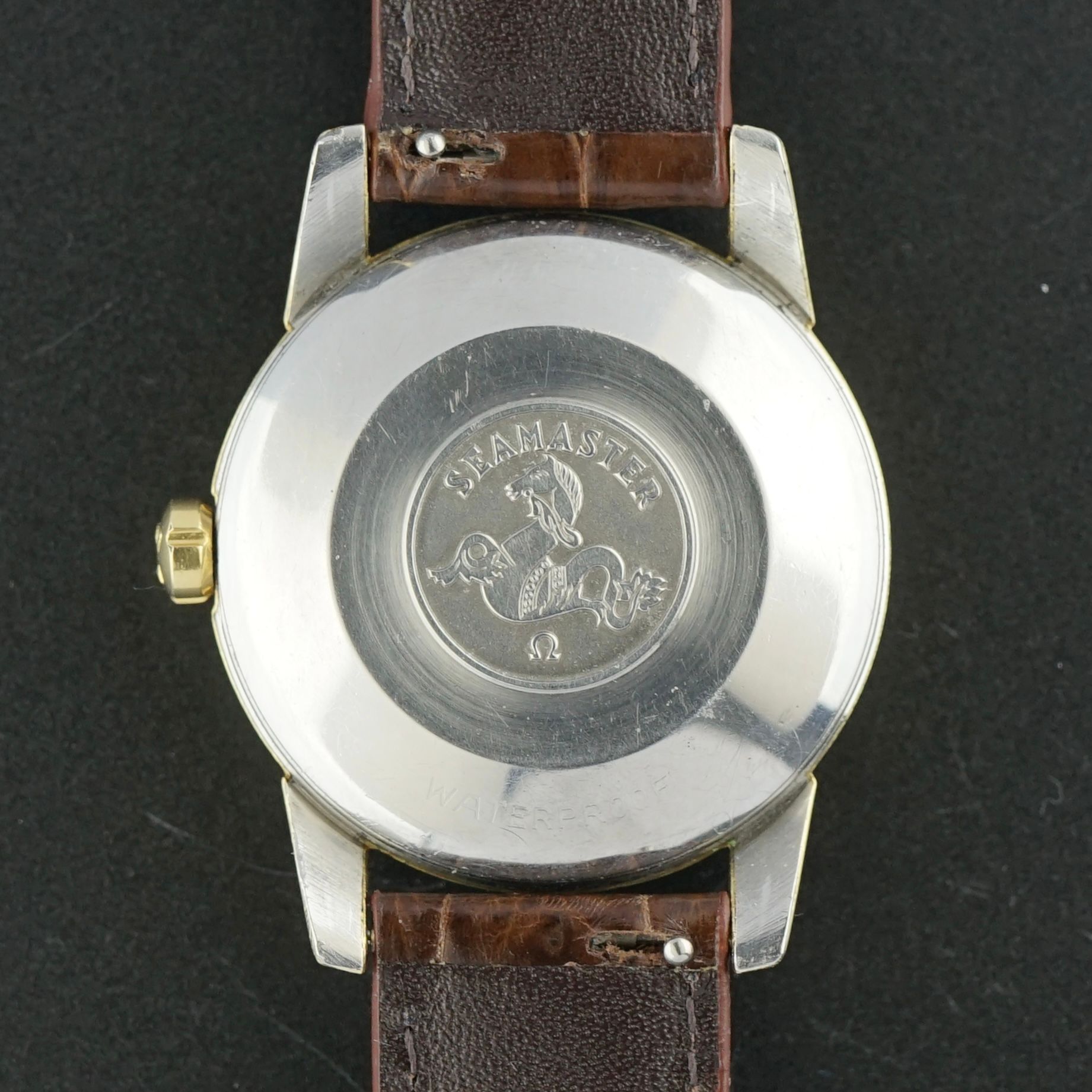 A Vintage Omega Seamaster from 1958 in outstanding condition, featuring an exceptionally well-preserved dial that remains in perfect shape with no visible patina after nearly 70 years, a uncommon and remarkable sight. The watch retains its original golden Dauphine hands and sandwich hour markers, all in excellent condition. The steel case with thick lugs is fully gold-plated, with the plating still beautifully intact. Inside, it houses the automatic caliber 501 movement, serviced in April 2026 and running excellently. Paired with a top-grain brown leather strap with crocodile embossing, this piece is entirely original apart from the strap, making it a truly impressive and highly collectible vintage timepiece.Year of production: 1958