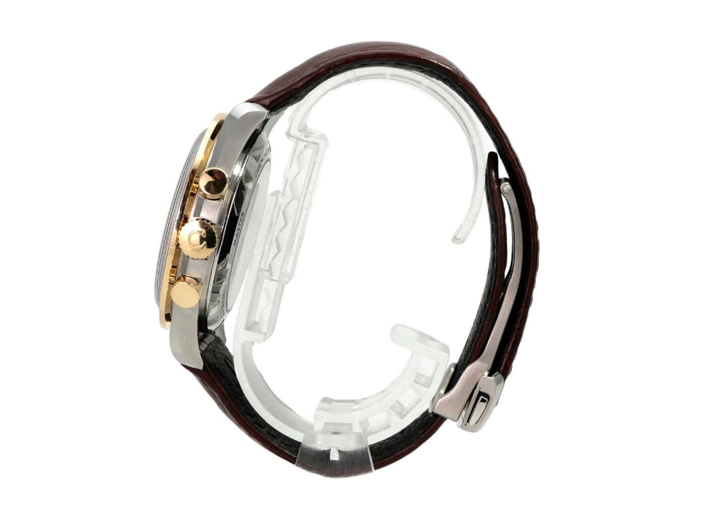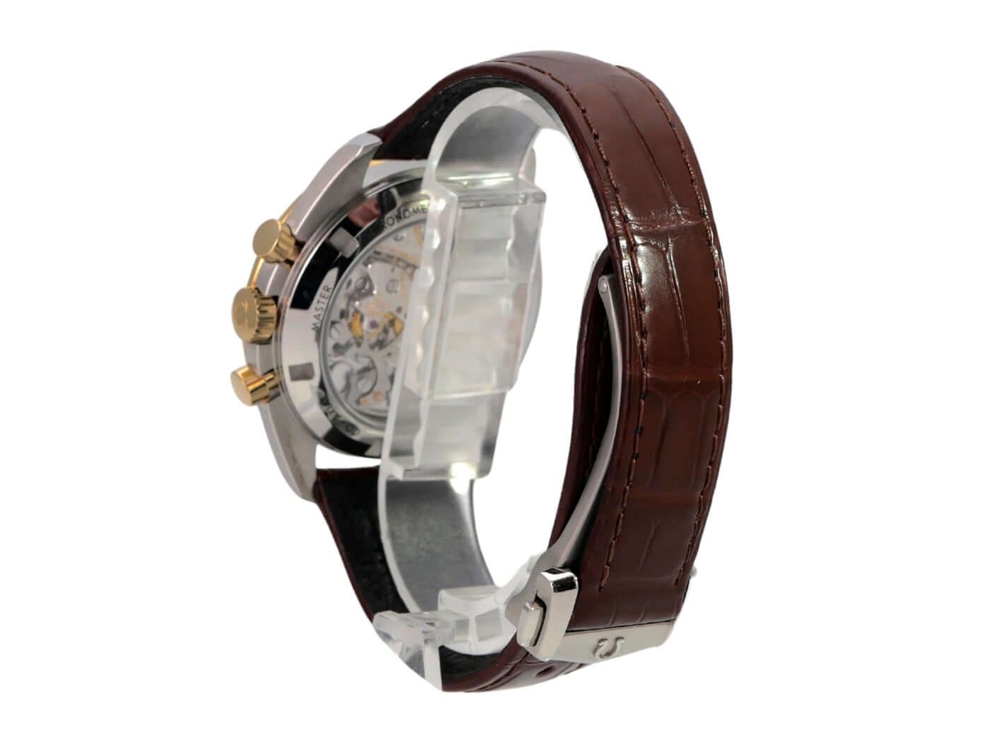 Cassa realizzata in acciaio inossidabile lucido e satinato, diametro della cassa 42 mm, altezza della cassa 14 mm, lunetta in oro giallo (Moonshine Gold) con inserto in ceramica nera e scala tachimetrica, cinturino in pelle marrone con chiusura pieghevole di sicurezza, quadrante argentato con indici luminosi, lancette luminose, carica manuale, calibro Omega 3861, 21.600 A/h, riserva di carica di circa 50 ore, cronografo, piccoli secondi a ore 9, Master Chronometer, vetro zaffiro, fondello della cassa in acciaio inossidabile avvitato e inciso, impermeabile fino a 5 bar.