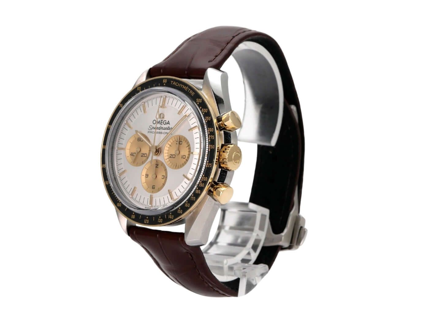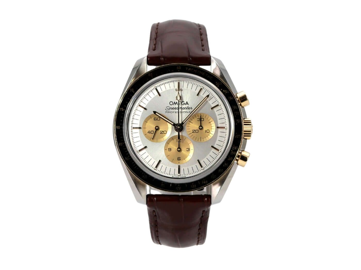 Omega Speedmaster Moonwatch 310.23.42.50.02.001Case made of polished and satin-finished stainless steel, case diameter 42 mm, case height 14 mm, yellow gold bezel (Moonshine Gold) with black ceramic inlay and tachymeter scale, brown leather strap with safety folding clasp, silver-colored dial with luminous indices, luminous hands, manual winding, Omega caliber 3861, 21,600 A/h, power reserve approx. 50 hours, chronograph, small seconds at 9 o’clock, Master Chronometer, sapphire crystal, screwed and engraved stainless steel case back, water-resistant up to 5 bar.