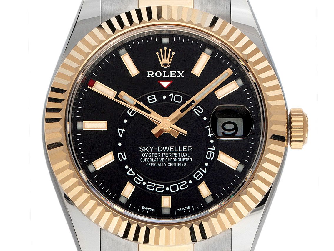 Rolex Sky-Dweller Stahl Gelbgold Automatik Armband Oyster Stahl GelbgoldGehäuse Edelstahl poliert und satiniert, Gehäusedurchmesser ohne Krone 42mm, Gehäusehöhe 14,1mm. Lünette 18kt Gelbgold geriffelt und poliert, beidseitig drehbar zur Steuerung der Funktionen. Armband Oyster Edelstahl / 18kt Gelbgold poliert und satiniert, Faltschließe Edelstahl / 18kt Gelbgold mit Hersteller-Logo. Zifferblatt schwarz mit aufgesetzten gelbgoldenen Leuchtindexen und gelbgoldenen Leuchtzeigern. Uhrwerk Automatik, Chronometer mit Zeugnis, Rolex Manufakturkaliber 9001 mit 40 Edelsteinen, Parachrom-Breguet-Spirale, Glucydur-Unruh. Anzeige von Stunde, Minute und Sekunde über Zeiger aus der Mitte mit Sekundenstopp zur sekundengenauen Einstellung der Uhrzeit, Datumsanzeige mit Schnellverstellung unter Glaslupe bei 3 Uhr, zweite Zeitzone (zusätzliche 24 Stunden Anzeige) aus der Mitte, Monatsanzeige in zwölf Sichtfenstern am Außenrand des Zifferblatts. Saphirglas kratzfest. Krone verschraubbar mit Hersteller-Logo. Boden Edelstahl verschraubt. Gewicht der Uhr inklusive Armband 191g, Länge des Armbandes inklusive Gehäuse 180mm. Referenznummer: 326933, Gehäusenummer: 40T72XXX, ID: P2888284000426HW-18900, Artikelnummer: 10000085615. Mit Gangkontrolle und kompletter äußerlicher Aufarbeitung von April 2026. Original Rolex Box mit Umkarton und Garantie Papiere von Januar 2020, LC 10 / Schweiz sowie Beschreibung, Ledermäppchen, Rolex Chronometer-Siegel, Erstkaufrechnung und Watchregister Auszug von April 2026, The Watch Register Zertifikat / ohne Eintrag (Internationale Datenbank für verlorene oder gestohlene Uhren, Full Set. Ausverkauftes Sammlerstück, Superschnäppchen, Kapitalanlage mit Wertsteigerungspotenzial, aus erster Hand, fast nicht getragen. Wie Neu. Lieferzeit sofort.