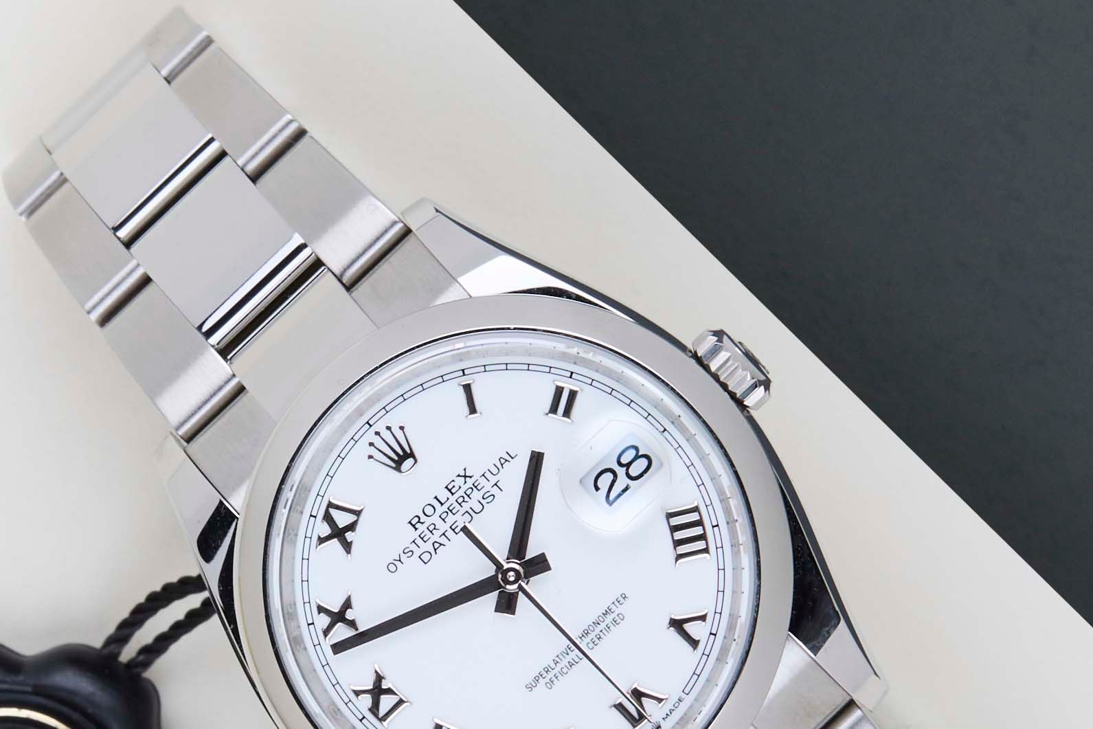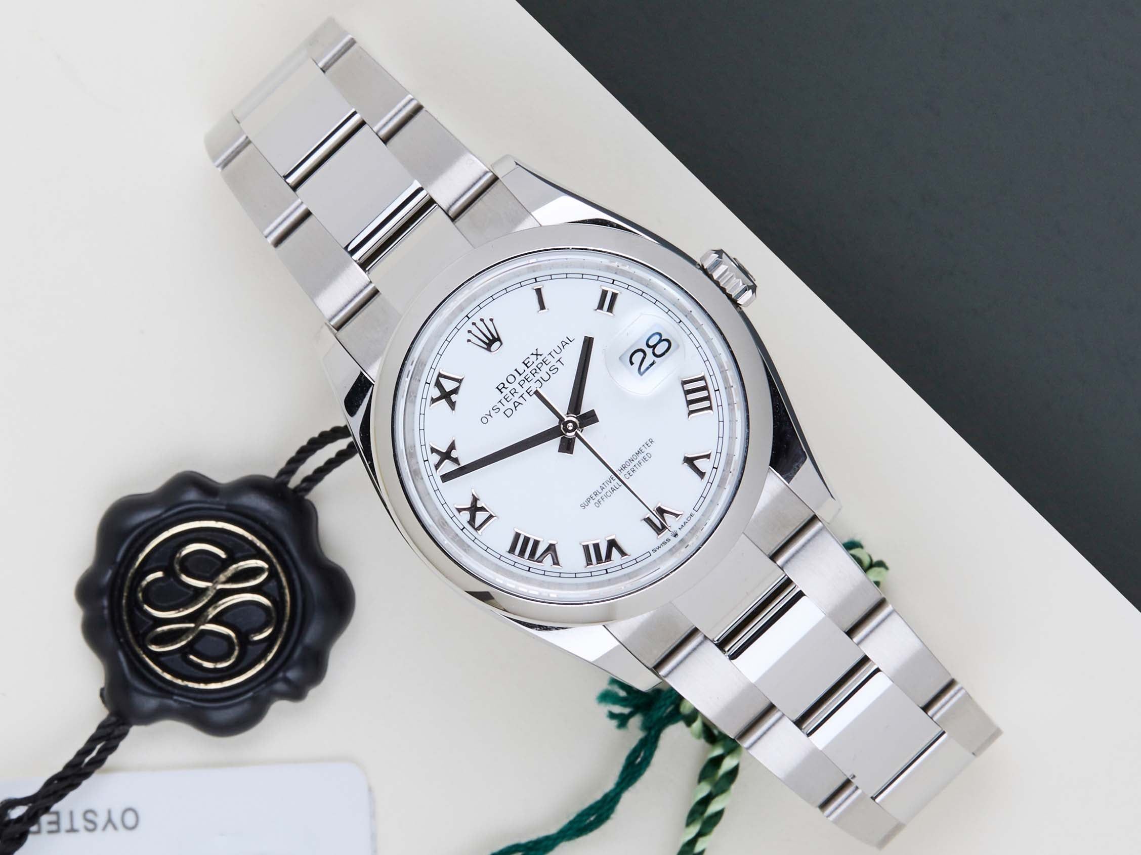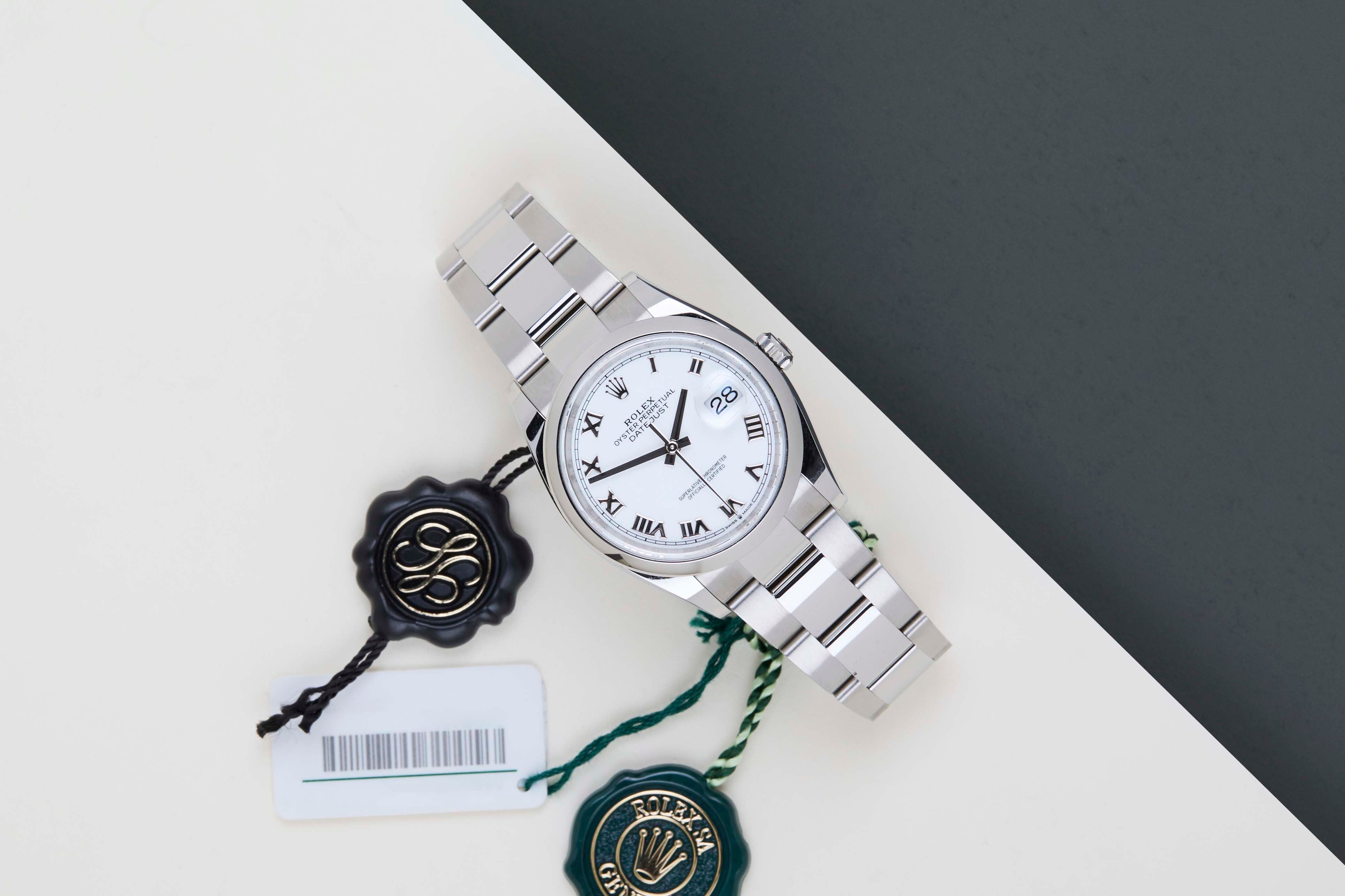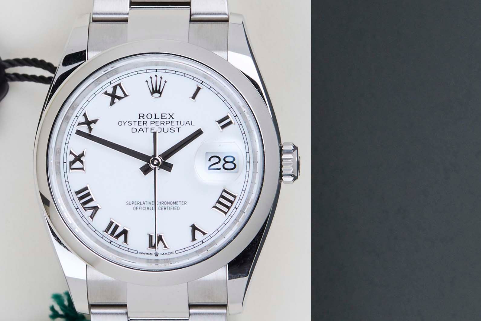 New & Unworn | Full Set | International Rolex Warranty Until April 2031 | Including Rolex White TagRolex introduced the original Datejust in 1945 to celebrate the company's 40th anniversary. Due to the various case sizes and materials, the Datejust has been ingrained in Rolex's history and remains incredibly popular for 75 years.This Rolex Datejust 'White Roman Dial - Oyster' was sold for the first time in April 2031.This Datejust is made of stainless steel and is fitted with a Oyster Bracelet, which is equipped with the Easylink. This extension, allows the wearer to either extend or shorten the bracelet by 5 millimetres, improving the wearability and usability of the watch.This Rolex Datejust 36 is in New & Unworn condition and comes with the original Rolex Warranty Card and Box. Furthermore, the watch still has worldwide Rolex Warranty until April 2031.