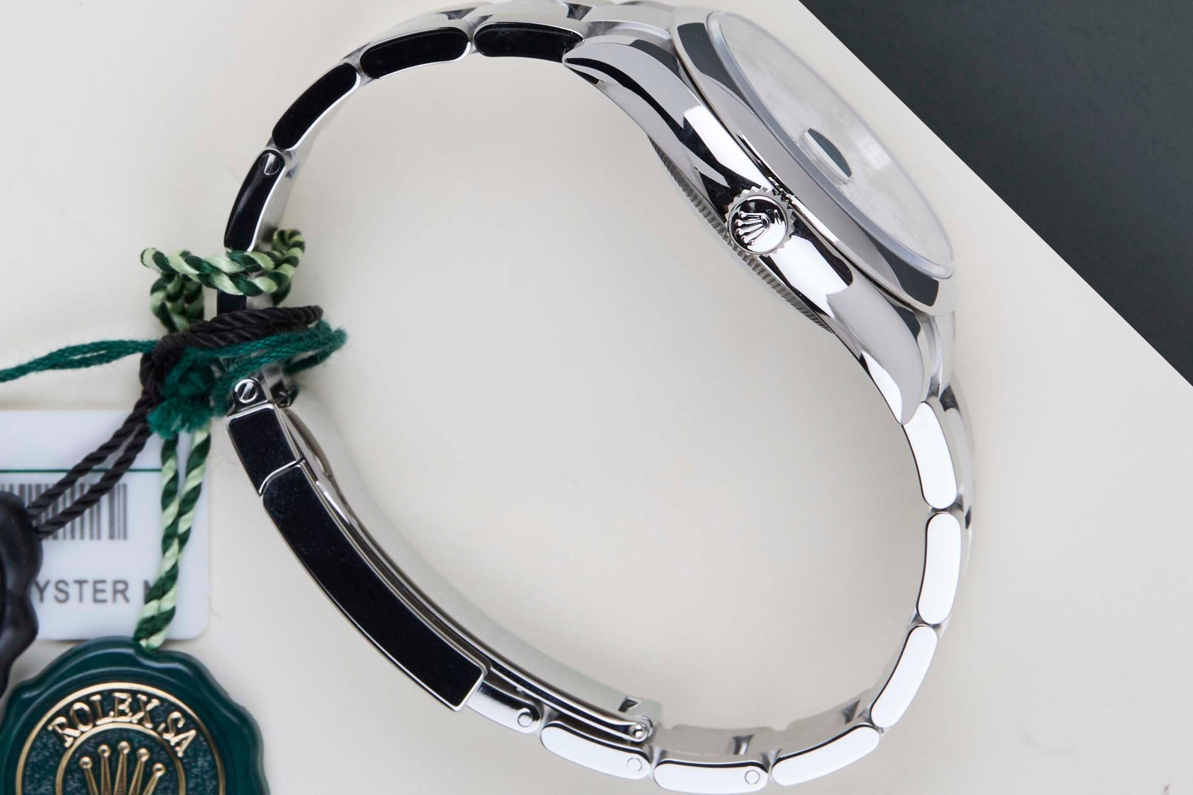 Questo Rolex Datejust 36 è in condizioni Nuovo & Mai Indossato e viene fornito con la Carta di Garanzia Rolex originale e la Scatola. Inoltre, l'orologio ha ancora la Garanzia Rolex valida in tutto il mondo fino ad Aprile 2031.