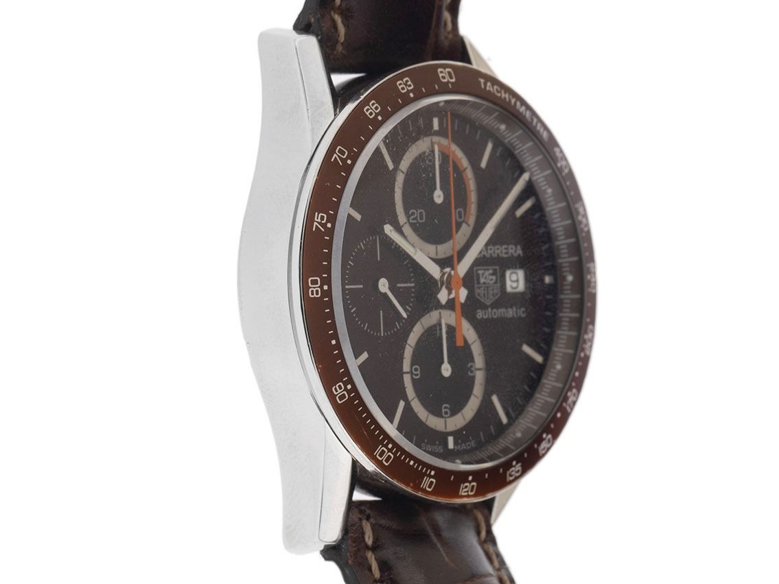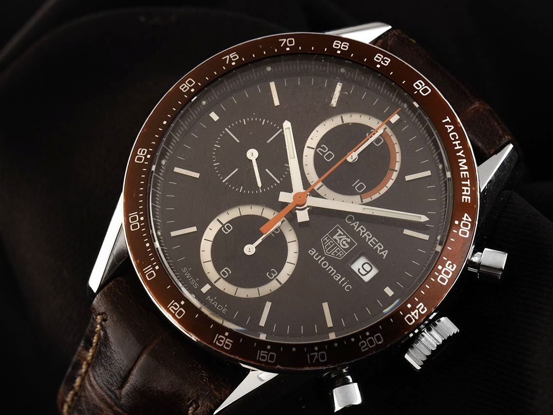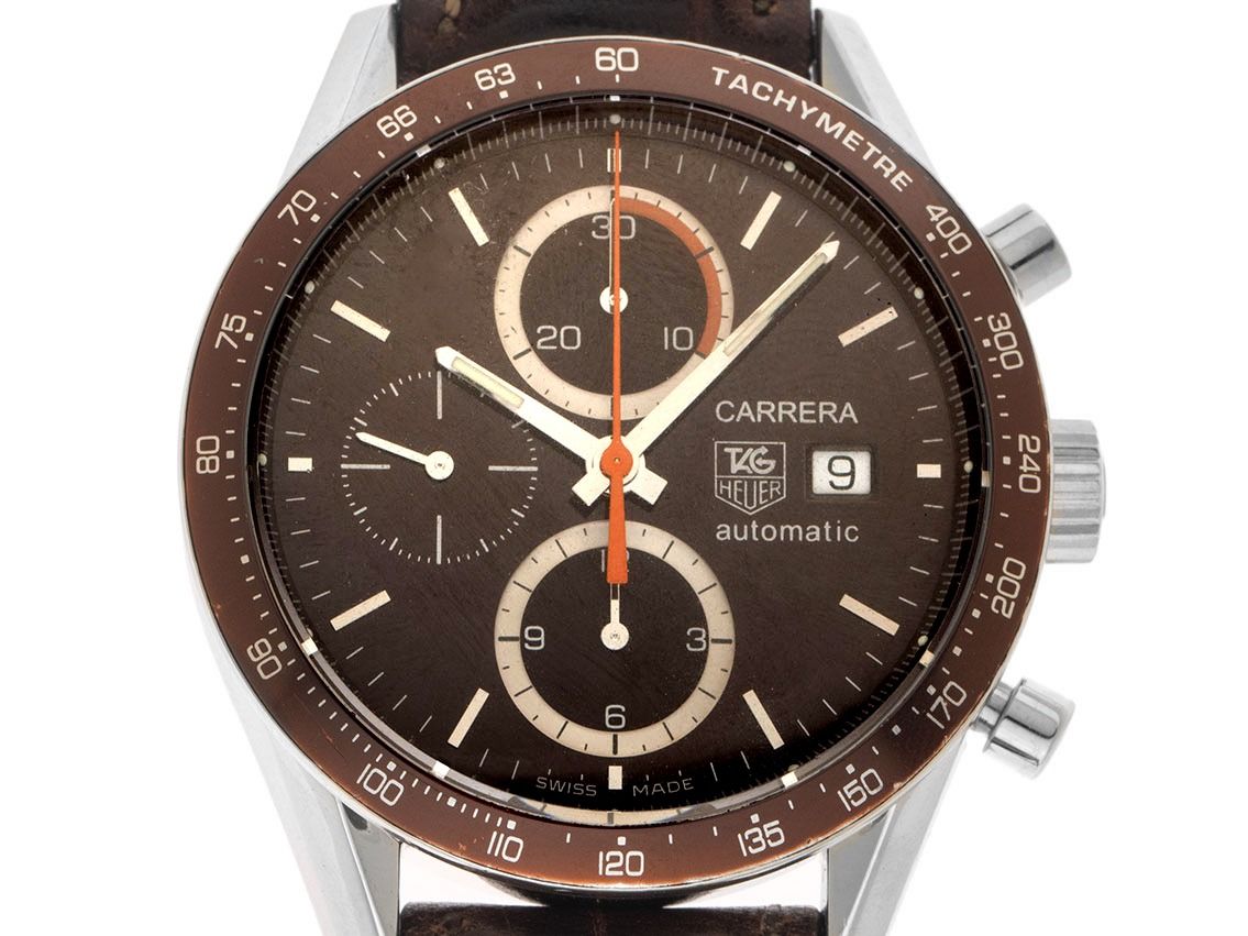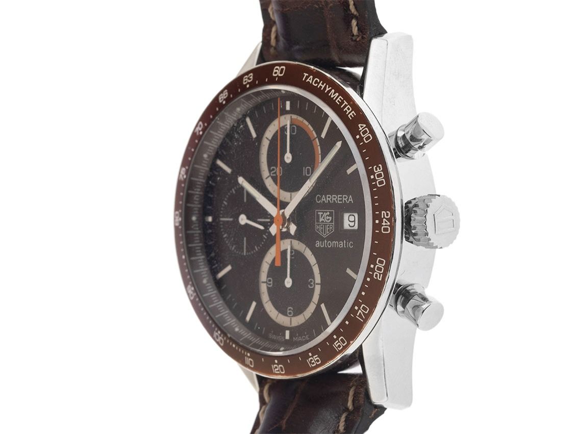 Tag Heuer Carrera Stahl Automatik Chronograph Armband Leder FaltschließeGehäuse Edelstahl poliert, Gehäusedurchmesser ohne Krone 41mm, Gehäusehöhe 16,0mm. Lünette Edelstahl mit braunem Inlay und Tachymeterskala. Armband Leder braun mit Ziernaht, Anstoßbreite 20mm, Sicherheitsfaltschließe Edelstahl mit Hersteller-Logo. Zifferblatt braun mit aufgesetzten Edelstahl Indexen und Edelstahl Zeigern. Uhrwerk Automatik, Chronograph, Tag Heuer Calibre 16 mit 25 Edelsteinen. Anzeige von Stunde und Minute über Zeiger aus der Mitte, kleine Sekunde mit Sekundenstopp zur sekundengenauen Einstellung der Uhrzeit bei 9 Uhr, Datumsanzeige mit Schnellverstellung bei 3 Uhr. Saphirglas kratzfest und bombiert. Krone geriffelt mit Hersteller-Logo. Boden Edelstahl verschraubt und graviert mit Saphirglas Sichtfenster. Gewicht der Uhr inklusive Armband 110g. Referenznummer: CV2013-3, ID: P291022000426HW-4300, Artikelnummer: 10000085658. Mit Gangkontrolle und kompletter äußerlicher Aufarbeitung von April 2026. Original Tag Heuer Box mit Umkarton und Watchregister Auszug von April 2026, The Watch Register Zertifikat / ohne Eintrag (Internationale Datenbank für verlorene oder gestohlene Uhren). Superschnäppchen. Original unpoliert, kann auf Wunsch kostenlos aufgearbeitet werden.