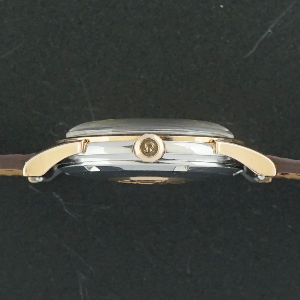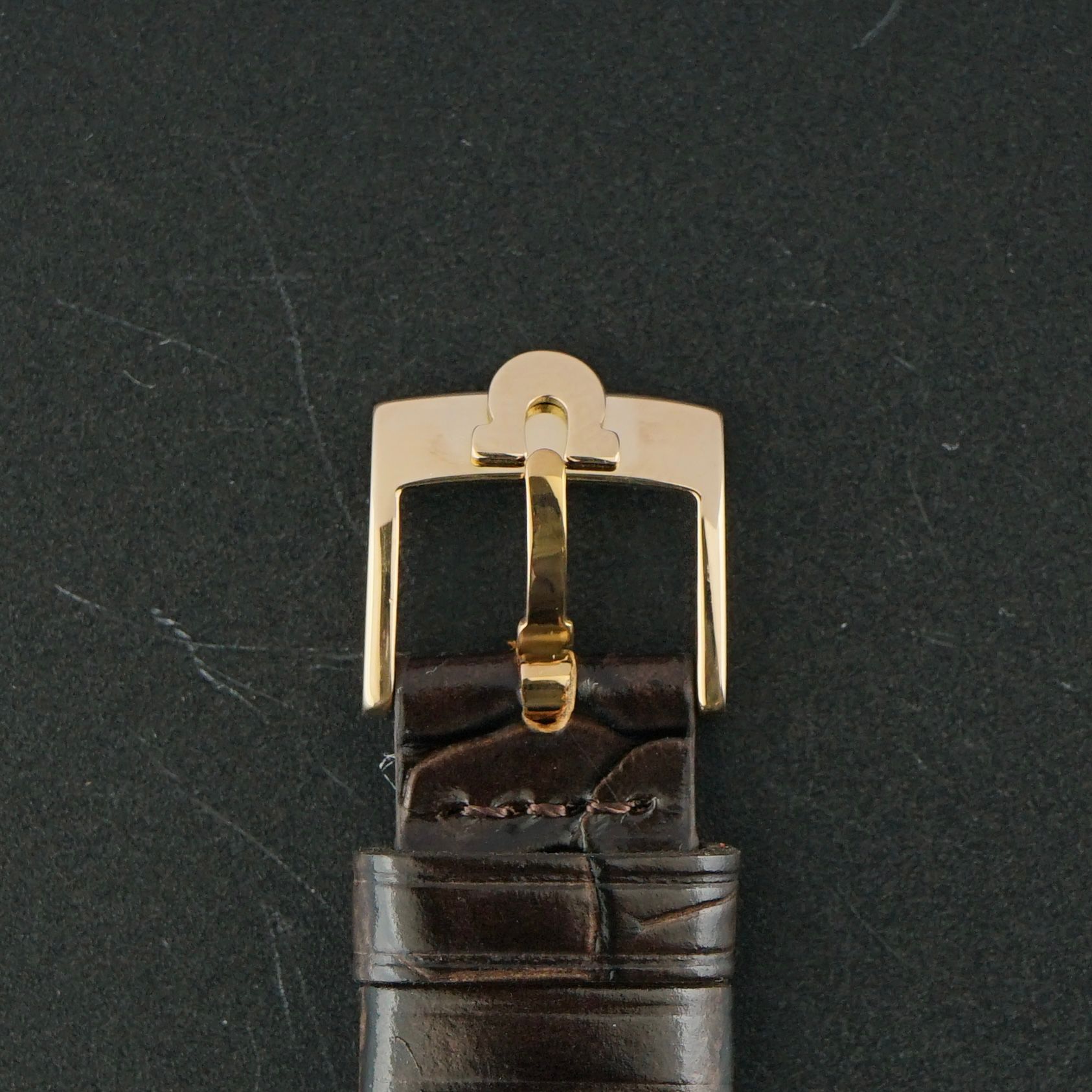 A Vintage Omega Constellation Pie Pan from 1961, featuring an originally white sunburst dial that has developed a full tropical patina over time, giving it a warm and unique character, complemented by elegant rose gold accents and the iconic pie pan design, the 34.5mm rose gold plated case remains in beautiful condition and pairs perfectly with the dial tones, powered by a caliber 551 automatic movement serviced in April 2026 and now running and functioning excellently, fitted with a top grain handmade chocolate brown crocodile embossed leather strap, this uncommon and highly attractive dress watch stands out for its originality, condition, and especially its distinctive patina, making it a strong and desirable piece for any serious vintage collectionYear of production: 1961