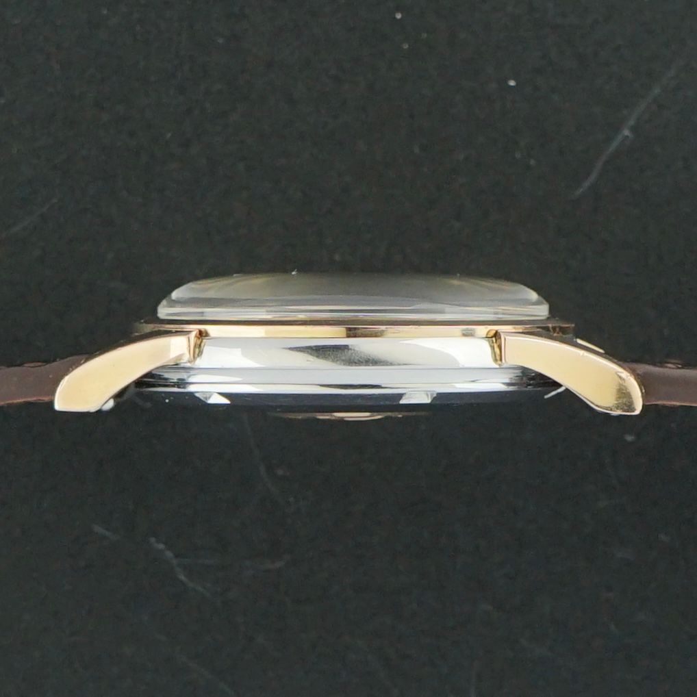 Un Omega Constellation Pie Pan vintage del 1961, con una originale quadrante solare bianco che ha sviluppato una patina tropicale completa nel tempo, conferendogli un carattere caldo e unico, completato da eleganti accenti in oro rosa e dal design iconico a forma di torta. La cassa placcata in oro rosa da 34,5 mm è in condizioni bellissime e si abbina perfettamente con le tonalità del quadrante, alimentata da un movimento automatico calibro 551, revisionato nell'aprile 2026 e ora in ottime condizioni di funzionamento, dotata di un cinturino in pelle di coccodrillo marrone cioccolato, fatto a mano e di alta qualità, questo orologio da dress poco comune e altamente attraente si distingue per la sua originalità, condizione e soprattutto per la sua patina distintiva, rendendolo un pezzo forte e desiderabile per qualsiasi collezione vintage seria.