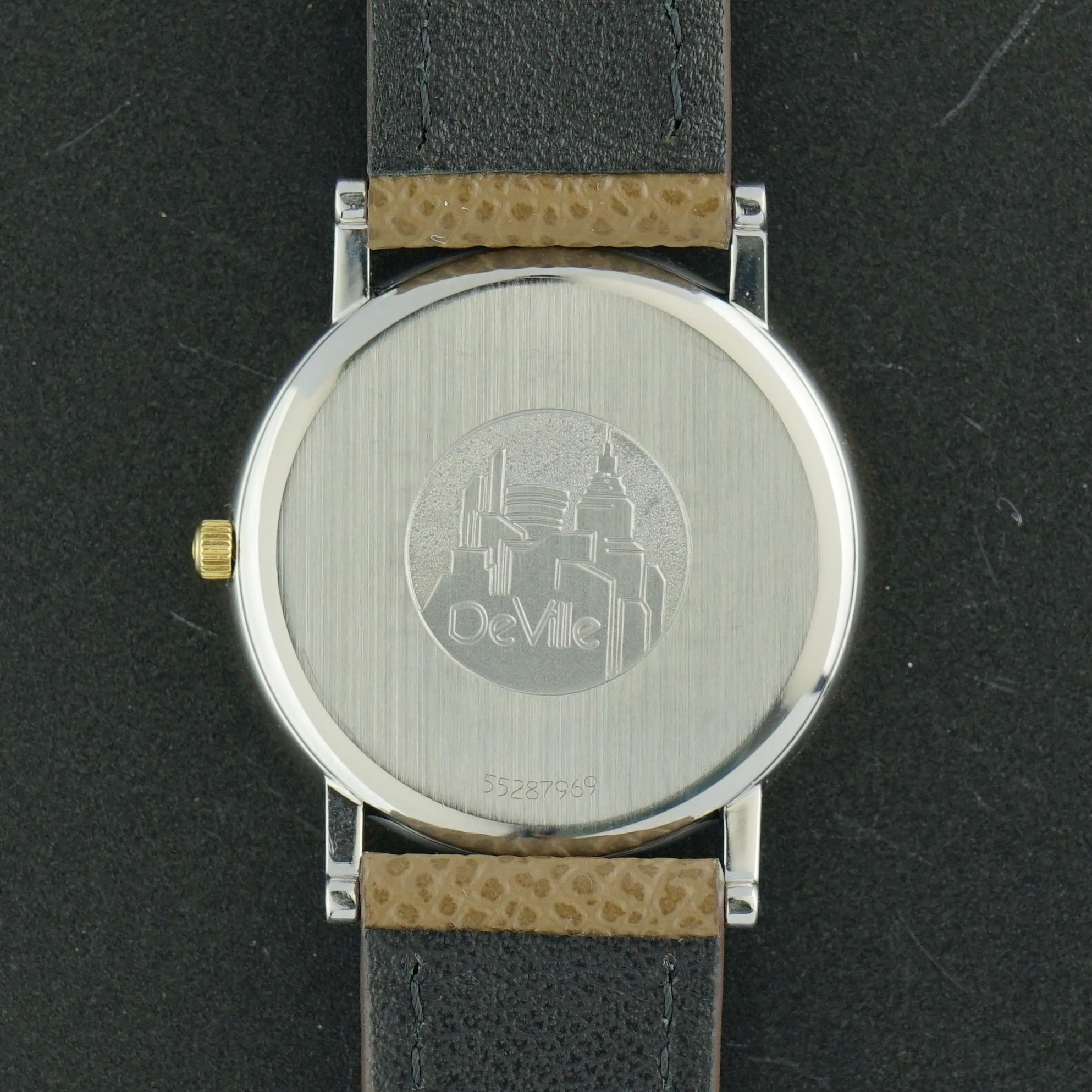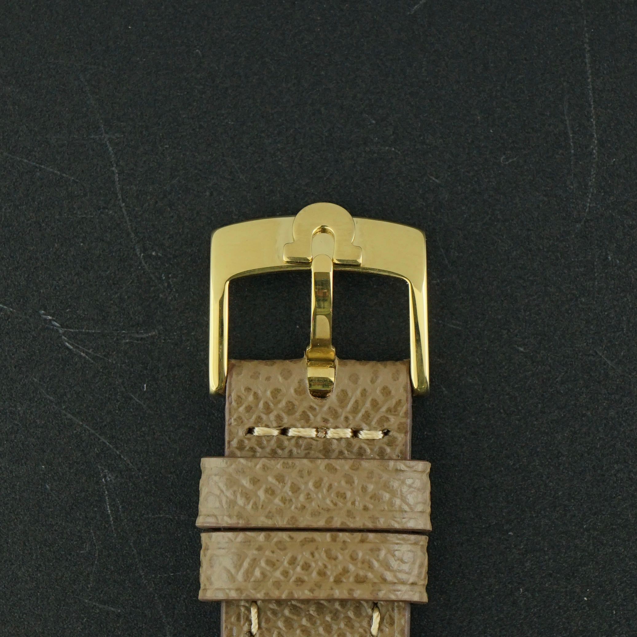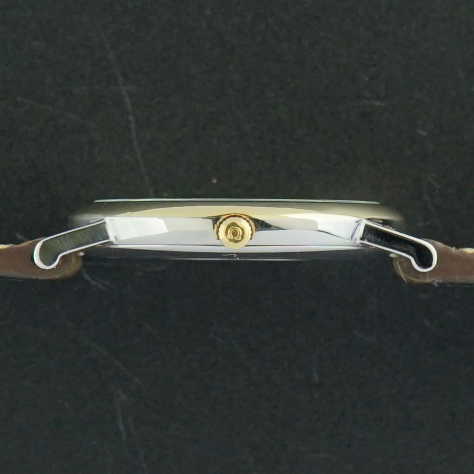 A beautiful vintage Omega De Ville from 1995, featuring an elegant white dial that remains in impeccable condition, complemented by refined golden accents throughout. The watch is fitted with golden leaf hands and golden hour markers, with the 6, 9, and 12 o’clock positions displayed as classic Roman numerals, adding to its timeless charm. A date window is positioned at 3 o’clock, powered by the recently overhauled caliber 1532 quartz movement, which now runs and functions excellently. Measuring 32.5mm in width and an very-slim 5.3mm in thickness, this piece offers a sophisticated and comfortable wrist presence. Entirely original except for the brand new tan brown leather strap, this De Ville would make a beautiful addition to any vintage watch collection.