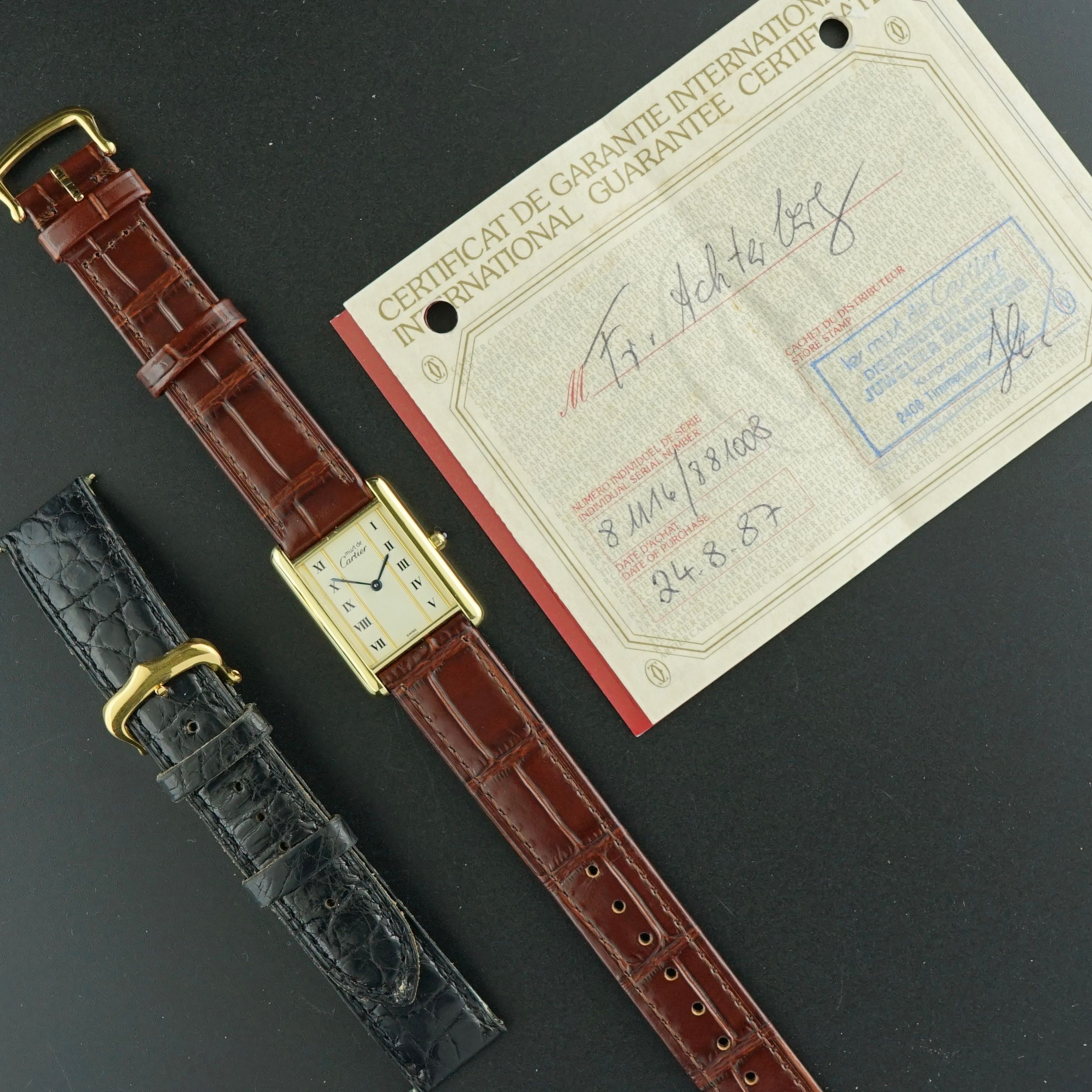 A Vintage Cartier Tank Vermeil Must LM from the 1980s, the large men’s size, featuring a beautiful dial with Roman numerals on the sides, classic blued hands and a blue ruby cabochon crown. Powered by a Cartier quartz movement that was overhauled in April 2026 and now runs and functions excellently. The watch comes on a brand new brown leather strap with crocodile motif made in France, and includes its original black crocodile leather strap. Accompanied by the original papers showing the purchase on August 24th 1987 at the Cartier dealer “Juwelier Mahlberg”, Germany. An incredible piece, complete and in amazing shape, with condition and originality that make it a fantastic find.