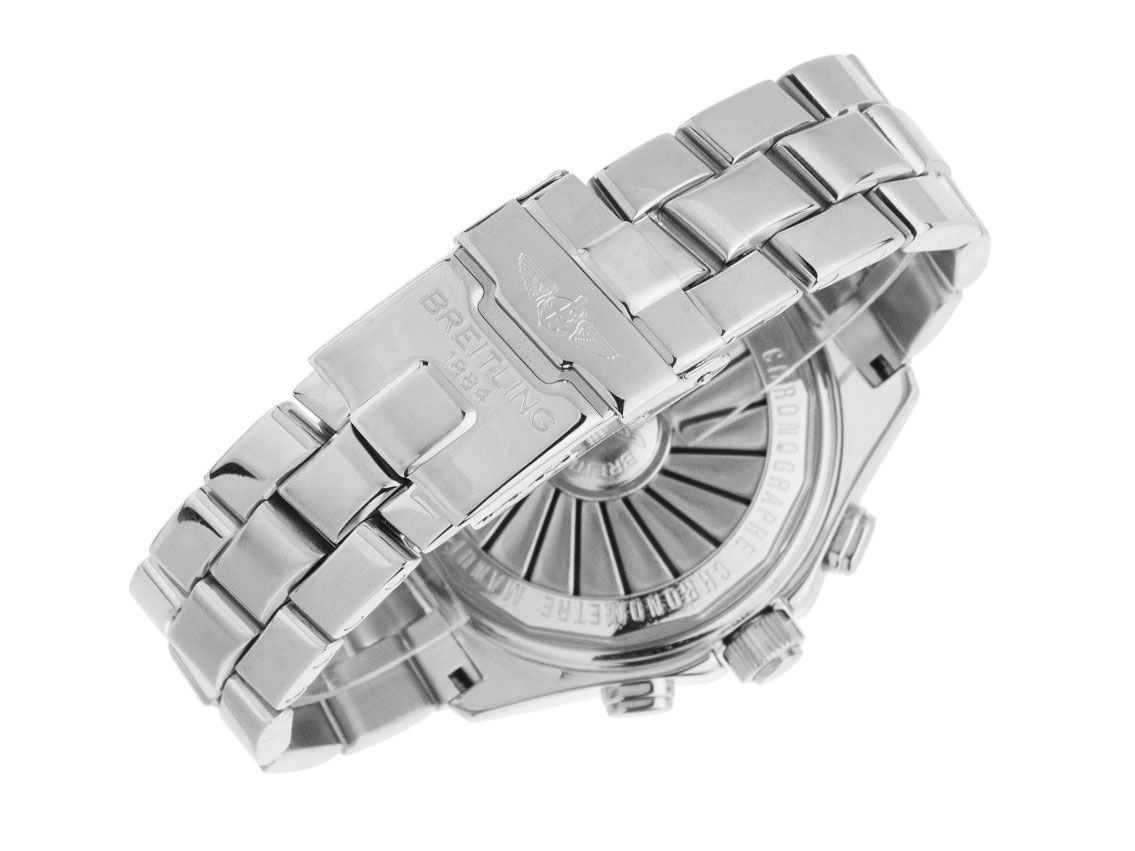 Cassa in acciaio inox lucido, diametro della cassa senza corona 44mm, altezza della cassa 16,0mm. Lunetta in acciaio inox con scala di 60 minuti, girevole su un lato. Bracciale in acciaio inox lucido, chiusura pieghevole di sicurezza in acciaio inox lucido con logo del produttore. Quadrante nero con numeri arabi, indici e lancette in acciaio inox. Movimento al quarzo, cronografo, cronometro con certificato, calibro di manifattura Breitling B 68. Visualizzazione analogica di ore, minuti e secondi tramite lancette centrali, visualizzazione digitale del calendario perpetuo, secondo fuso orario, funzione sveglia, conto alla rovescia e ora mondiale UTC. Vetro zaffiro antigraffio. Corona con protezione laterale e logo del produttore. Fondello in acciaio inox avvitato e inciso con design a turbina. Peso dell'orologio incluso il bracciale 180g, lunghezza del bracciale incluso la cassa 170mm, vedere immagine numero 7. Numero di riferimento: A68362, numero di cassa: 115XXX, ID: P290524000426HW-4500, numero articolo: 10000085651. Con controllo del movimento, nuova batteria e completa revisione esterna di aprile 2026.