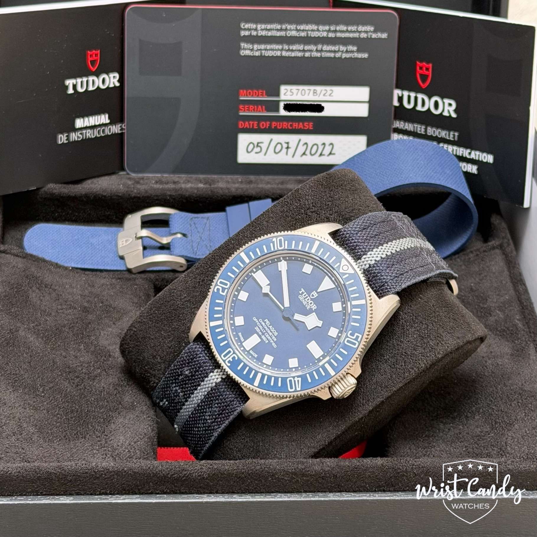 marca e modello • Tudor Pelagos FXD Marine Nationale riferimento • 25707B/22 diametro • 42 mm quadrante • blu cinturino • tessuto età • 2022 incluso • set completo condizione • come nuovo garanzia • garanzia internazionale Tudor fino al 2027
