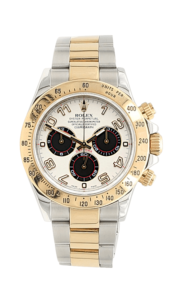 For sale at Debonar Watches: pre-owned Rolex Daytona 116523 in excellent conditions, full set, with a white dial with black subdials (usually referred to as "Panda" dial). With its two-tone coloring, steel and 18k gold, it has arguably the most versatility compared to its all steel and all gold stable mates. This chronograph was designed to be the ultimate timing tool for endurance racing drivers. More than 50 years after its creation, the Cosmograph Daytona remains in a class of its own among sport chronographs and continues to transcend time.Synonymous with excellence and reliability, this Rolex is designed for everyday wear, and depending on the model, perfectly suited for a wide range of sports and other activities.The Daytona is designed for those with a passion for driving and speed.Story:While the Daytona is now widely loved and worn by everyone from the newbie collector to your boss’s boss, the Rolex Daytona is firstly a racing watch.It was made for motorsport professionals and was named after the famous Daytona Beach in Florida, where numerous land speed records were broken.Introduced in 1963, the reference 6239 Daytona was the first Rolex chronograph with a tachymeter bezel that allowed its wearer to measure the speed of an object. The watch gained traction in the racing world but did not gain widespread acceptance until later, thanks in part to a handsome actor/race car driver named Paul Newman. Born in the late '80s, this reference became the first Cosmograph to offer a combination platter of metals.Over the years, the model has seen various updates and has become one of the most desirable watch models in the world. BRAND ROLEX MODEL DAYTONA REFERENCE 116523 CASE MATERIAL STEEL/GOLD MOVEMENT AUTOMATIC DIMENSION 40 MM DIAL PANDA BEZEL GOLD CRYSTAL SAPPHIRE BRACELET TYPE BRACELET BRACELET MATERIAL STEEL/GOLD BRACELET LENGHT 17 CM ORIGINAL BOX YES ORIGINAL PAPERS YES YEAR APPROX. '00s-'10s CONDITION EXCELLENT