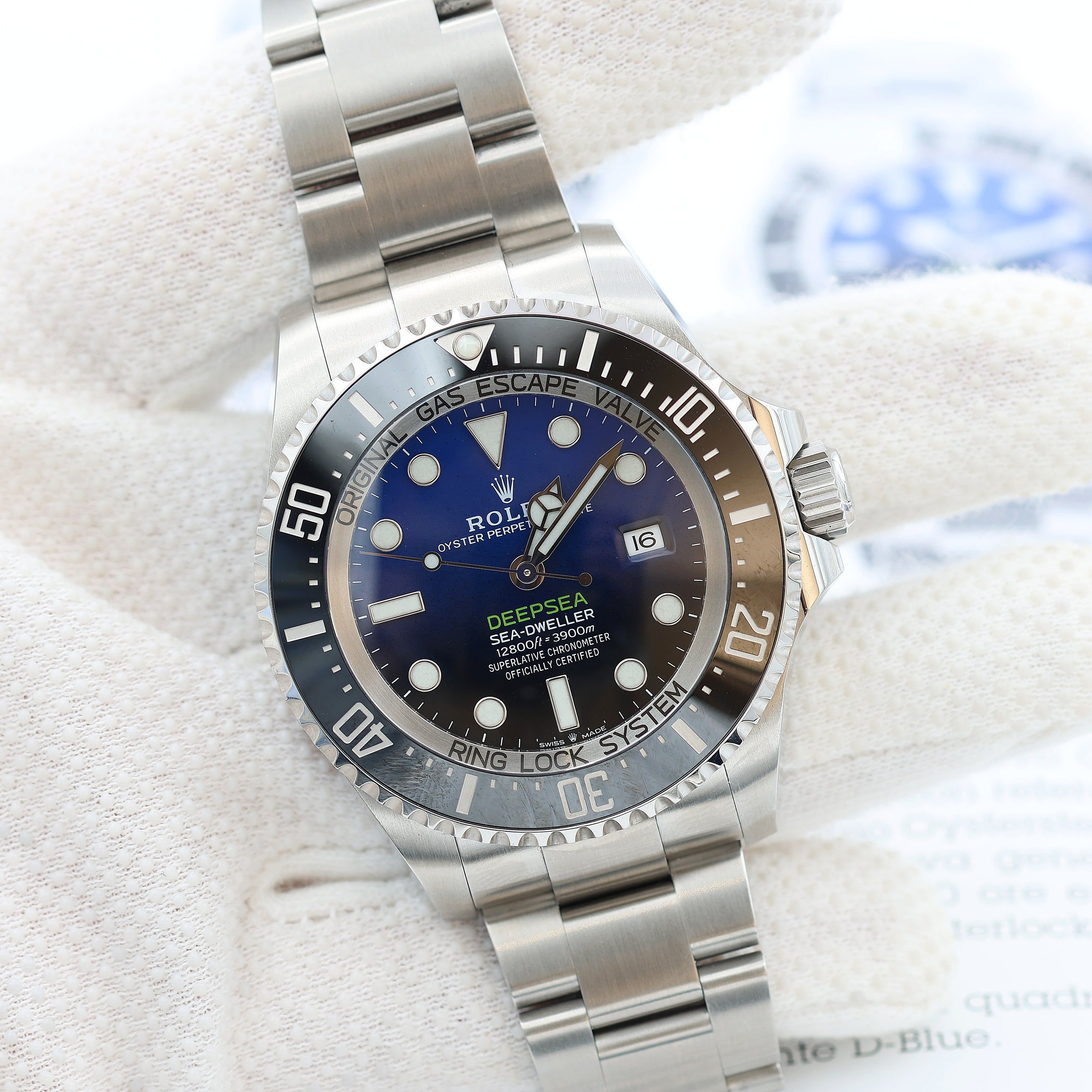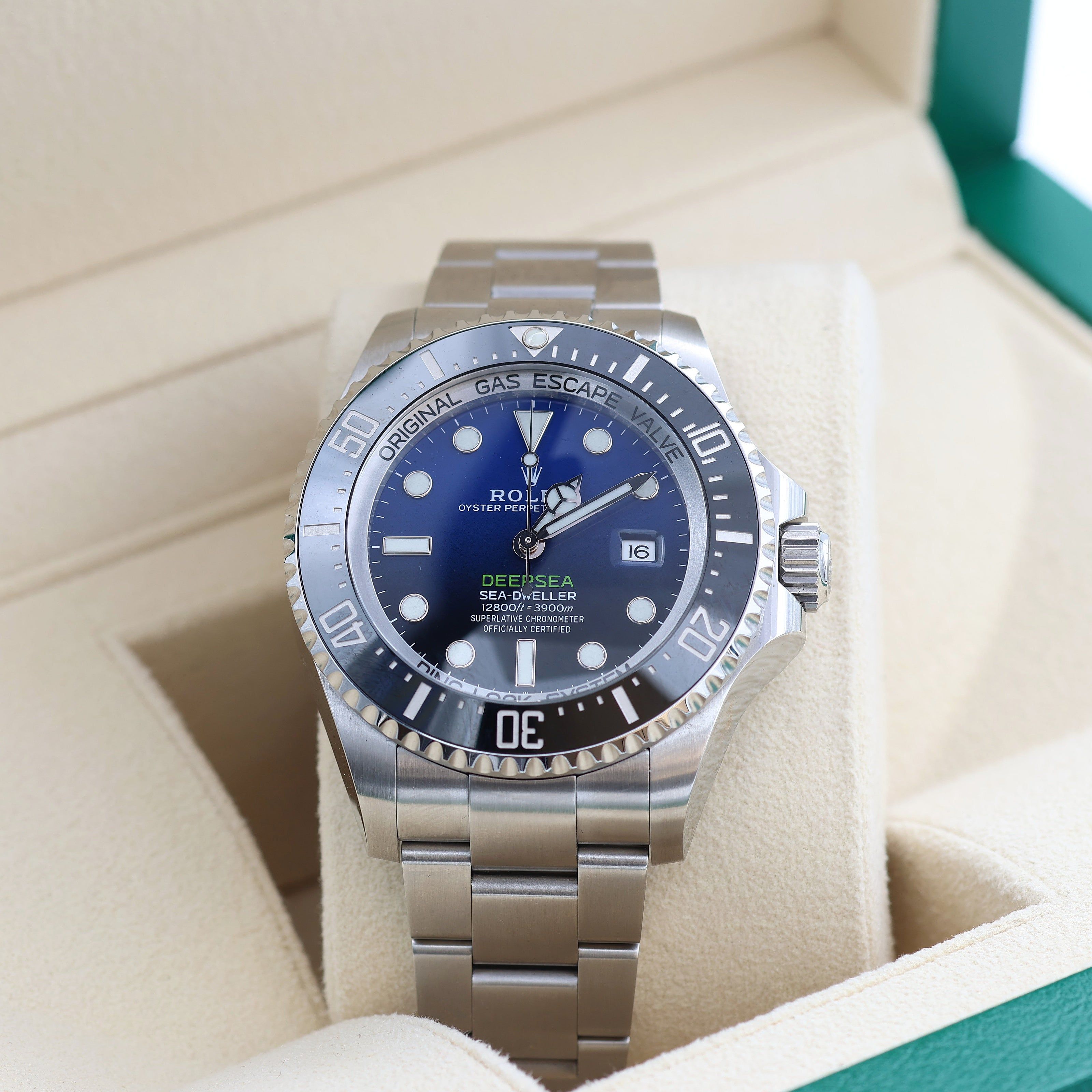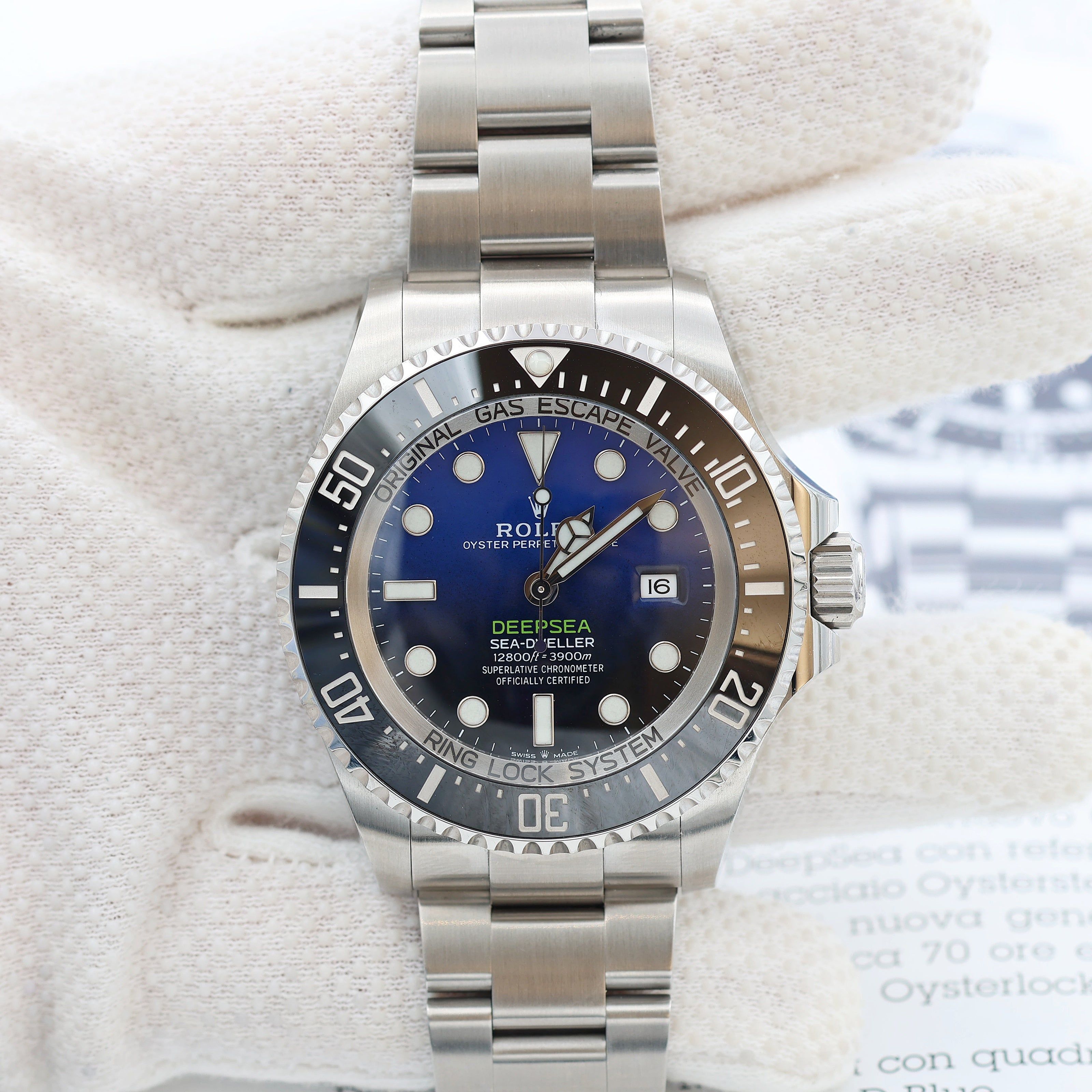 For sale: pre-owned Rolex Sea-Dweller ref. 126660 DeepSea dial, with full set. This dial is a special edition, unveiled in 2014 to commemorate James Cameron's 2012 expedition into the Mariana Trench.The oyster perpetual rolexDeepsea in oystersteel with a cerachrom bezel insert in black ceramic and an oyster bracelet.Rolex seemed to want the new for 2018 reference 126660 to look similar to the outgoing 116660, so it kept one of the original Deepsea’s most controversial features. That is a silver rehaut ring around the dial which contains two phrases being “Original Gas Escape Valve” (referring to the automatic helium release valve) and “Ring Lock System,” which refers to how the case is constructed to ensure such high levels of water resistance. The silver ring itself is actually part of the Ring Lock and is a “high-performance nitrogen-alloyed stainless steel ring.” When writer, director, and adventurer James Cameron reached the depth of 10,908 meters, on the floor of the Challenger Deep (the deepest point in the ocean) at the bottom of the Mariana Trench, he had the Rolex Deepsea Challenge, a prototype watch that could withstand water pressure to a depth of 15,000 meters, was strapped on the mechanical arm as well as on Cameron’s wrist. BRAND ROLEX MODEL SEA-DWELLER DEEPSEA REFERENCE 126660 CASE MATERIAL STEEL MOVEMENT AUTOMATIC DIMENSION 44 MM DIAL BLACK BEZEL CERAMIC CRYSTAL SAPPHIRE BRACELET TYPE OYSTER BRACELET MATERIAL STEEL BRACELET LENGHT 19 CM ORIGINAL BOX YES ORIGINAL PAPERS YES YEAR 2018 CONDITION EXCELLENT