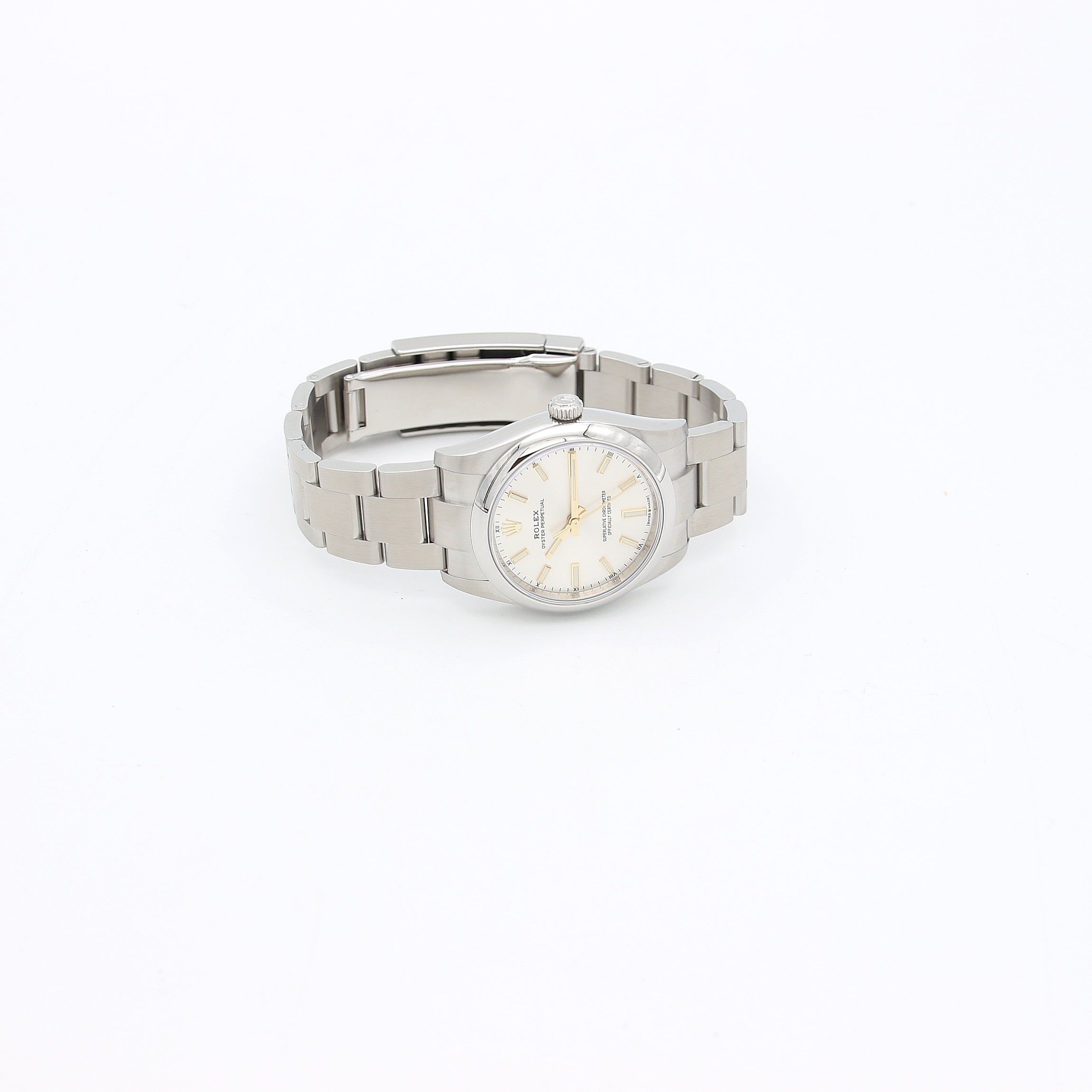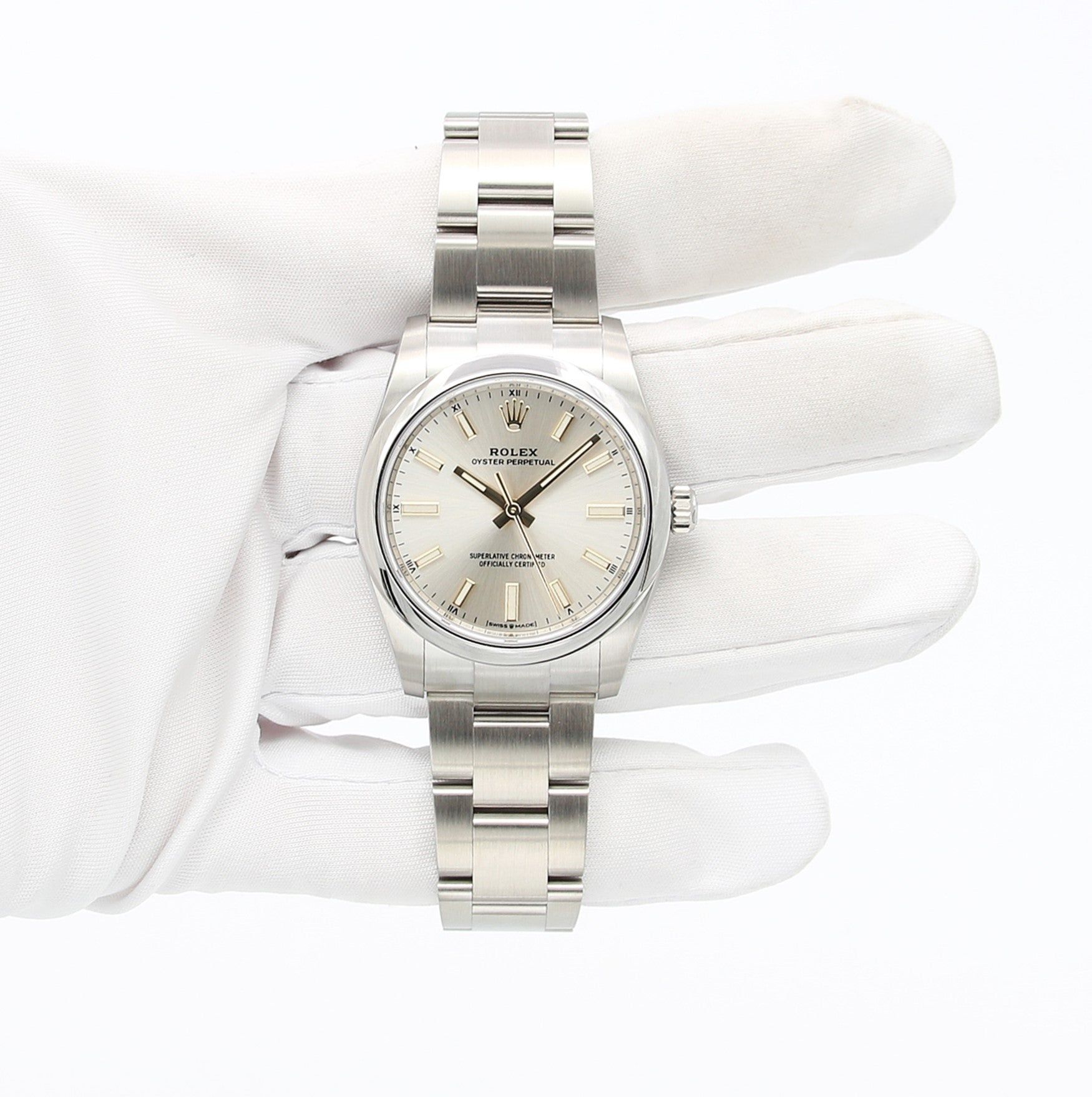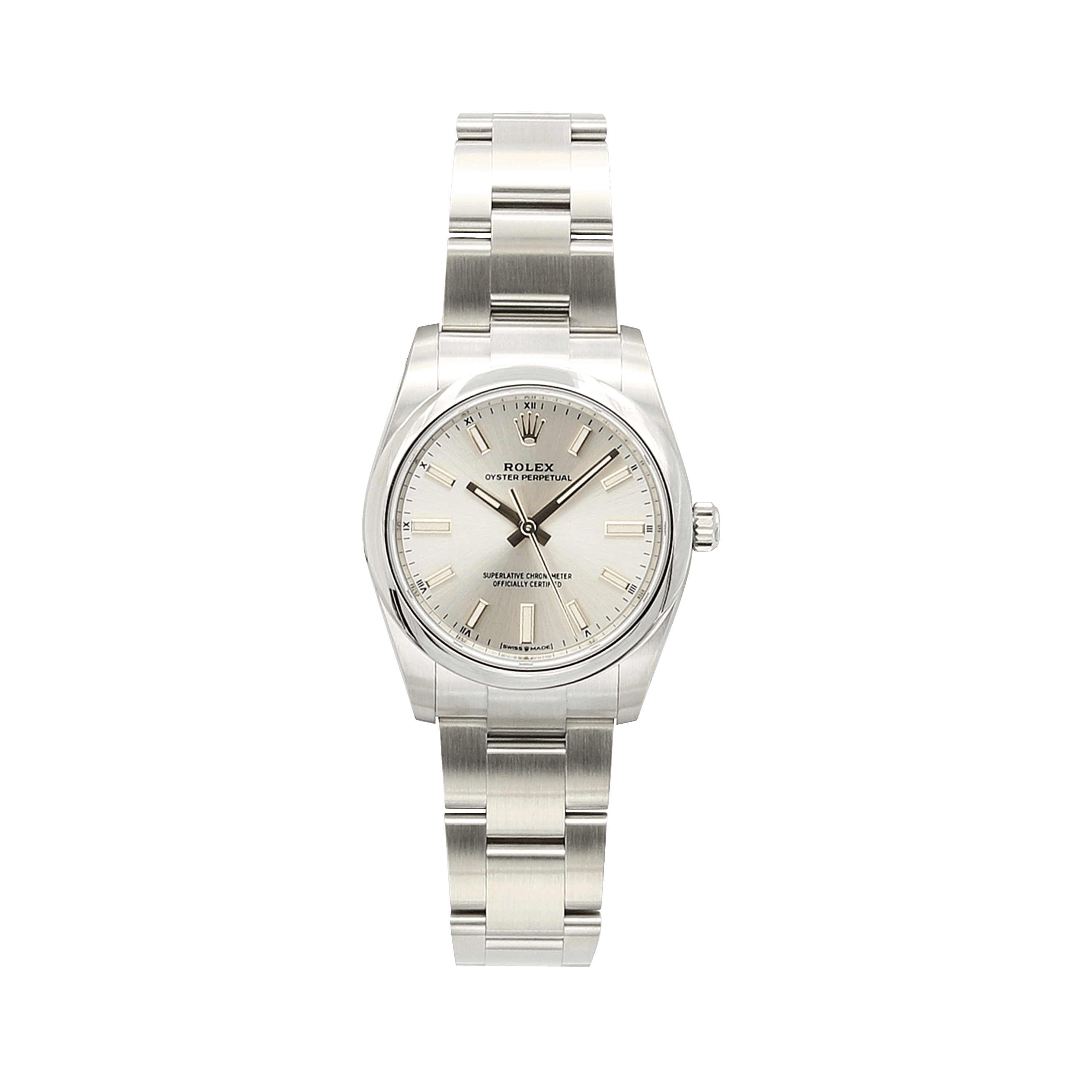 For sale at Debonar Watches: pre-owned Rolex Oyster Perpetual 124200, full set, from 2021.The Rolex Oyster Perpetual 34mm (reference 124200) is a Superlative Chronometer water resistant to 100m. The watch comes fitted on a fully brushed steel Oyster bracelet with Easylink 5mm extension link. The case and bracelet are made from Rolex's Oystersteel.The watch features hours, minutes, and seconds functionality.The Oyster Perpetual 34 offers a screw-down crown, a domed bezel, and a sapphire crystal. BRAND ROLEX MODEL OYSTER PERPETUAL REFERENCE 124200 CASE MATERIAL STEEL MOVEMENT AUTOMATIC DIMENSION 34 MM DIAL SILVER BEZEL STEEL CRYSTAL SAPPHIRE BRACELET TYPE OYSTER BRACELET MATERIAL STEEL BRACELET LENGHT 18 CM ORIGINAL BOX YES ORIGINAL PAPERS YES YEAR 2021 CONDITION EXCELLENT/NEW
