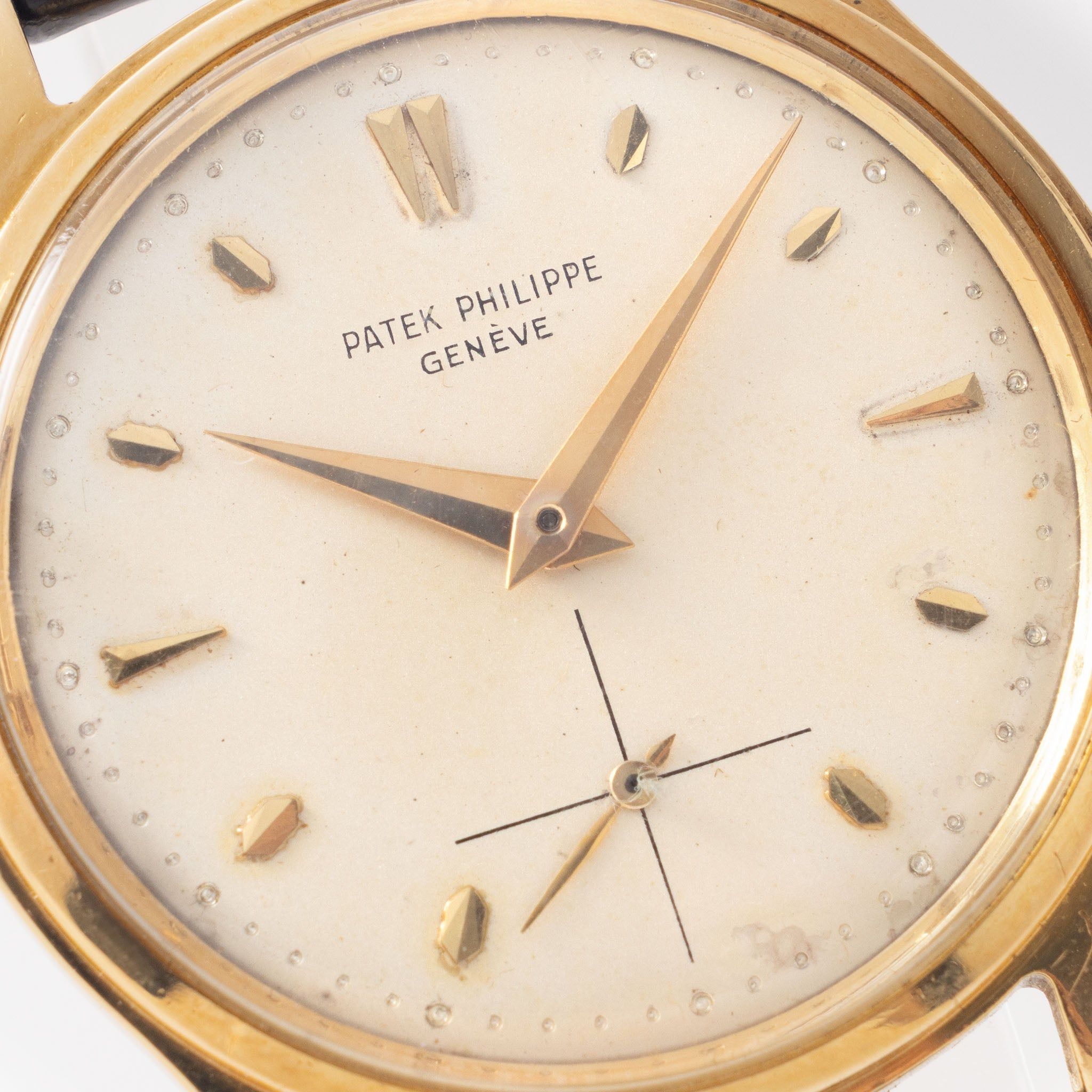 Describing a watch as "timeless" is easy—finding one that truly lives up to the word is something else entirely. We believe this Calatrava is just that. It perfectly embodies the essence of timeless design and stands as one of the most versatile timepieces you could own. Striking in its simplicity, it showcases all the hallmarks of Patek Philippe’s most iconic collection—elegant, understated, and with just the right touch of boldness. The yellow gold case remains in outstanding condition, with sharp lines and crisp definition across the 35mm profile. On the reverse, the hexagonal, screw-down caseback features a beautifully hand-engraved “W.D.”—a personal touch that adds character. The silver grene-finish dial is a study in refined craftsmanship, with hand-applied yellow gold hour markers, a distinctive “dot-dot” minute track, and a crosshair small seconds subdial. The non-luminous dauphine hands, also in yellow gold, complete the elegant aesthetic. This piece is fitted with its original Patek Philippe leather strap and 18k gold buckle—both in excellent condition. It’s powered by the hand-wound Calibre 12-400, a movement known for its precision and reliability. The watch has been fully serviced expert watchmaker and is running beautifully. This is a classic in every sense—an enduring design from one of the greatest watchmakers in history. Don’t let this opportunity pass you by. Get in touch and make this timeless piece yours. Specifications: - Patek Philippe Calatrava Ref. 2509J- 35mm 18k yellow gold case , with hexagonal screw back- Movement no.72xxxx Case no 67xxxx- Dates to the mid-1950s- Champagne /grené dial with hand-finished hour markers , small running seconds- Calibre 12-400 manual-wind movement- Patek Philippe leather strap and 18 k yellow gold PP pin buckle- Fully serviced by our watchmaker- One-year mechanical warranty- Free worldwide FedEx Priority shipping