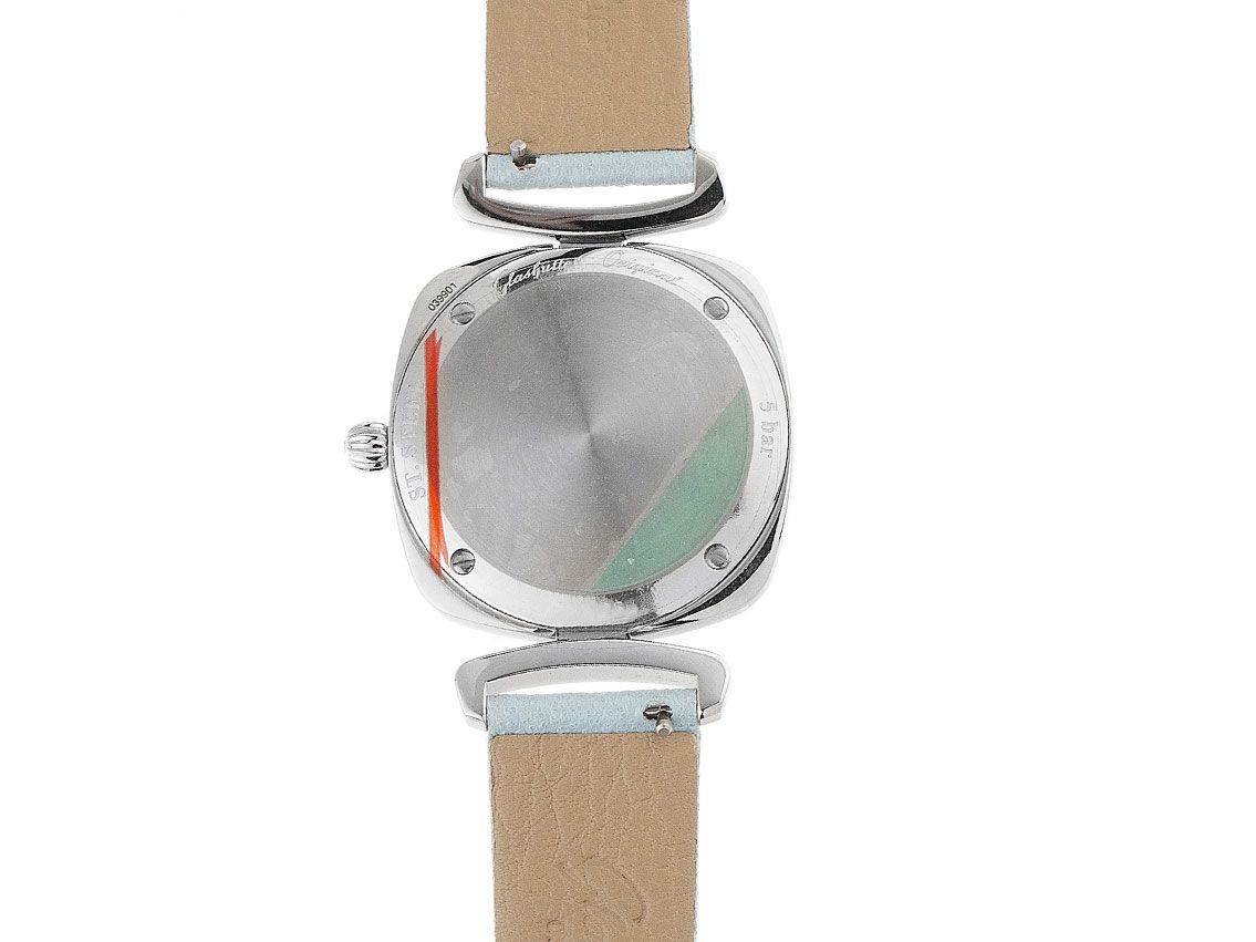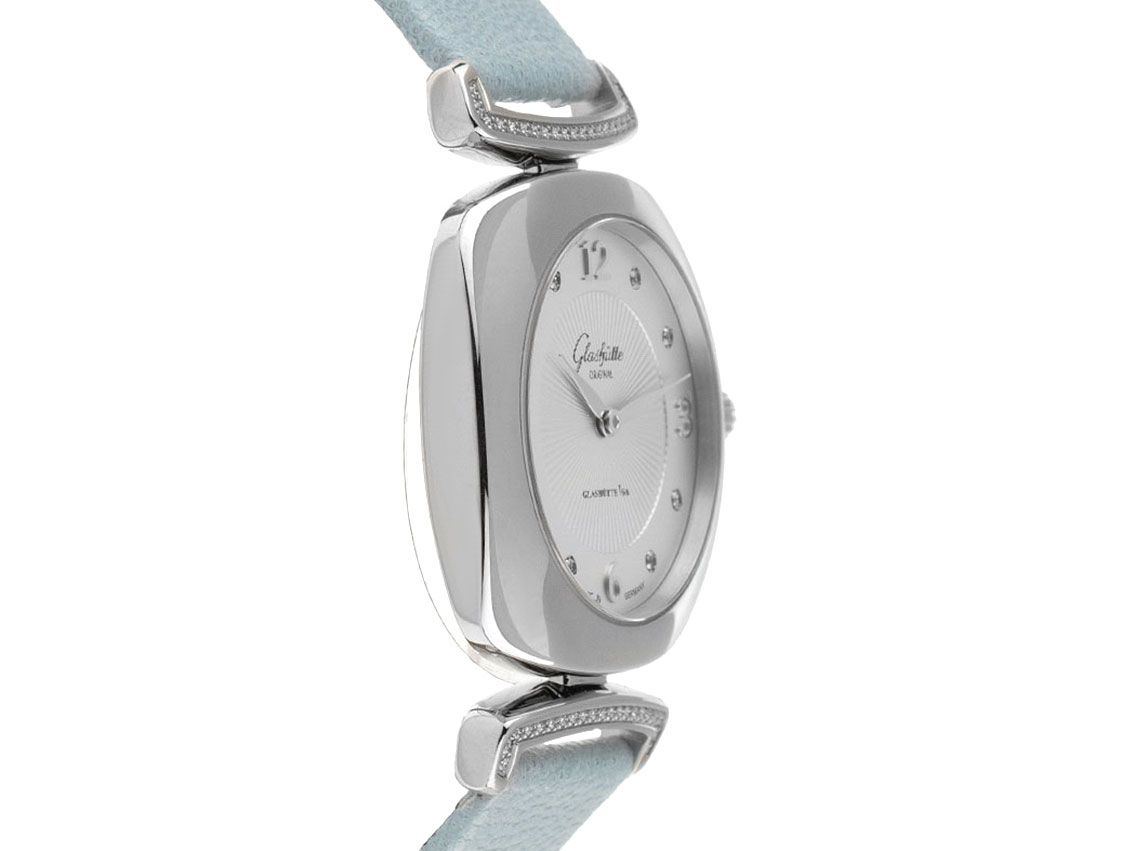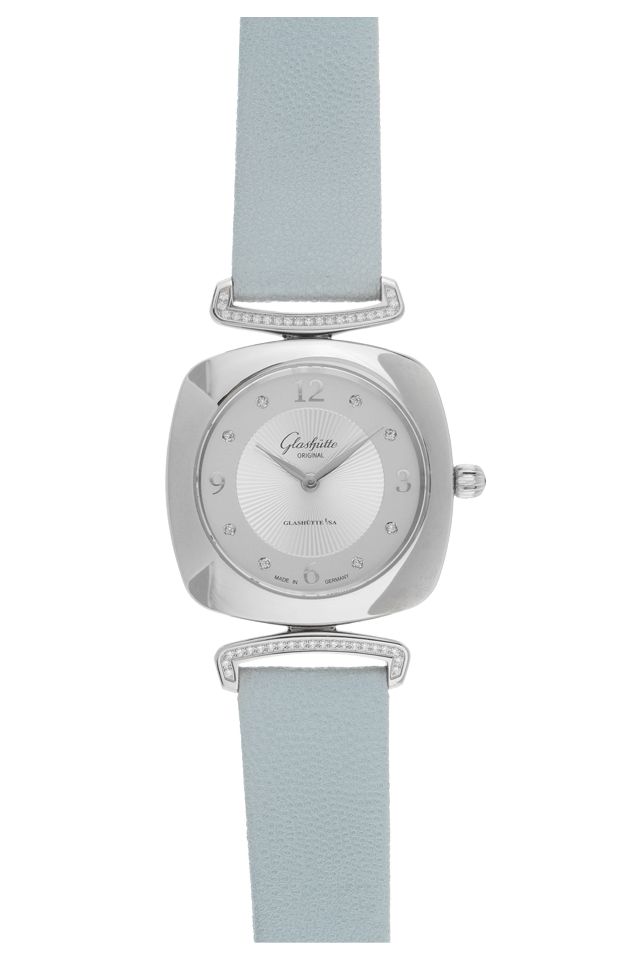 Glashütte Original Pavonina Stahl Diamanten Quarz Armband Textil Leder Faltschließe Gehäuse Edelstahl poliert, Anstöße mit Brillanten besetzt, zusammen ca. 0,14ct TW-VVSI (feines Weiß mit sehr sehr kleinen Einschlüssen), quadratisch, Gehäusemaße ohne Krone 31x31mm, Gehäusehöhe 7,5mm. Glashütte Original Armband Leder hellblau, Anstoßbreite 16mm, Doppelfaltschließe Edelstahl mit Hersteller-Logo. Zifferblatt silber galvanisiert und guillochiert mit rhodinierten arabischen Ziffern und Diamant Indexen sowie rhodinierten Edelstahl Zeigern. Uhrwerk quarzgesteuert, Manufakturkaliber Glashütte Original 03-02. Anzeige von Stunde und Minute über Zeiger aus der Mitte. Saphirglas gewölbt und kratzfest. Krone mit Brillant, ca. 0,03ct TW-VVSI (feines Weiß mit sehr sehr kleinen Einschlüssen). Boden Edelstahl 4-fach verschraubt und graviert. Gewicht der Uhr inklusive Armband 46g. Wasserdicht bis 5 ATM. Referenznummer: 1-03-02-12-12-35, ID: ST116083201020H-7300, Artikelnummer: 10000054986. Original Glashütte Original Box und Garantie Papiere von 2022, Full Set. Ungetragen. Lieferzeit sofort.