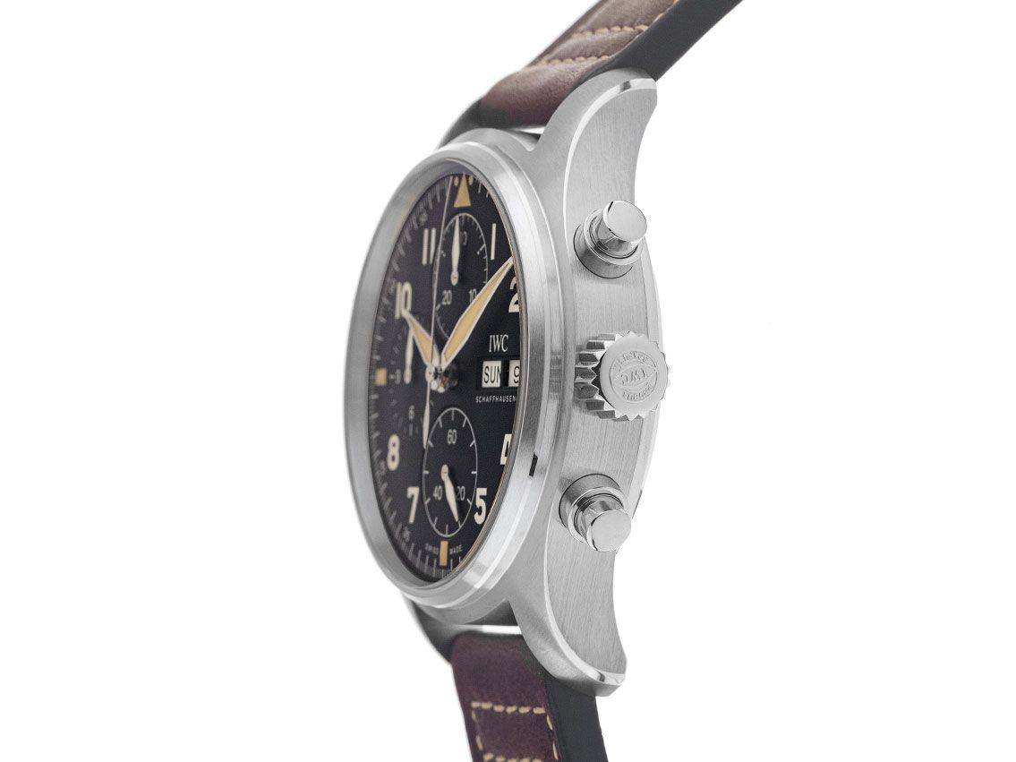 IWC Pilot´s Watch Spitfire Stahl Automatik Chronograph Armband LederGehäuse Edelstahl satiniert, Gehäusedurchmesser ohne Krone 41mm, Gehäusehöhe 15,3mm. Lünette Edelstahl satiniert. Armband Leder braun mit Ziernaht, Anstoßbreite 20mm, IWC Stiftschließe Edelstahl mit Hersteller-Logo. Zifferblatt schwarz mit arabischen Leuchtziffern und Indexen sowie Leuchtzeigern. Uhrwerk Automatik, Chronograph, Manufakturkaliber IWC 69380 mit 33 Edelsteinen, Gangreserve ca. 46 Stunden. Anzeige von Stunde und Minute über Zeiger aus der Mitte, kleine Sekunde mit Sekundenstopp zur sekundengenauen Einstellung der Uhrzeit bei 6 Uhr, Datums- und Wochentagsanzeige in Englisch mit Schnellverstellung bei 3 Uhr. Saphirglas kratzfest und gewölbt. Krone verschraubbar mit Hersteller-Logo. Boden Edelstahl verschraubt und graviert. Gewicht der Uhr inklusive Armband 109g. Wasserdicht bis 6 ATM. Referenznummer: IW387903, ID: ST1160118241024H-5600, Artikelnummer: 10000076700. Original IWC Box mit Umkarton und Garantie Papiere von September 2024, Full Set. Ungetragen. Lieferzeit sofort.