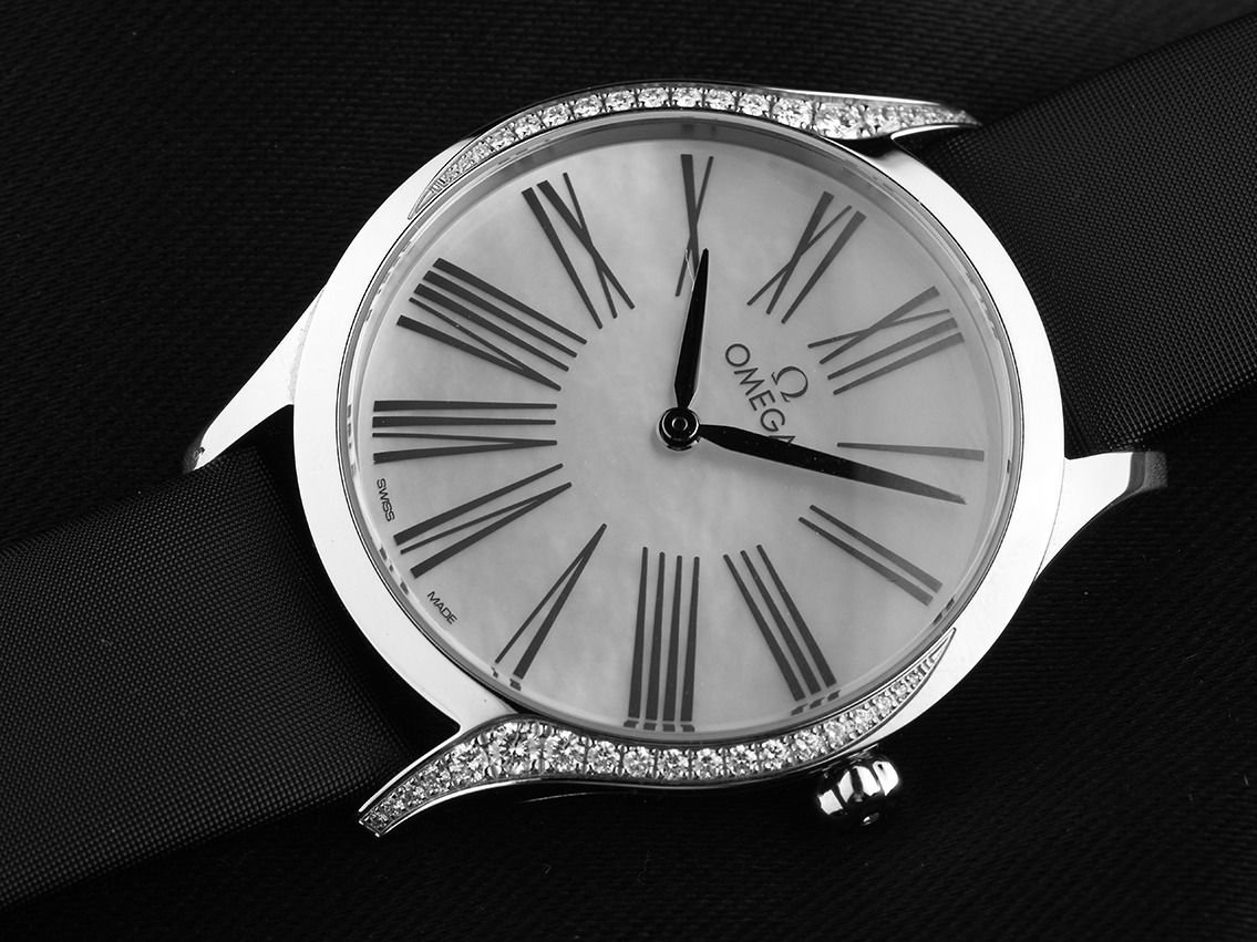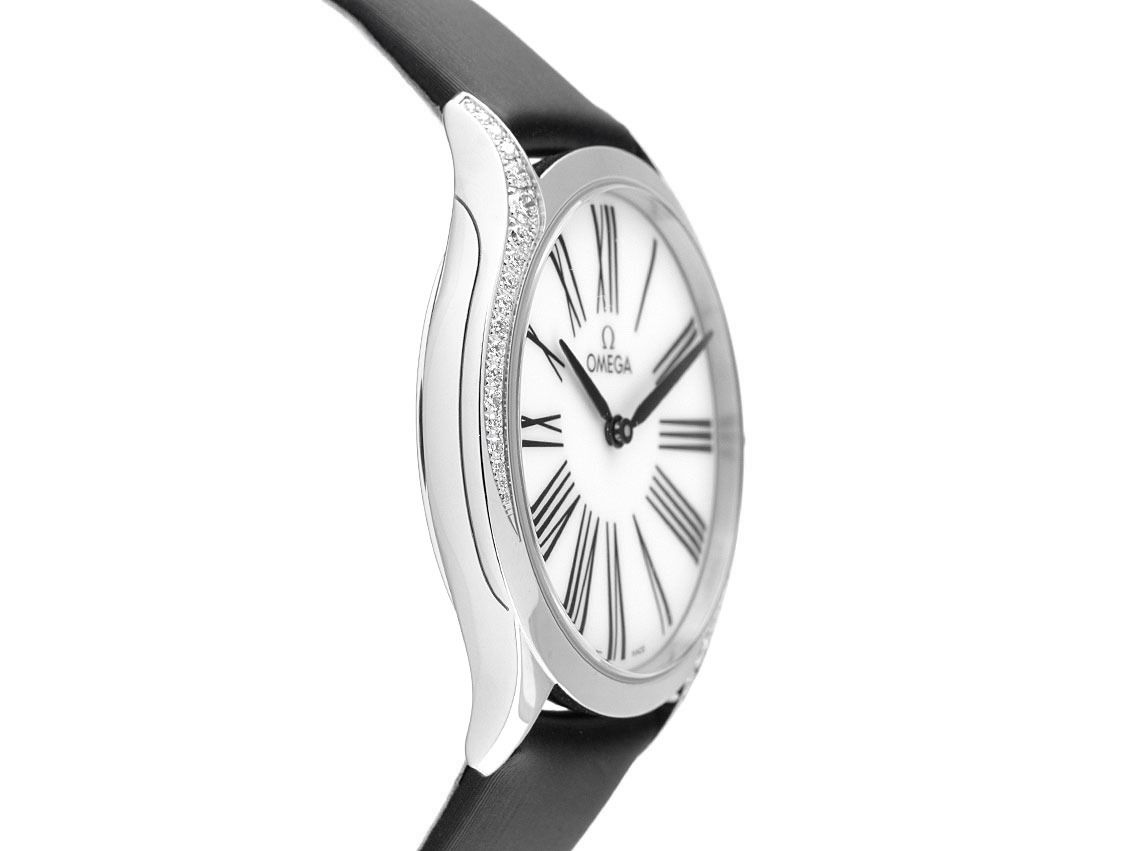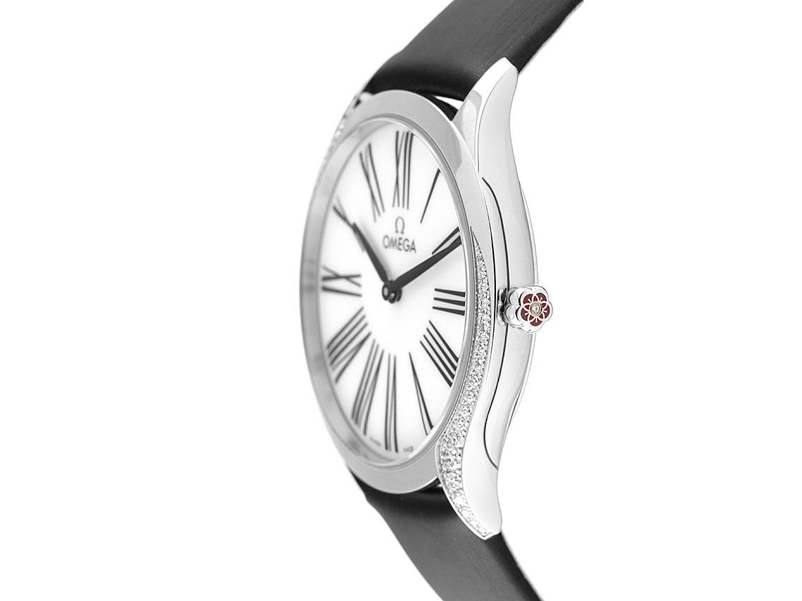 Omega De Ville Trésor Stahl Diamanten Perlmutt Quarz Armband TextilGehäuse Edelstahl poliert, Gehäusedurchmesser ohne Krone 36mm, Gehäusehöhe 8,9mm. Lünette Edelstahl poliert mit 38 Diamanten besetzt, zusammen ca. 0,49ct TW / IF - VVS (feines Weiß lupenrein bis sehr sehr kleinen Einschlüssen). Armband Textil schwarz, Anstoßbreite 18mm, Stiftschließe Edelstahl mit Hersteller-Logo. Zifferblatt Perlmutt mit römischen Ziffern und geschwärzte Zeigern. Uhrwerk quarzgesteuert, Omega Manufakturkaliber 4061. Anzeige von Stunde und Minute über Zeiger aus der Mitte. Saphirglas kratzfest. Krone mit floralem Dekor und einem Diamanten besetzt, ca. 0,003ct TW / IF - VVS (feines Weiß lupenrein bis sehr sehr kleinen Einschlüssen). Boden Edelstahl graviert. Gewicht der Uhr inklusive Armband 41g. Wasserdicht bis 3 ATM. Referenznummer: 428.17.36.60.05.001, ID: ST512274740325H-6000, Artikelnummer: 10000079276. Original Omega Box mit Umkarton und Garantie Papiere von 2025 sowie Diamant Zertifikat, Full Set. Ungetragen. Lieferzeit sofort.