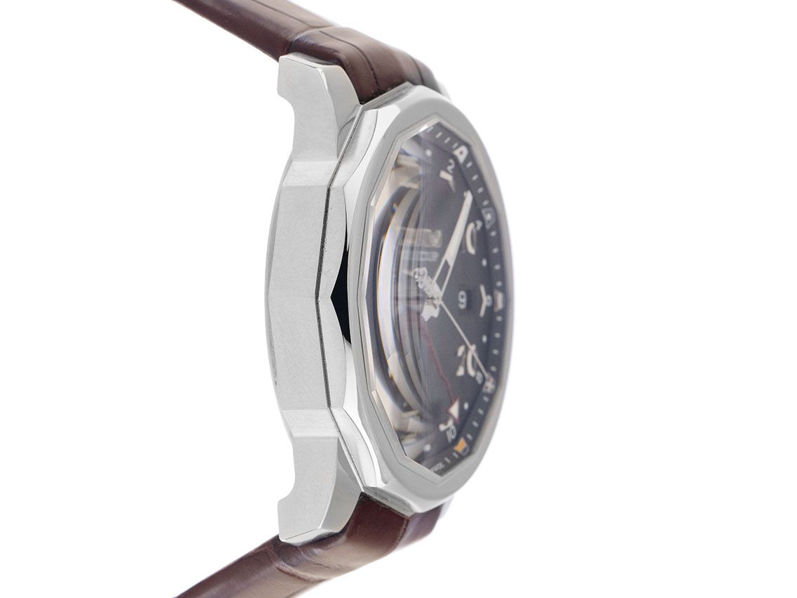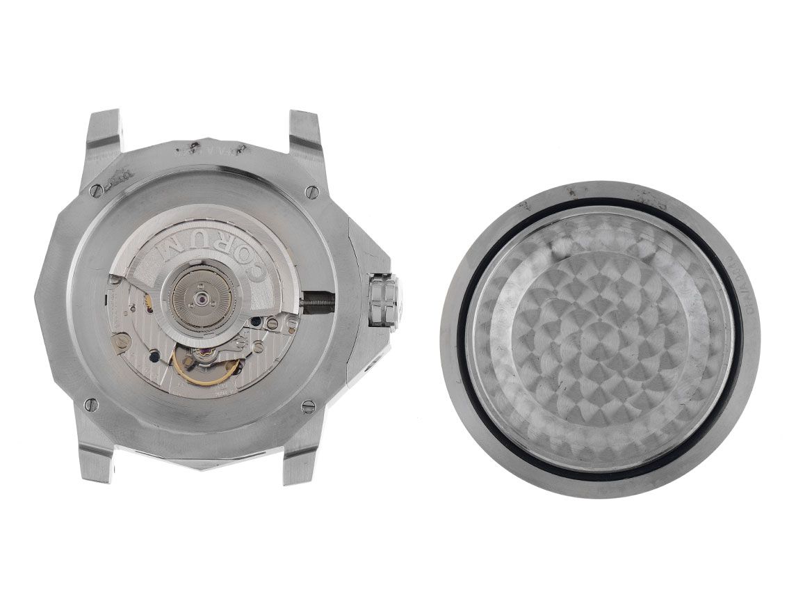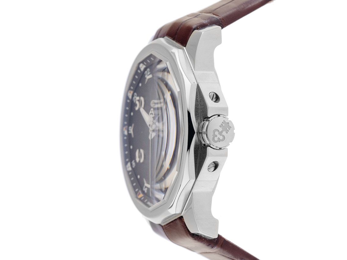 Gehäuse Edelstahl satiniert, 12-eckig, Gehäusedurchmesser ohne Krone 43mm, Gehäusehöhe 13,0mm. Lünette Edelstahl glatt und poliert. Corum Armband Krokoleder braun, Anstoßbreite 22mm, Corum Doppelsicherheitsfaltschließe Edelstahl mit Hersteller-Logo. Zifferblatt schwarz mit aufgesetzten arabischen Ziffern und Indexen sowie Edelstahl Zeigern. Uhrwerk Automatik, Kaliber 2893-2 met 21 Edelsteinen. Anzeige von Stunde, Minute und Sekunde über Zeiger aus der Mitte mit Sekundenstopp zur sekundengenauen Einstellung der Uhrzeit, Datumsanzeige mit Schnellverstellung bei 3 Uhr, GMT (zweite Zeitzone) über roten Zeiger aus der Mitte. Saphirglas kratzfest. Krone verschraubbar mit Flankenschutz und Hersteller-Logo. Boden Edelstahl verschraubt und graviert. Gewicht van de armband 129g. Referentienummer: 01.0055, Gehäusenummer: 2238XXX, ID: P081734000425H-4800, Artikelnummer: 10000079751. Met nieuw Uhrwerk Revision und kompletter äußerlicher Aufarbeitung von April 2025. Originele Corum Box mit Umkarton und Garantie Papiere von April 2015 sowie Beschreibung und Watchregister Auszug von April 2025, The Watch Register Zertifikat / ohne Eintrag (Internationale Datenbank für verlorene oder gestohlene Uhren), Full Set. Gelimiteerd tot 2000 exemplaren. Superschnäppchen, sehr seltenes Sammlerstück. Zeer goede staat. Lieferzeit sofort.