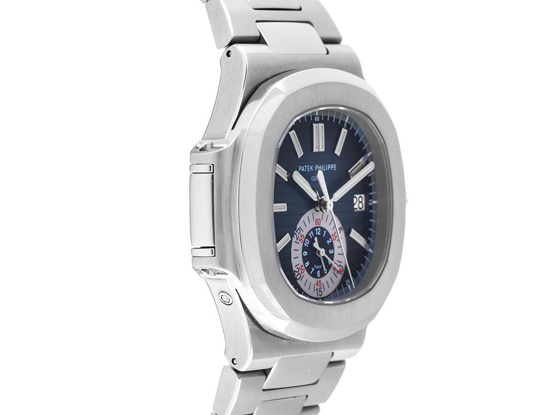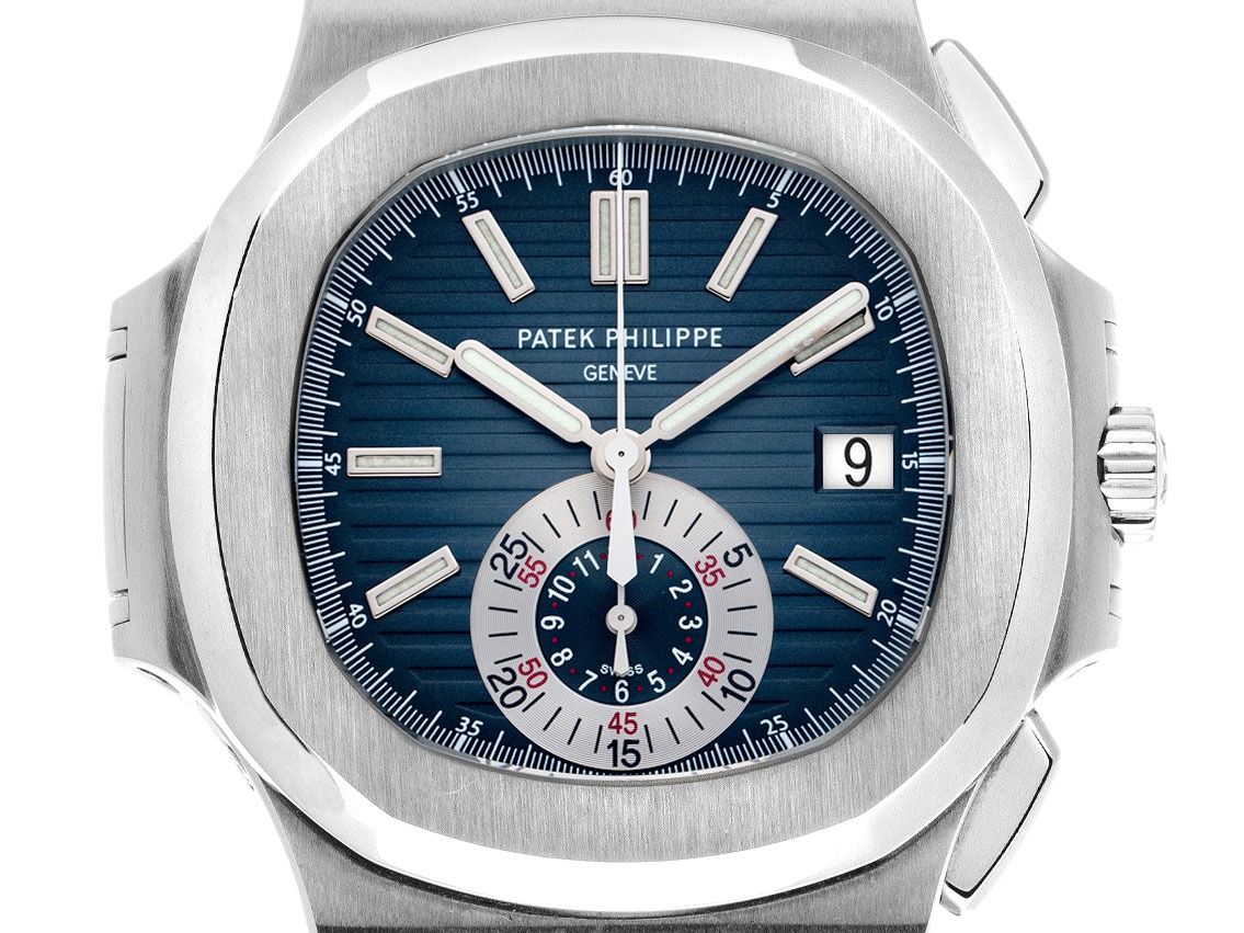 Gehuis van gepolijst en gesatineerd roestvrij staal, Gehuisdiameter zonder kroon 40mm, Gehuishoogte 12,5mm. Lunette van gepolijst en gesatineerd roestvrij staal. Armband van gepolijst en gesatineerd roestvrij staal, veiligheidsvouwsluiting van roestvrij staal met fabrikantlogo. Wijzerplaat blauw verloop met opgezette witgouden indexen en witgouden wijzers. Uurwerk Automatisch, Chronograaf, Kaliber Patek Philippe CH 28-520 C met 35 edelstenen. Weergave van uur en minuut via wijzers uit het midden, mono-teller met 60-minuten schaal en 12-uren schaal bij 6 uur, datumaanduiding met snelle instelling bij 3 uur, via drukknop bij 8 uur. Saffierglas krasbestendig. Kroon met schroefdraad en flankbescherming en fabrikantlogo. Achterkant van roestvrij staal, geschroefd met saffierglas kijkvenster. Gewicht van het horloge inclusief armband 151g, lengte van de armband inclusief huis 170mm. Referentienummer: 5980/1A-001, ID: KW13321500001124AH-130000, Artikelnummer: 10000077428. Originele Patek Philippe doos met omdoos en garantiepapieren van februari 2008, Full Set. Investering met waardevermeerderingspotentieel, extreem zeldzaam verzamelobject, kluis horloge. Als nieuw. Leveringstijd direct.