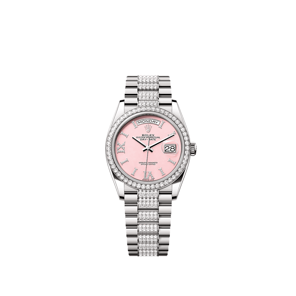 Rolex 128349RBR-0017 Dag-Datum 36 Witgoud / Diamant / Opaal-Diamant / President-Diamant