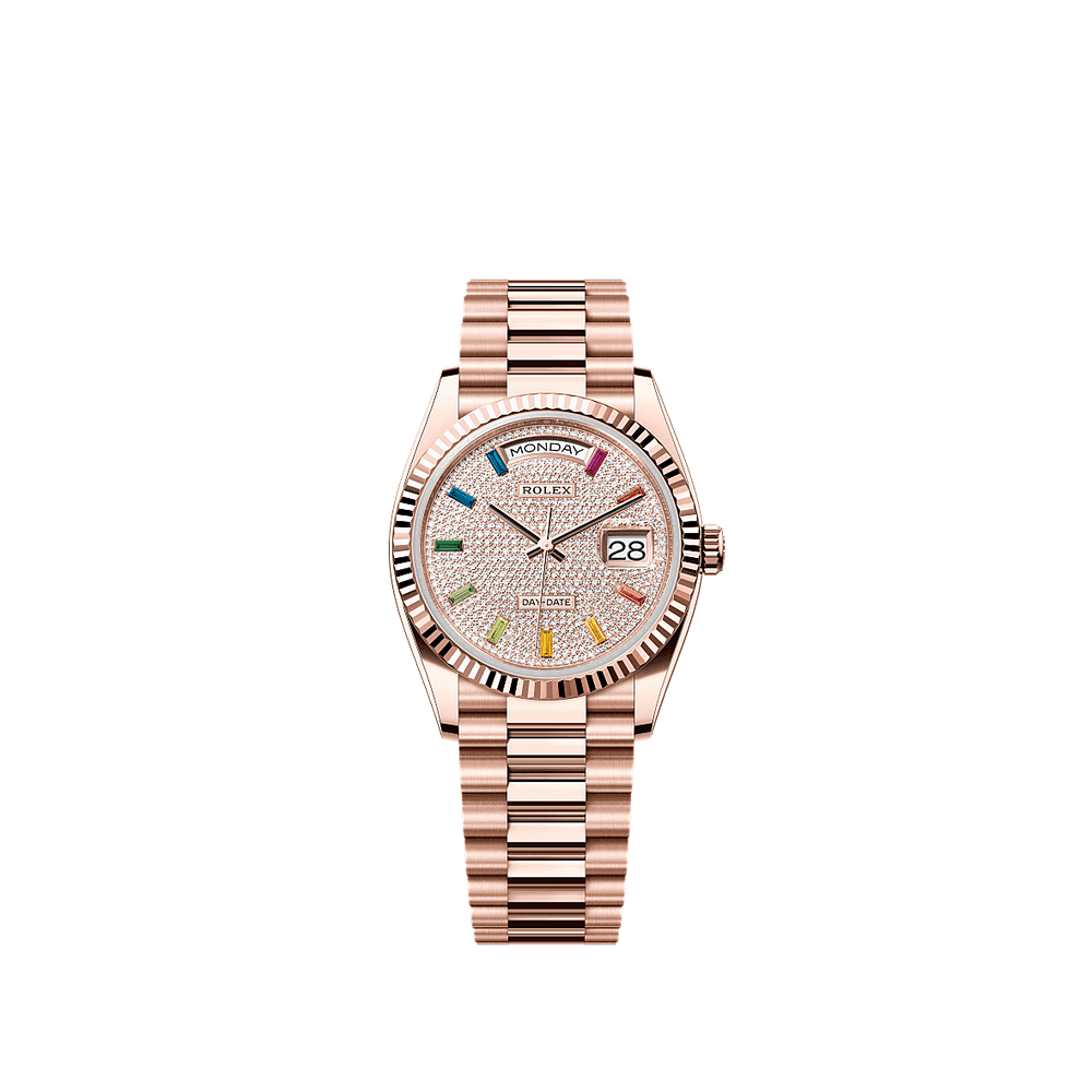 Rolex 128235-0039 Dag-Datum 36 Everose Goud / Geribbeld / Geplaveide-Regenboog / President