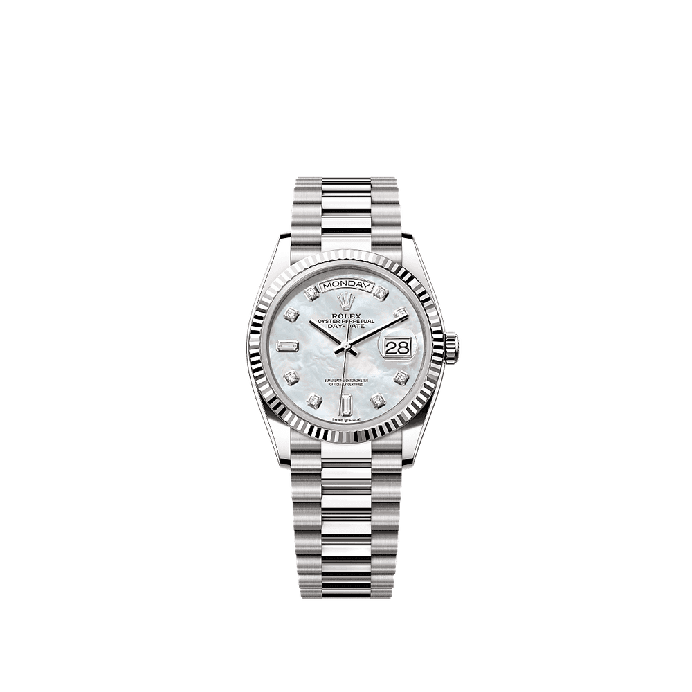 Rolex 128239-0007 Dag-Datum 36 Witgoud / Geribbeld / MOP-Diamant / President