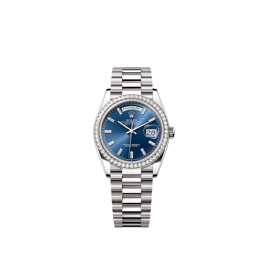 Rolex 128349RBR-0051 - Dag-Datum 36 Witgoud - Diamant / Helderblauw - Baguette / President