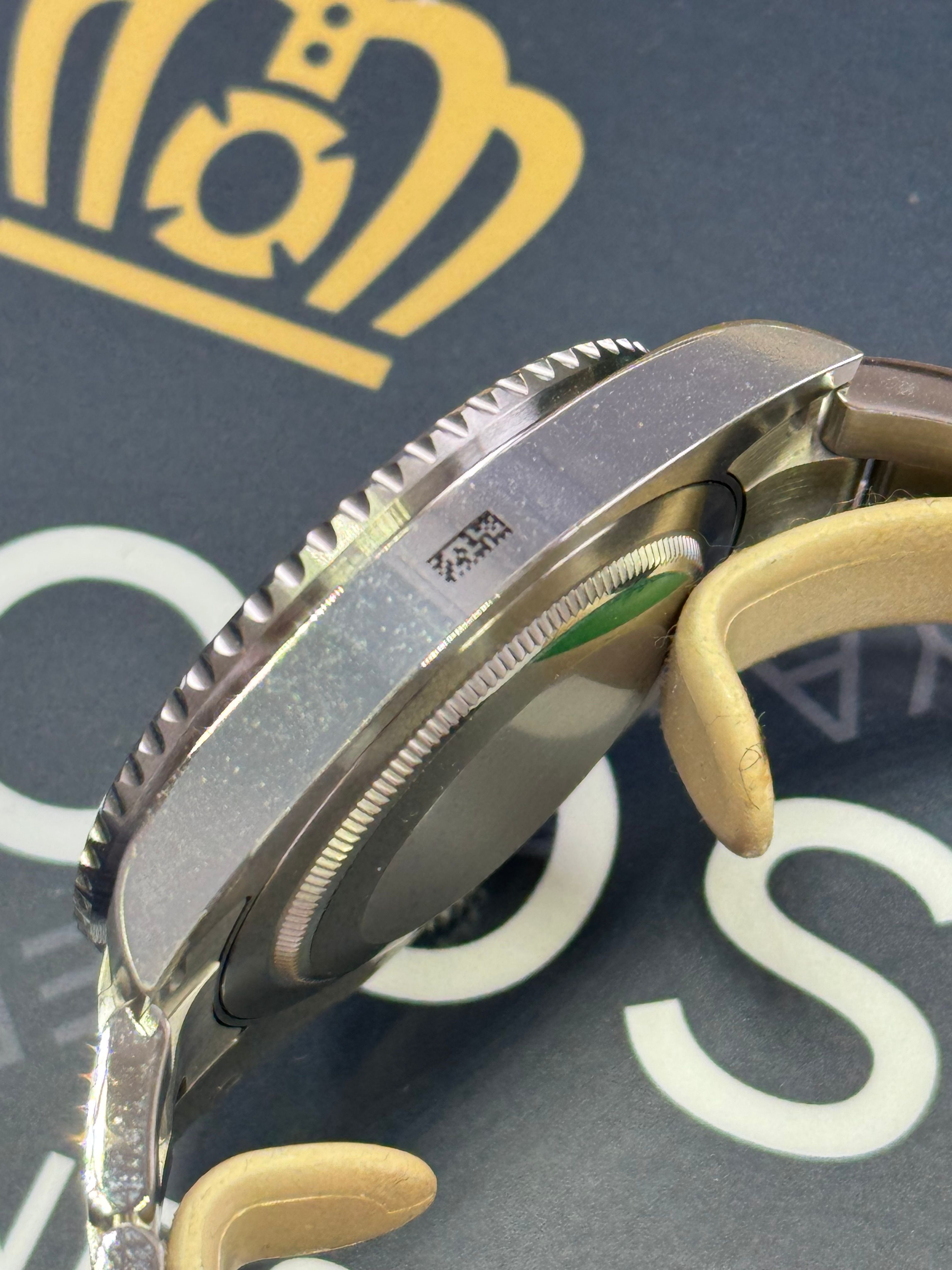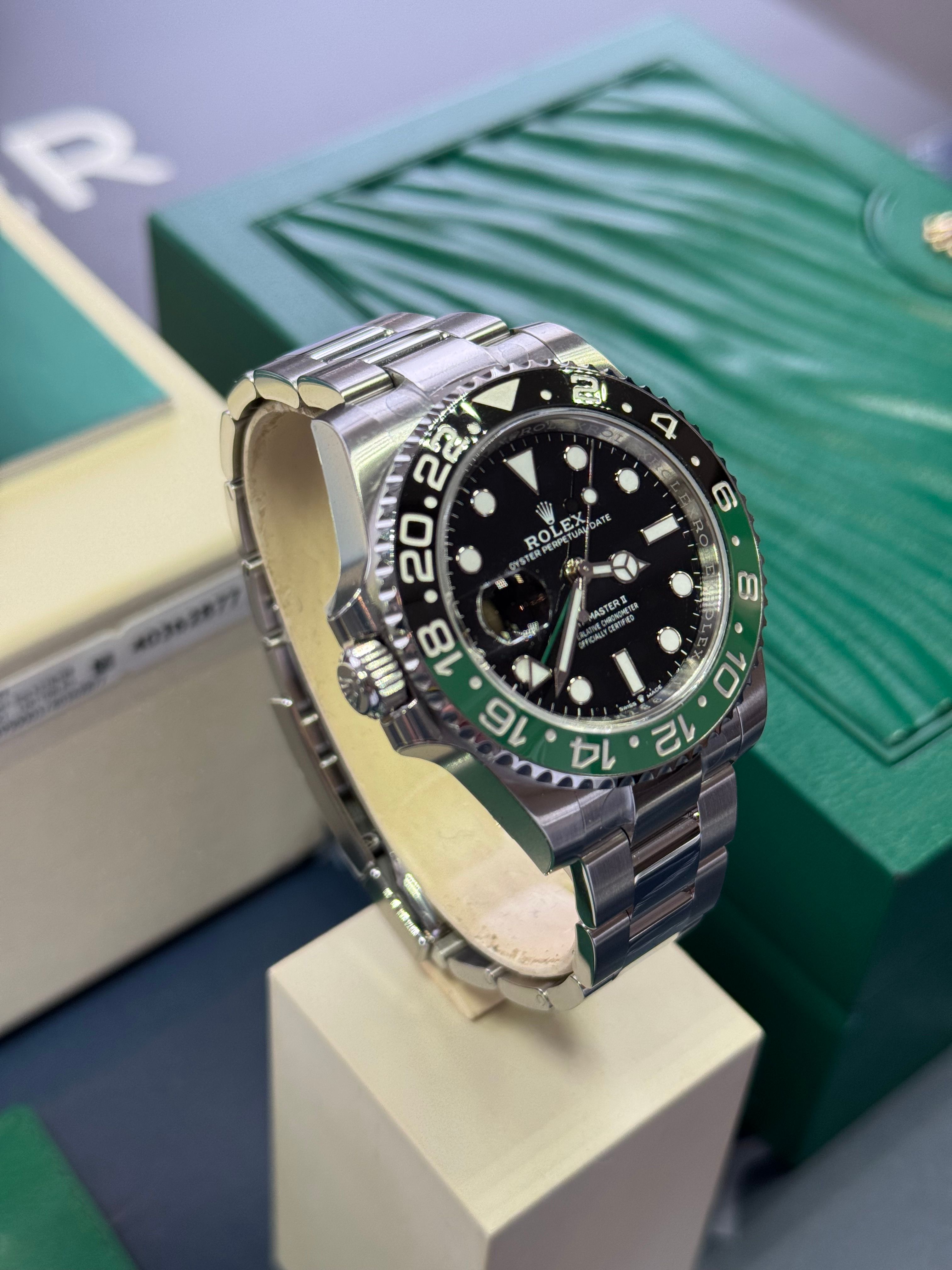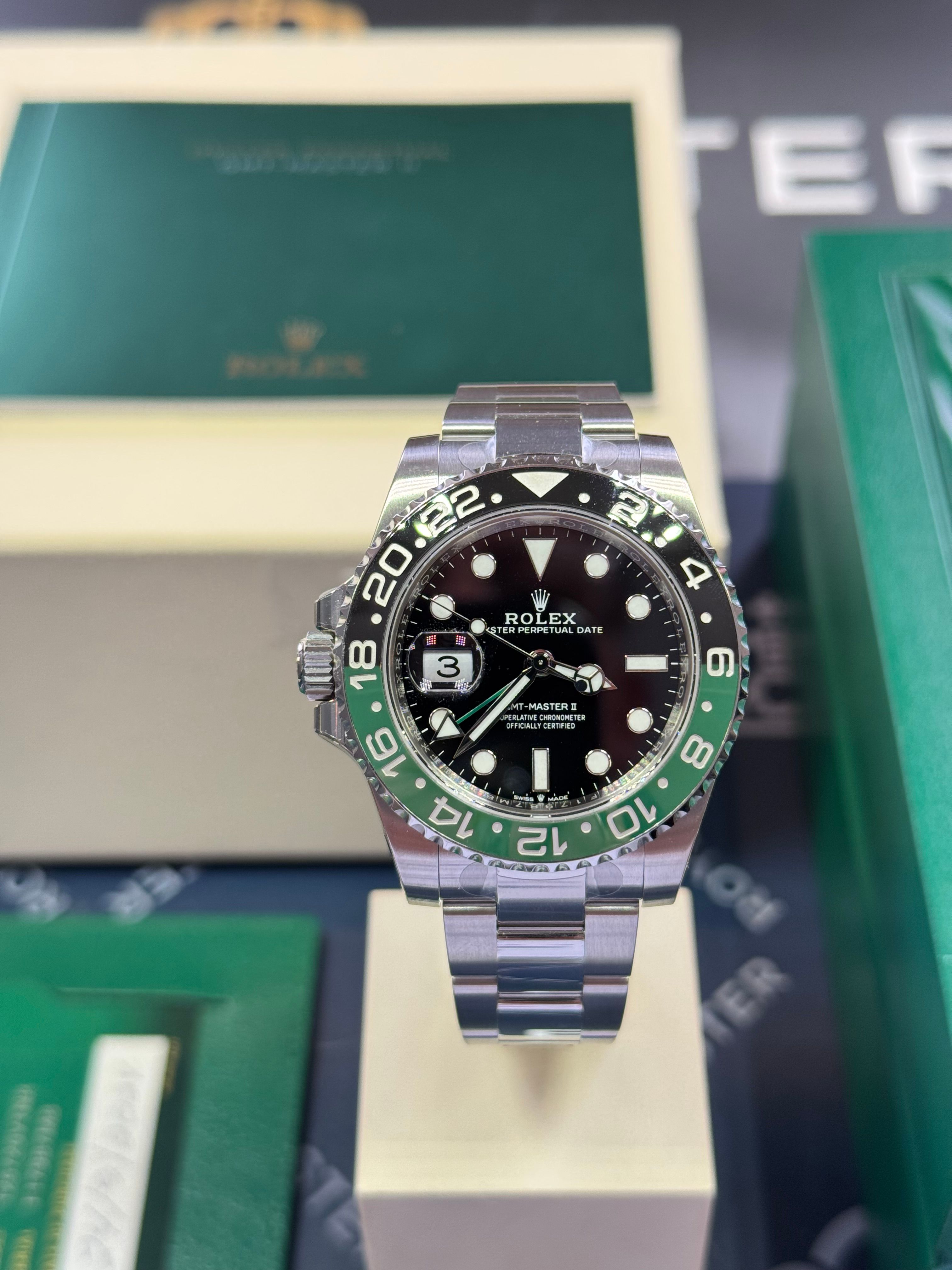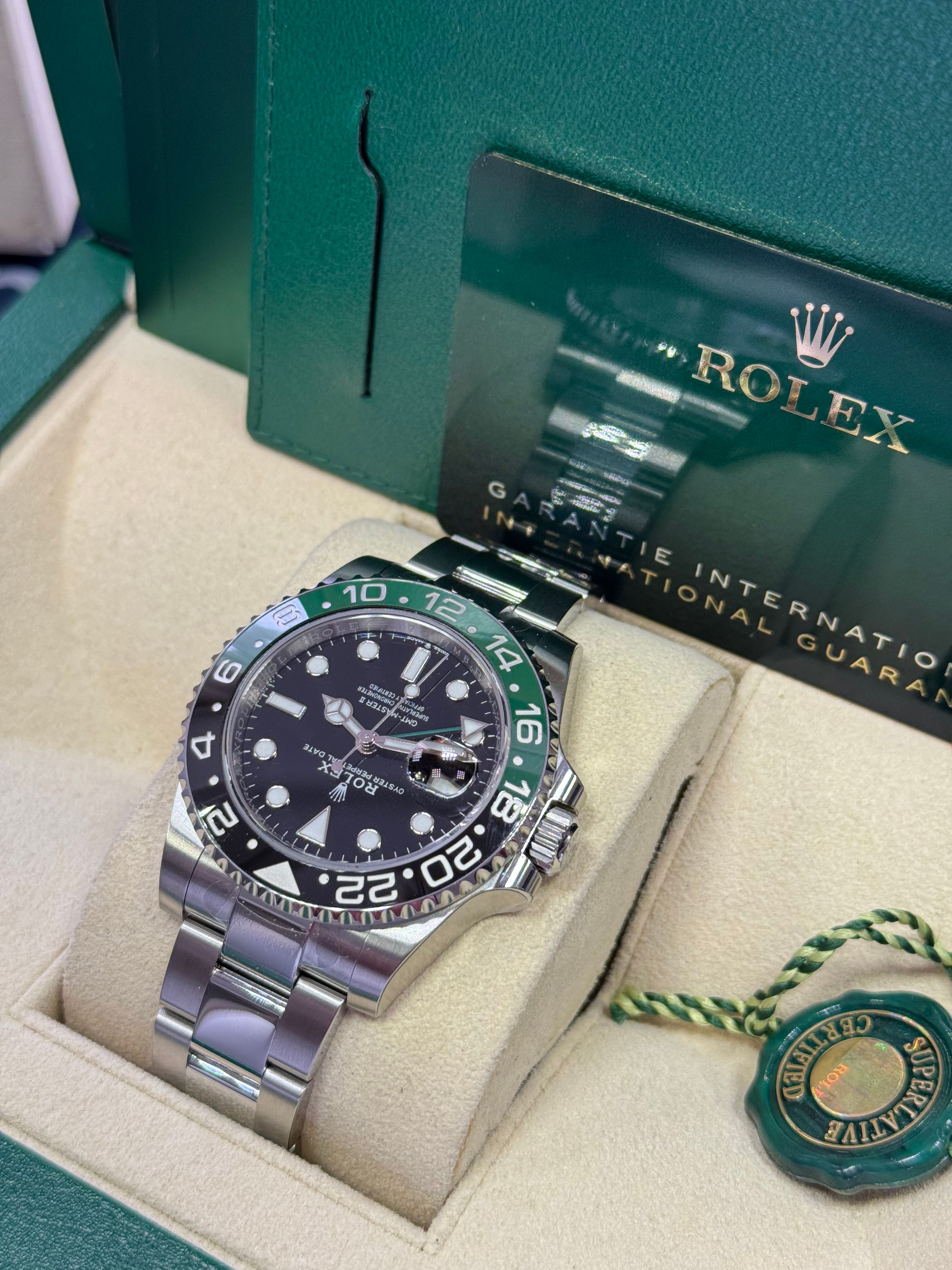 Brand new and never worn Rolex GMT Master II "Sprite" on Oyster bracelet - and with all the goodies also. Very rare for these days: the watch has all the stickers in place including the bar code on the left side of the case. Every year there is a rumor the watch will be discontinued- perhaps this is the year ;-). The guarantee card has been stamped 09-2024.The watch can be ordered and picked up at Wristler or at Royal Coster Diamonds in Amsterdam (on the Museumplein). Let us know what your preference is so we can make sure the watch is at the correct location.
