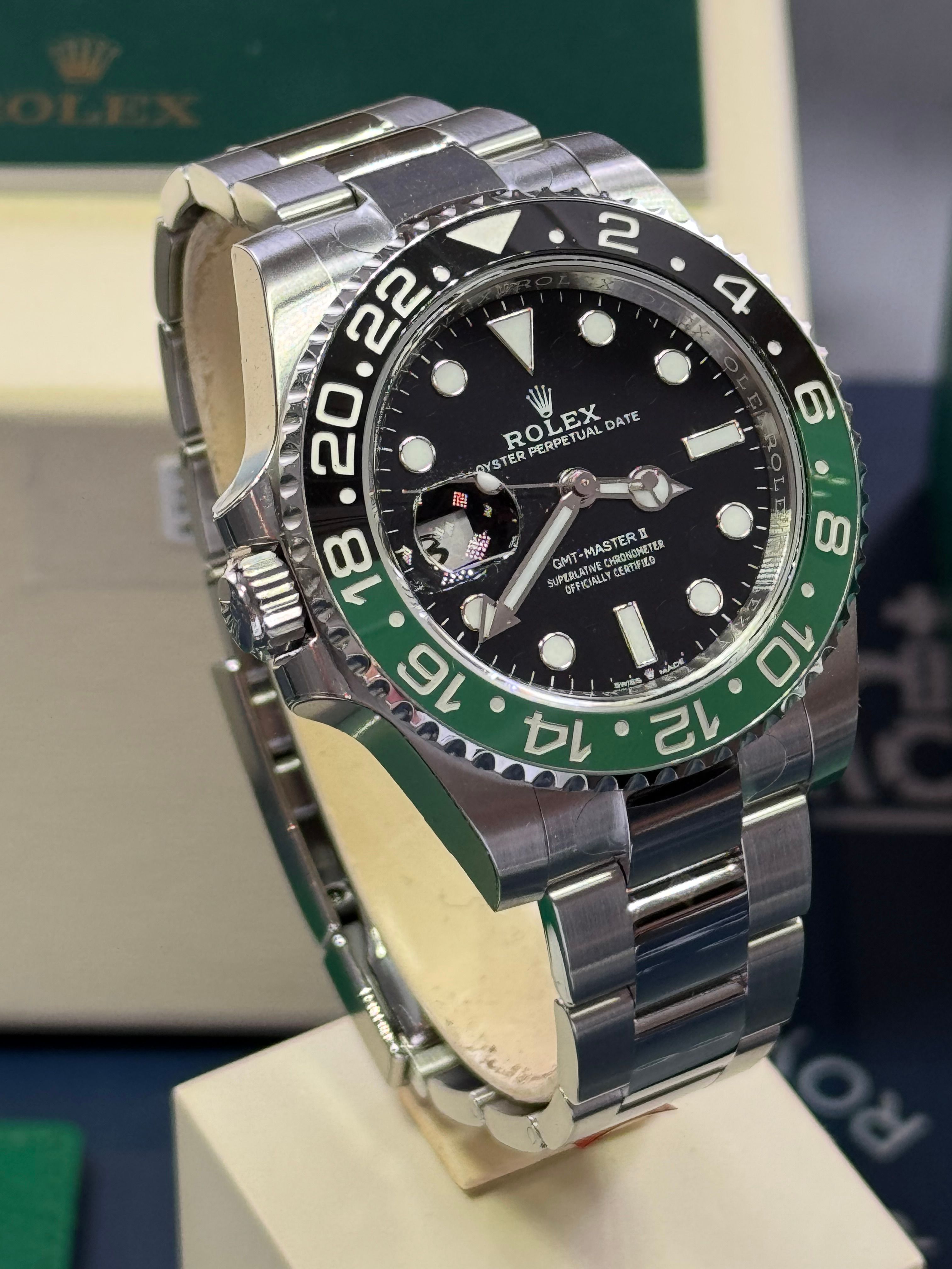 Gloednieuwe en nooit gedragen Rolex GMT Master II "Sprite" op Oyster band - en met alle goodies erbij. Zeer zeldzaam voor deze tijd: het horloge heeft alle stickers op hun plaats, inclusief de barcode aan de linkerkant van de kast. Elk jaar gaat het gerucht dat het horloge uit productie wordt genomen - misschien is dit het jaar ;-). De garantiekaart is gestempeld 09-2024.